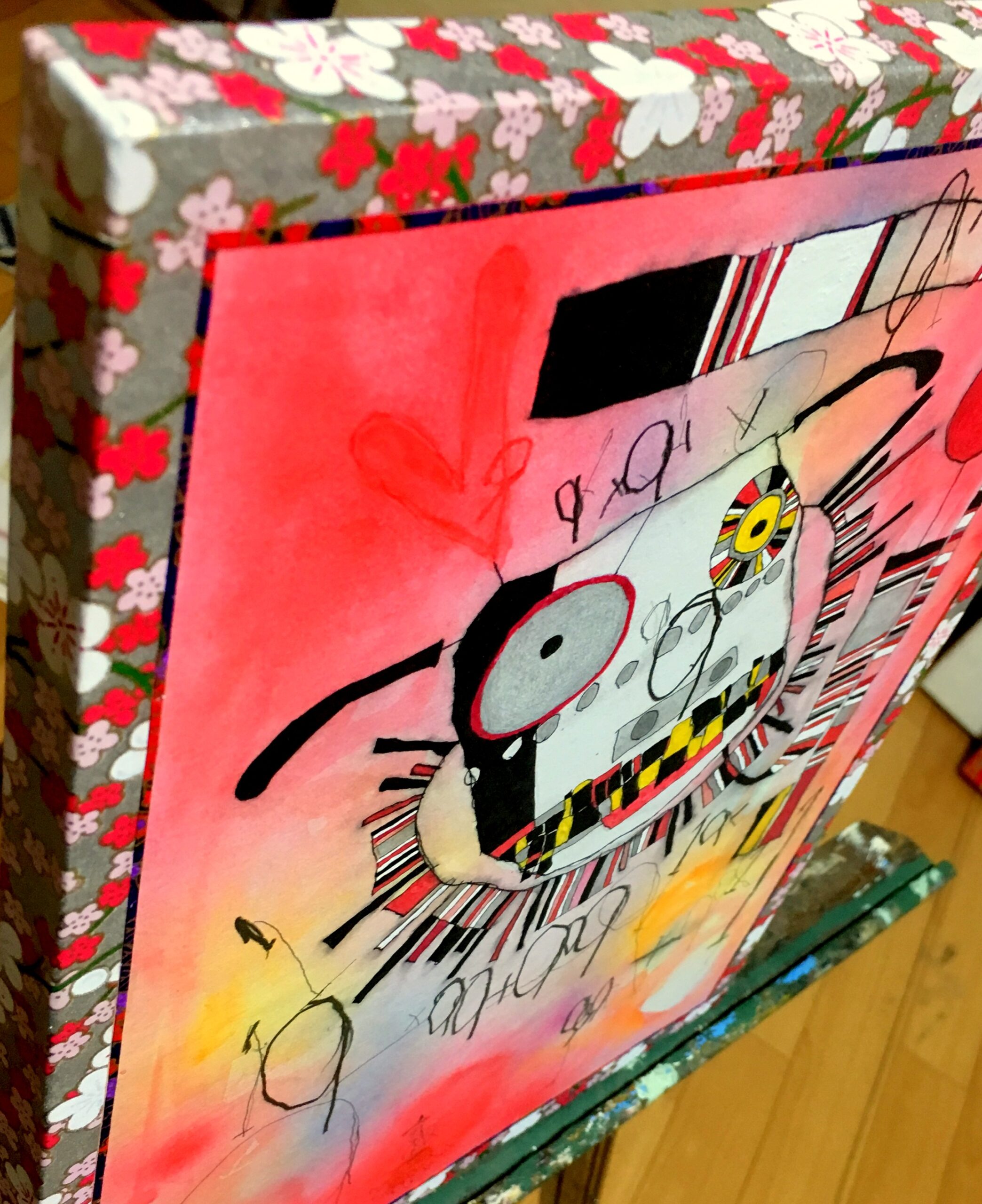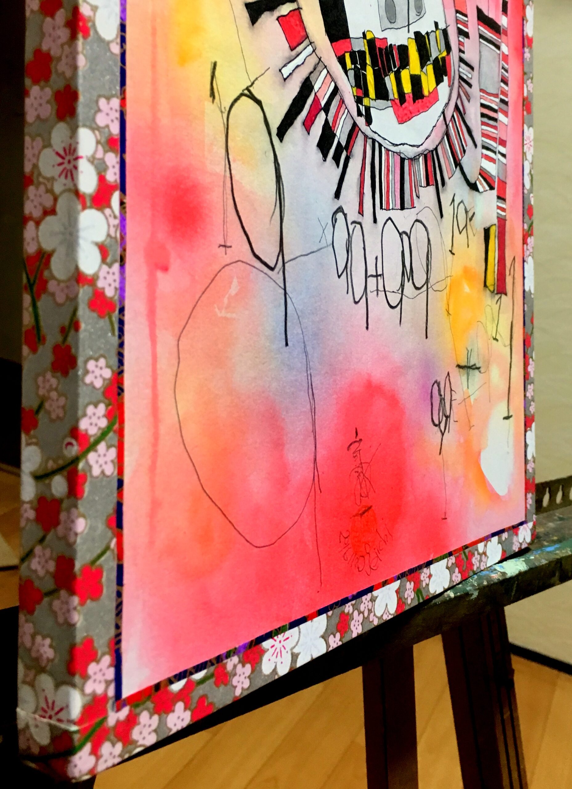 牛みたいな生き物と、「9」と「1」がモソモソしている感じ。数字との組み合わせのシリーズのうちの一点です。作品周りは友禅和紙で和装に仕上げています。 販売価格+2000円で、裏蓋・吊り金具をお付けいたします。