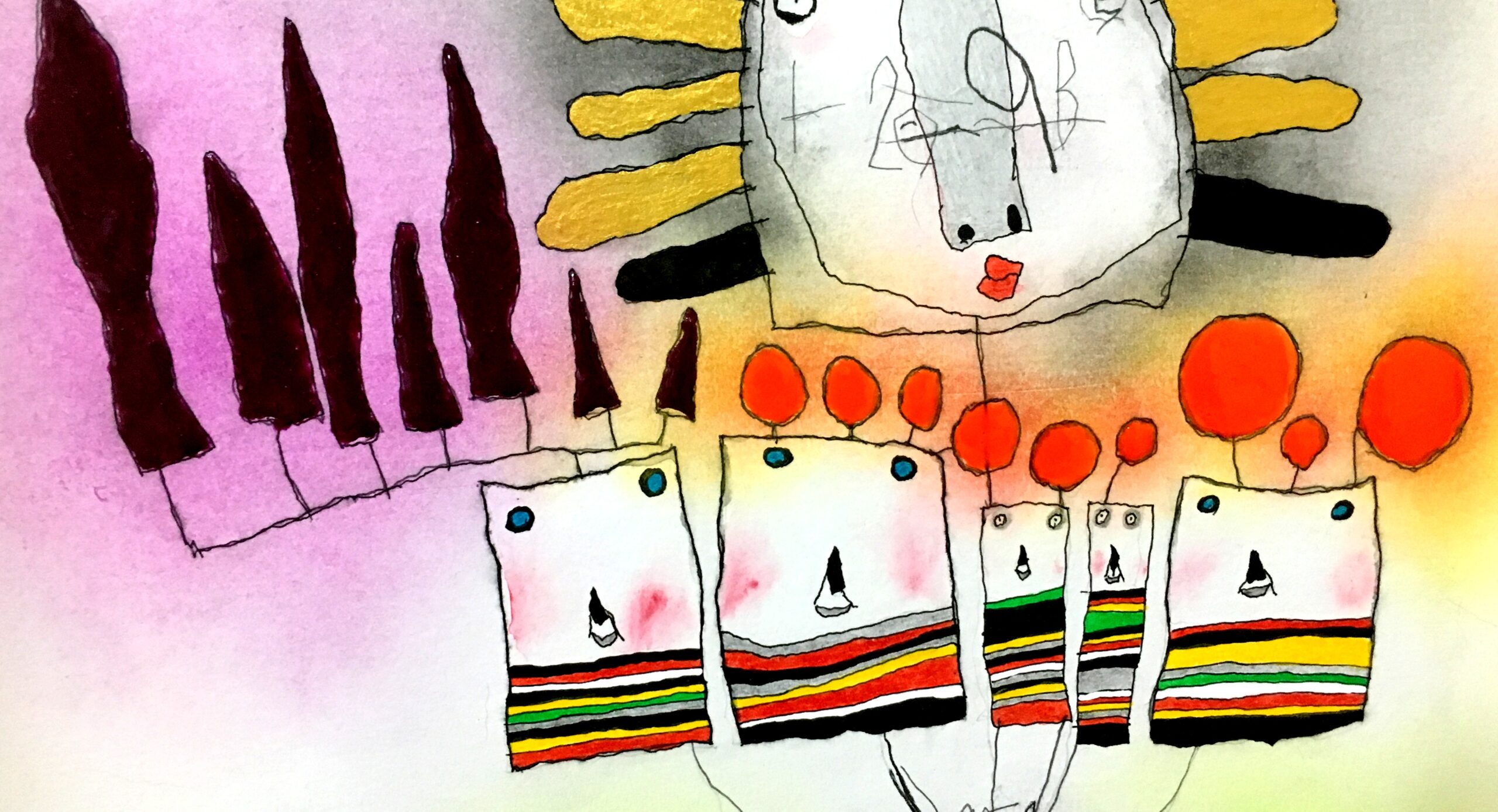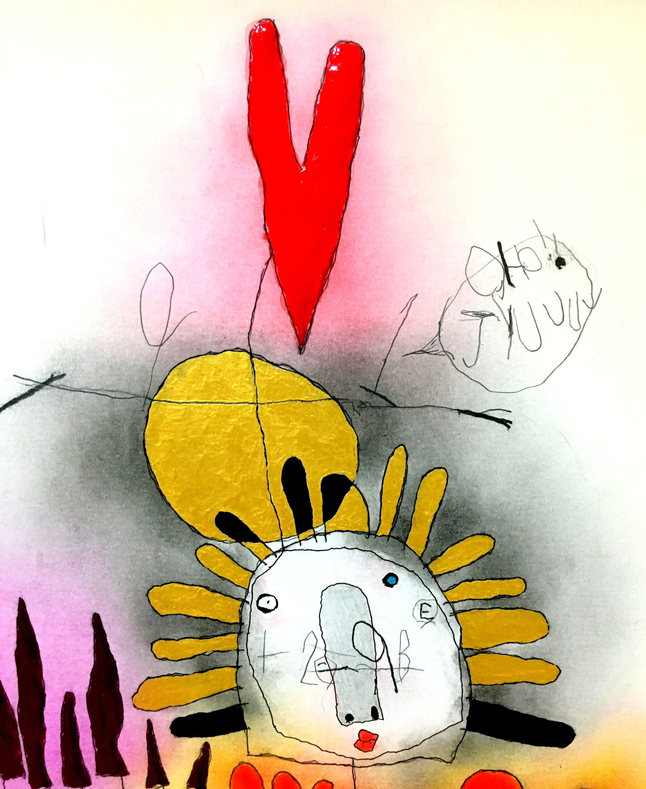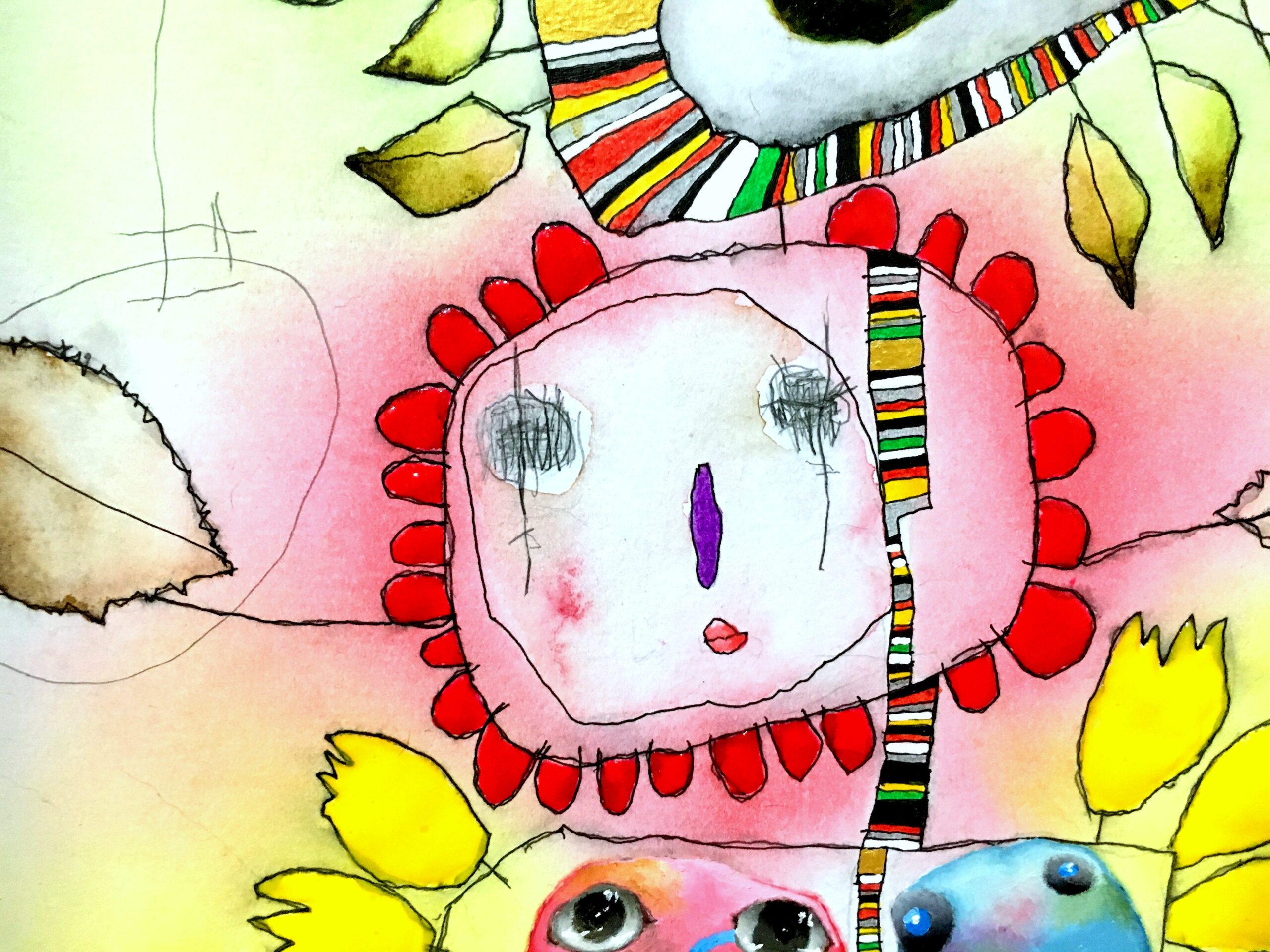 「花」が重なって、お重になっています。いろんな表情の花たちが縦一列に並んで咲いている。 よく「どんな意味があるの?」とか聞かれますが、意味なんてない方が面白くないですか?この作品は”ノリ”で作りました。どの部分にどんな意味があるのかは、見た人が勝手にイメージして楽しんもらえたら良いと思うのです。 音楽の様に描きます。例えばクラシックで色んな楽器のいろんなパートがある様に、油彩が強い所、水彩が強い所、数字の落書きのソロ・・みんなでハーモニーを作ろうとしています。この作品を楽しんで見て下さる方の中に、素敵な音楽が奏でられますように(^^)v