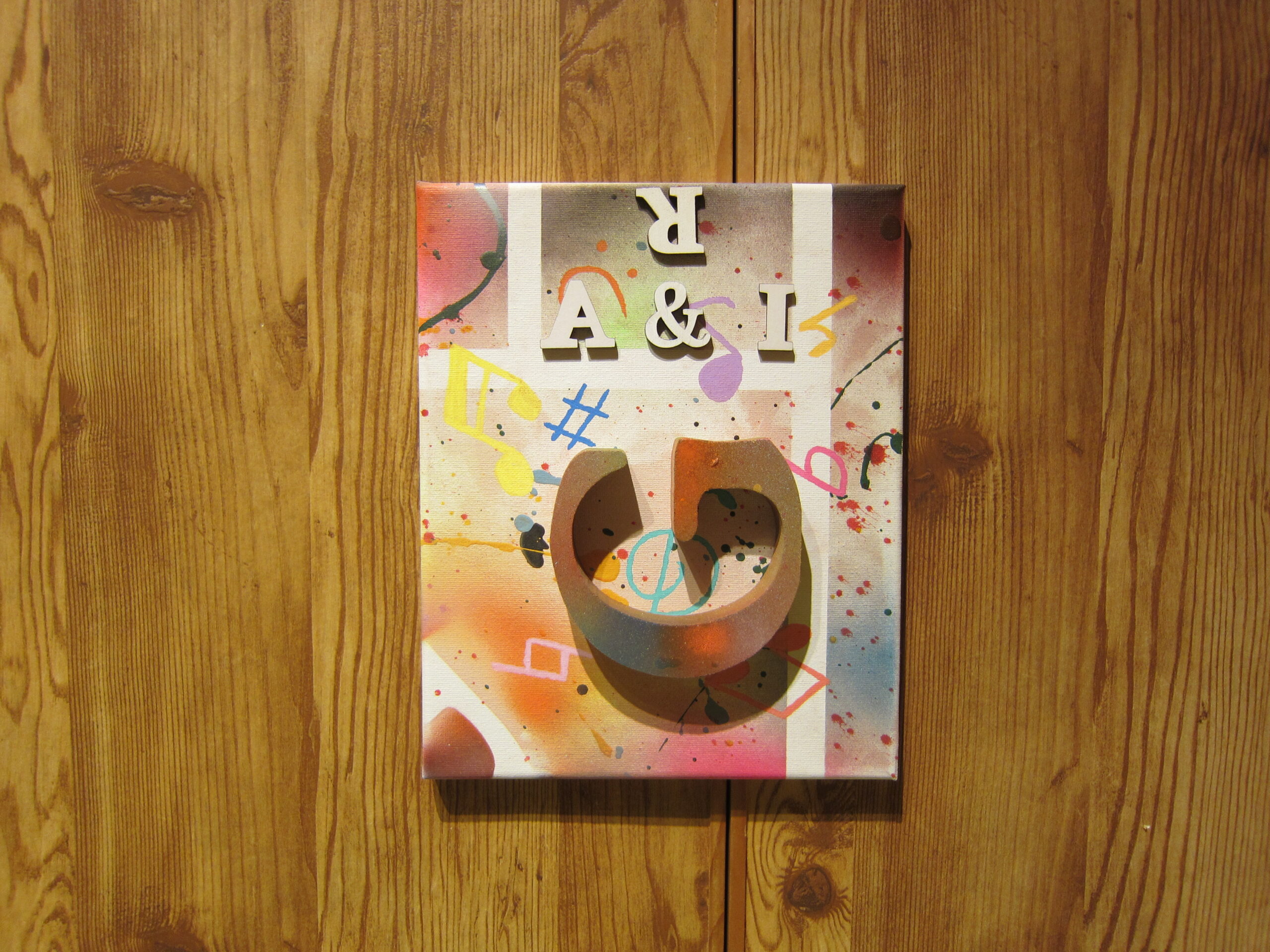 ※作品により異なりますがこのシリーズはキャンバス・木材・ロウ・スプレー・アクリル絵の具・マーカー・ペイント・折り紙・鋲などを使用しています