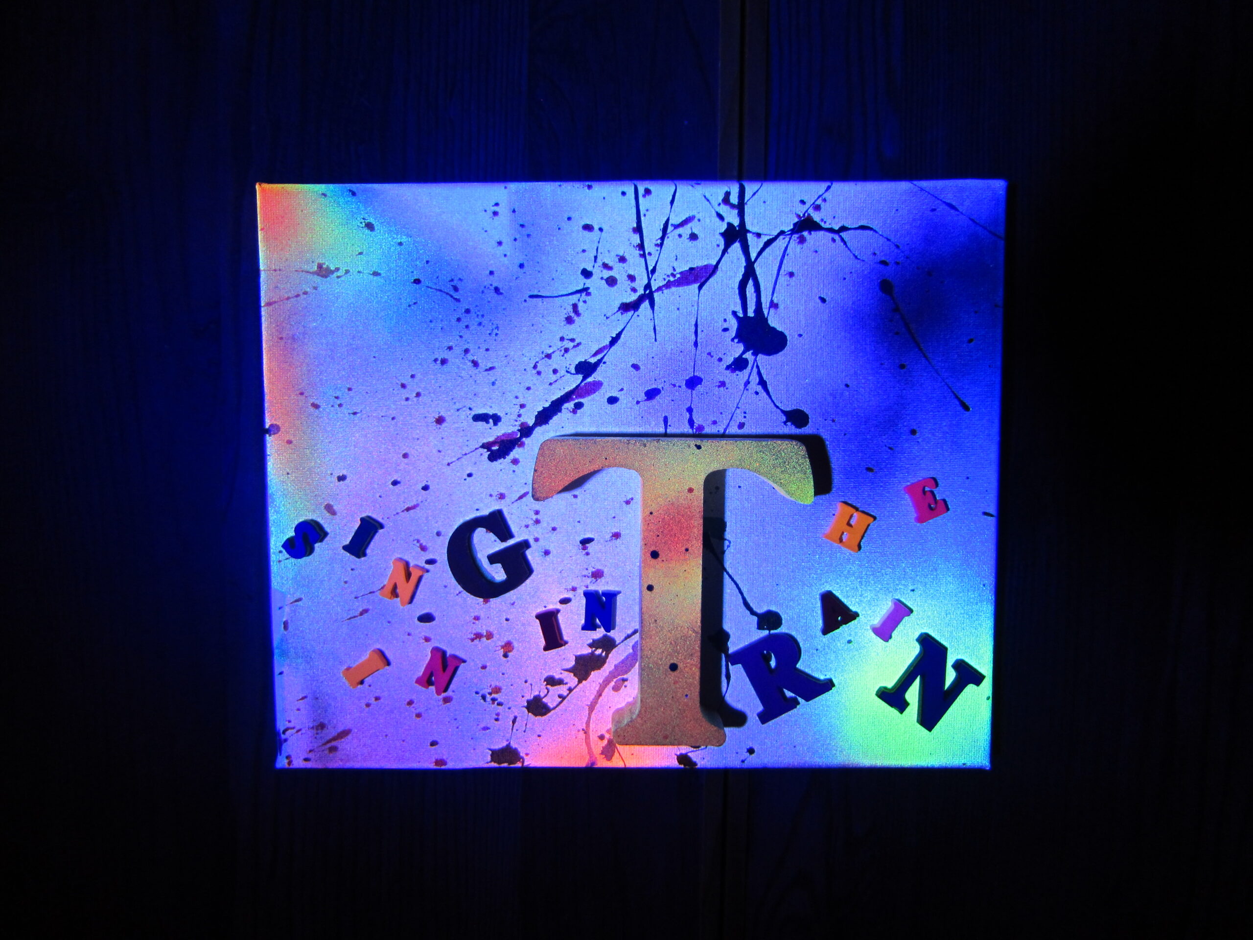 TAP=蛇口 この絵を見ているときにキャンバスが雨に、Tのアルファベットが傘に見えてきたので映画「SINGIN’ IN THE RAIN」の名場面をイメージした作品に仕上げました