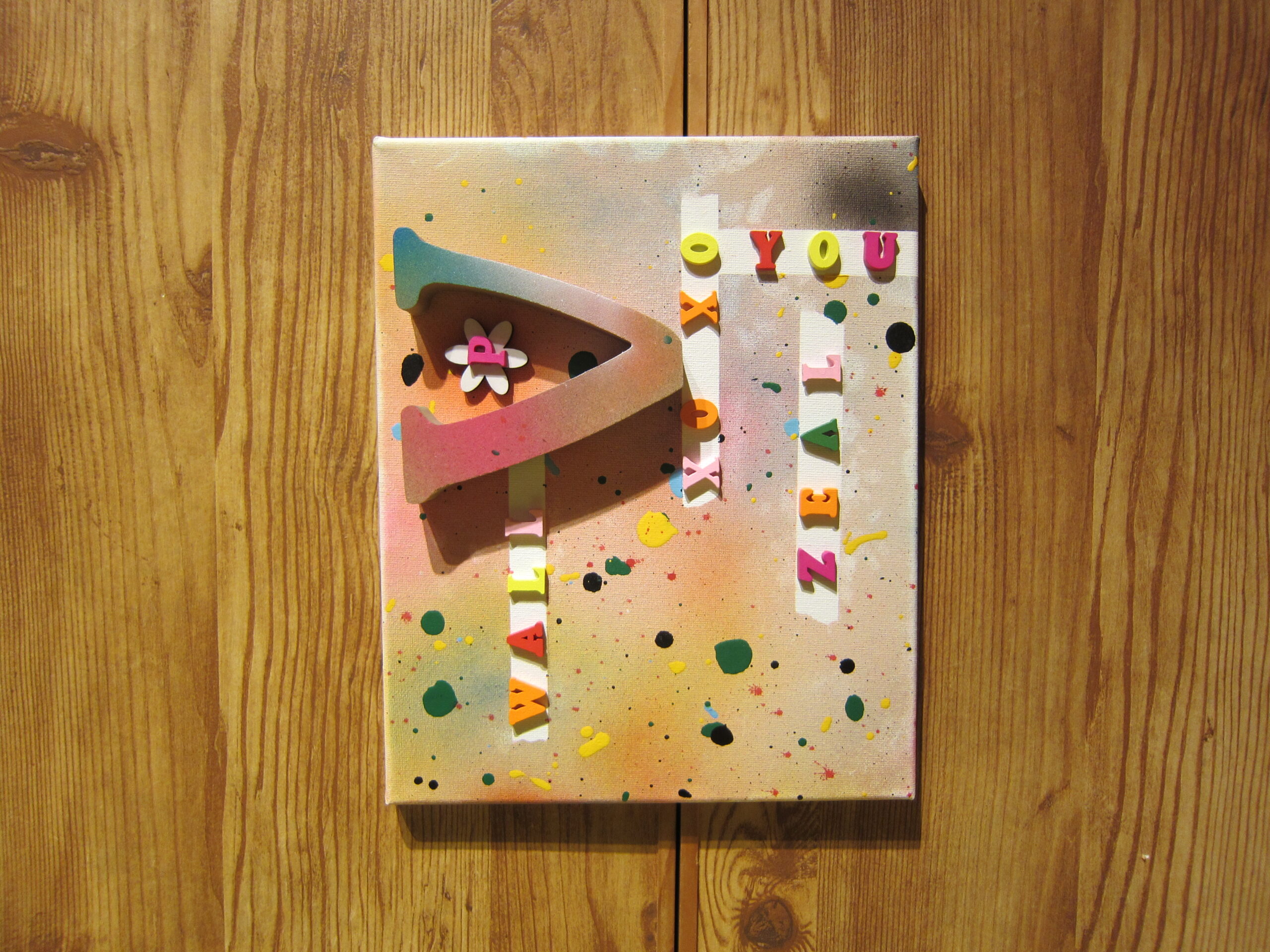 ※作品により異なりますがこのシリーズはキャンバス・木材・ロウ・スプレー・アクリル絵の具・マーカー・ペイント・折り紙・鋲などを使用しています