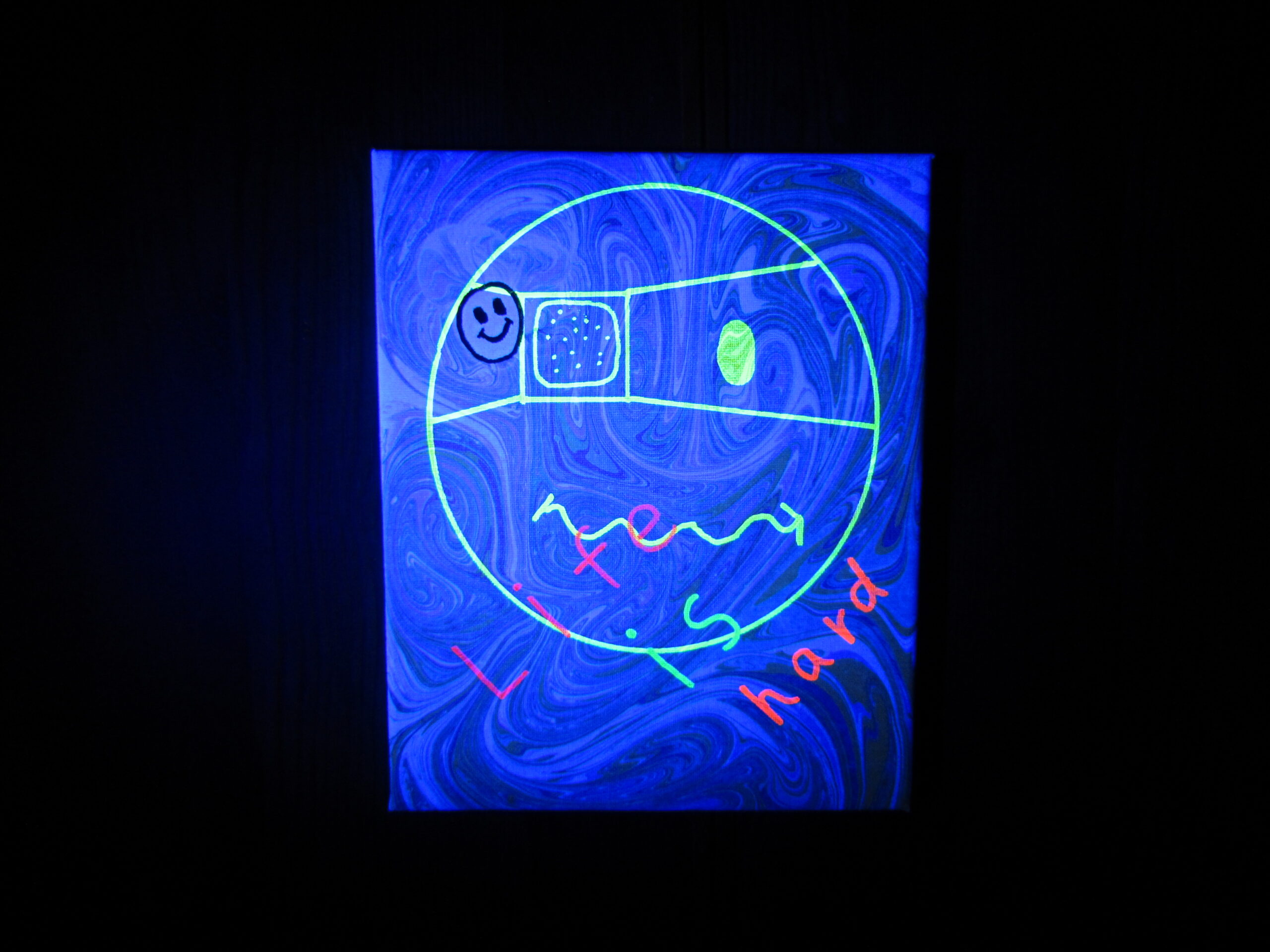 明るいところではニコちゃんマークが笑顔でニコニコですがブラックライトを当てると・・・って感じの作品です