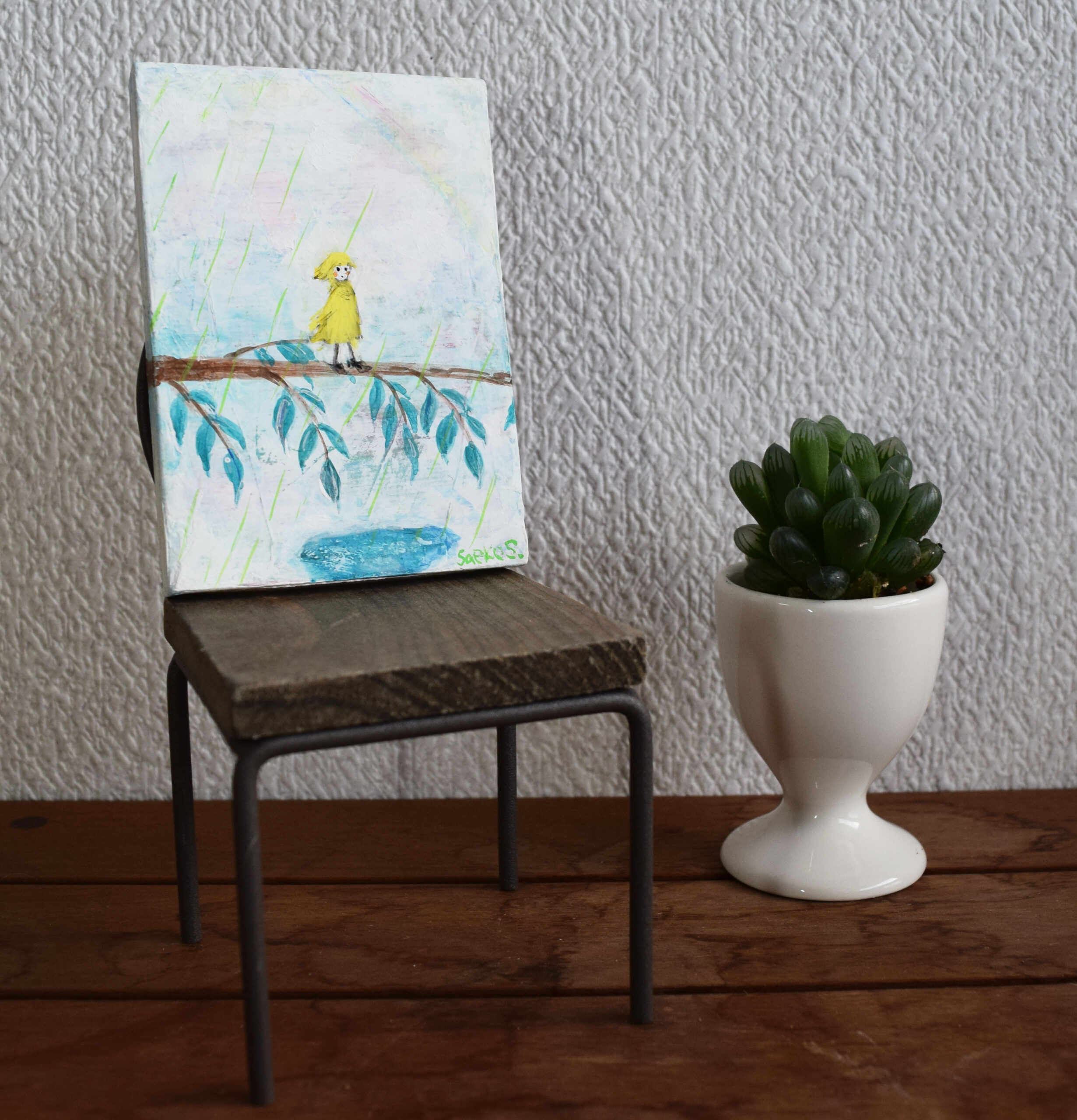 ミニキャンバスにアクリルガッシュで描いていて表面はマットな仕上がりです。側面にも描かれていますので額装なしでそのまま飾っていただけます。小さくて軽いので画鋲でも大丈夫です。様々なスペースに気軽に置くことができます。
