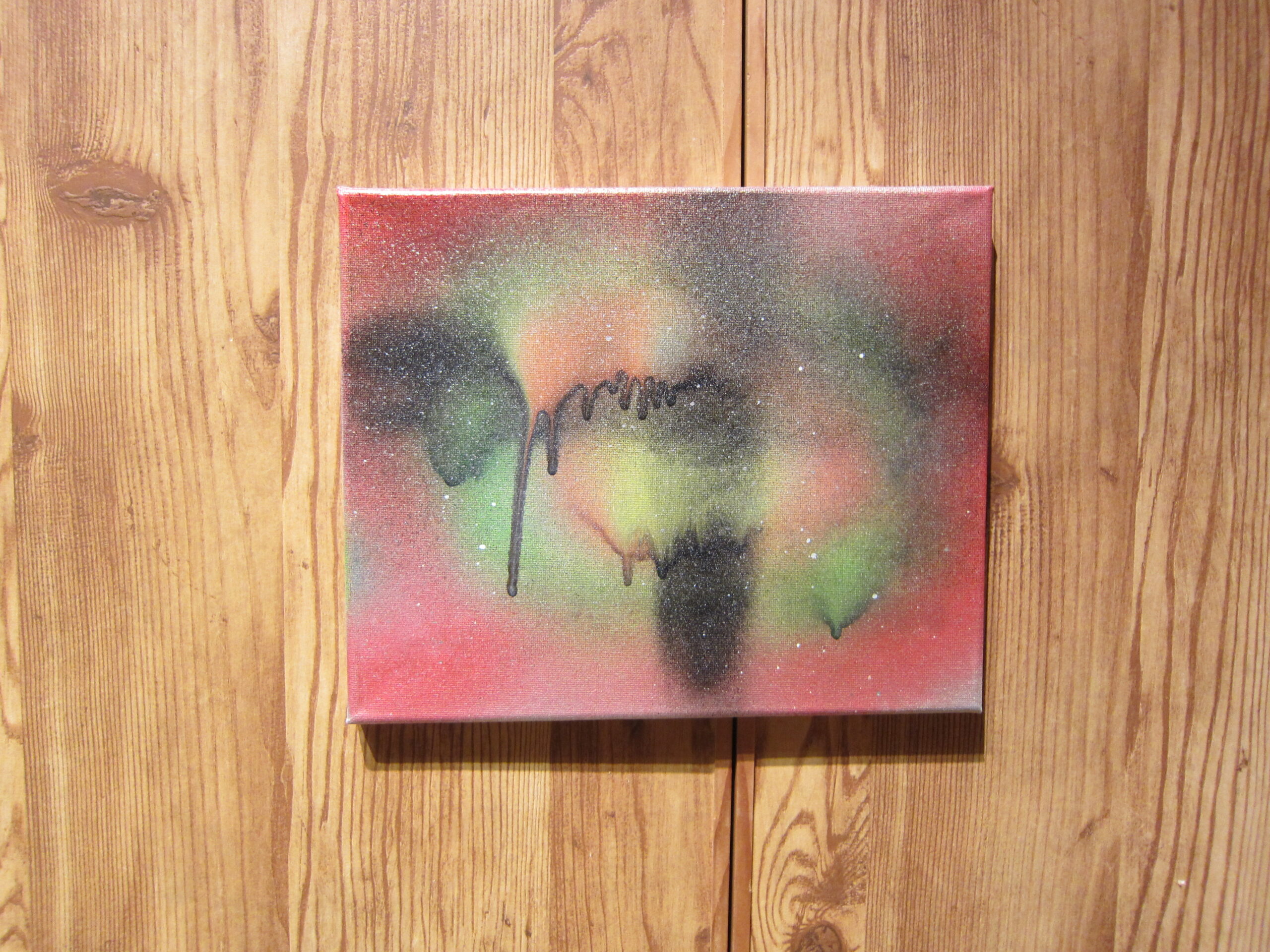キャンバス全体が空に現れるオーロラを表していて、中央部分の上下に前後する垂れたような模様は心電図の波形を表しています