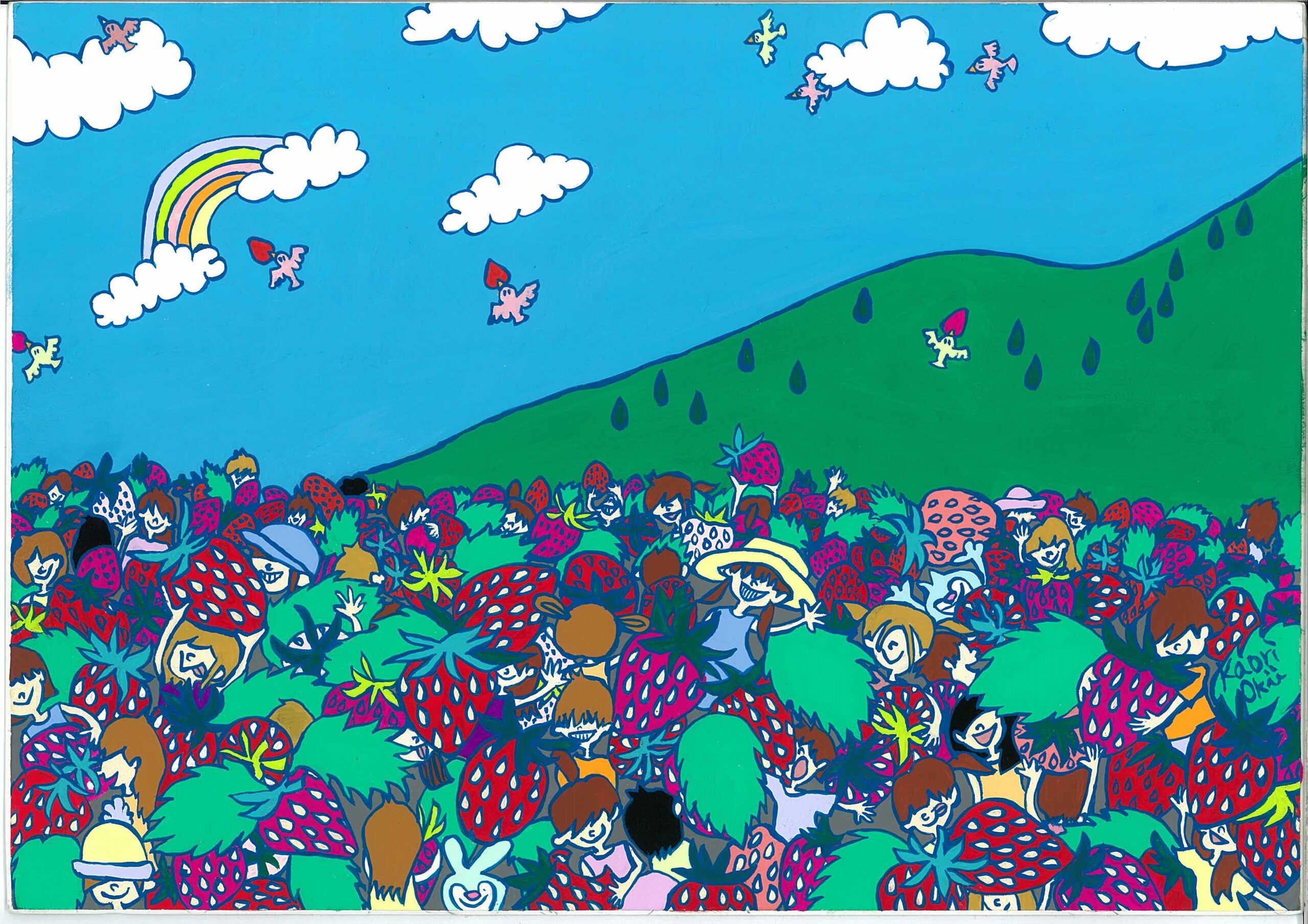 みんながわくわく楽しい苺狩りの情景です。どこかに自分を探してみたり、隠れている人を見つけて楽しんでほしいです。