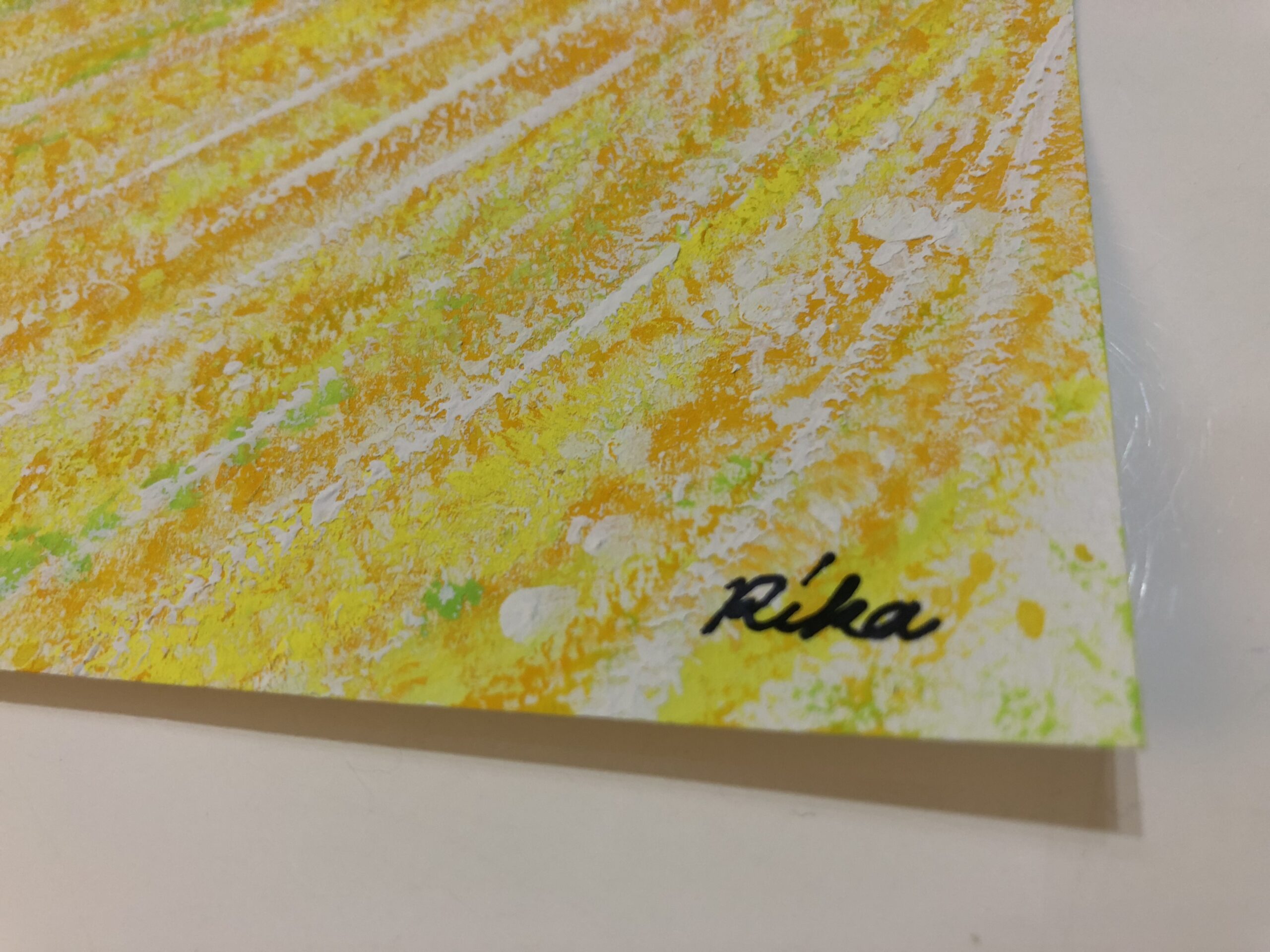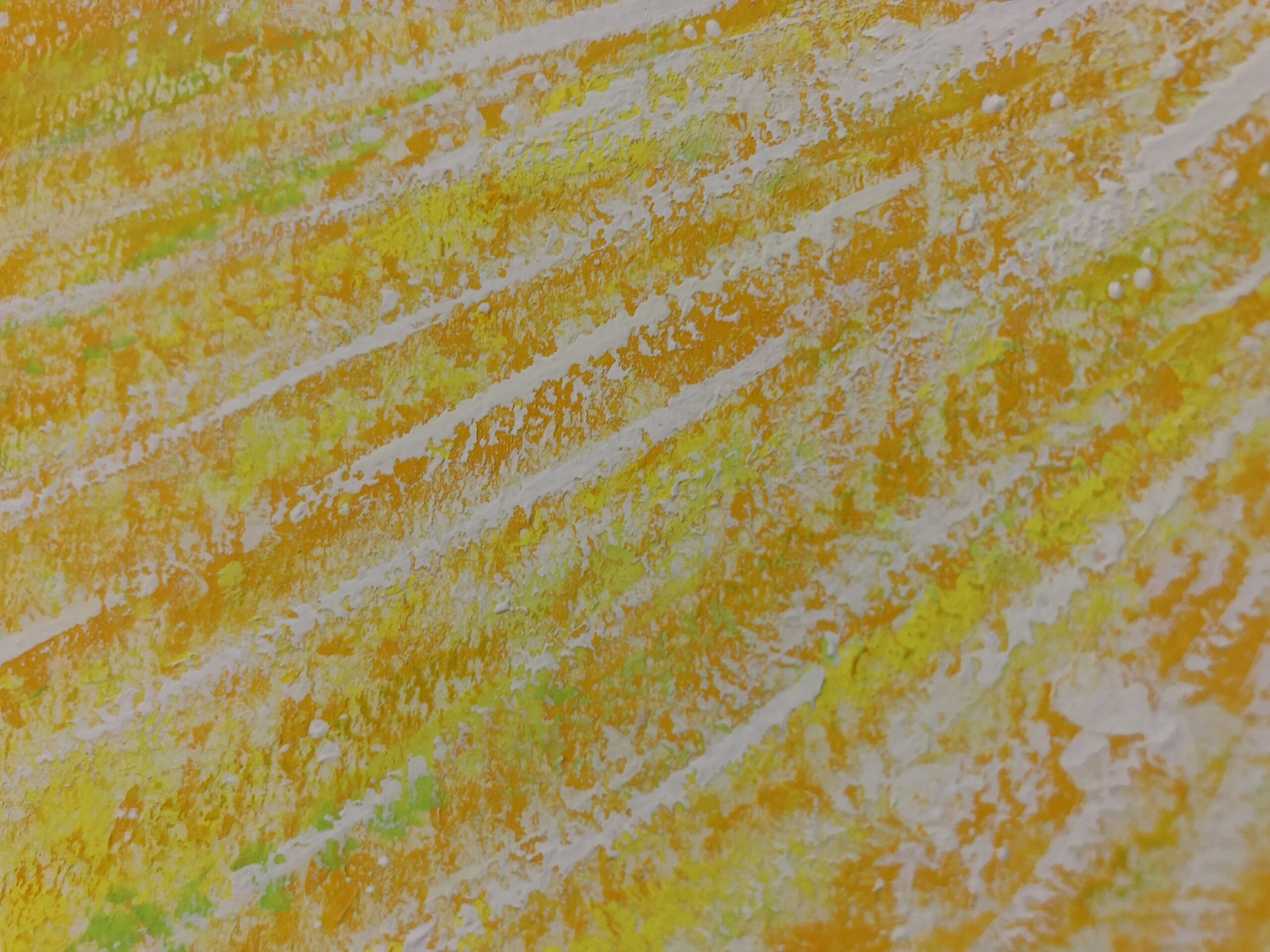黄色とオレンジの流れを基調とした、明るい光が差し込んでくるようなアートです。
