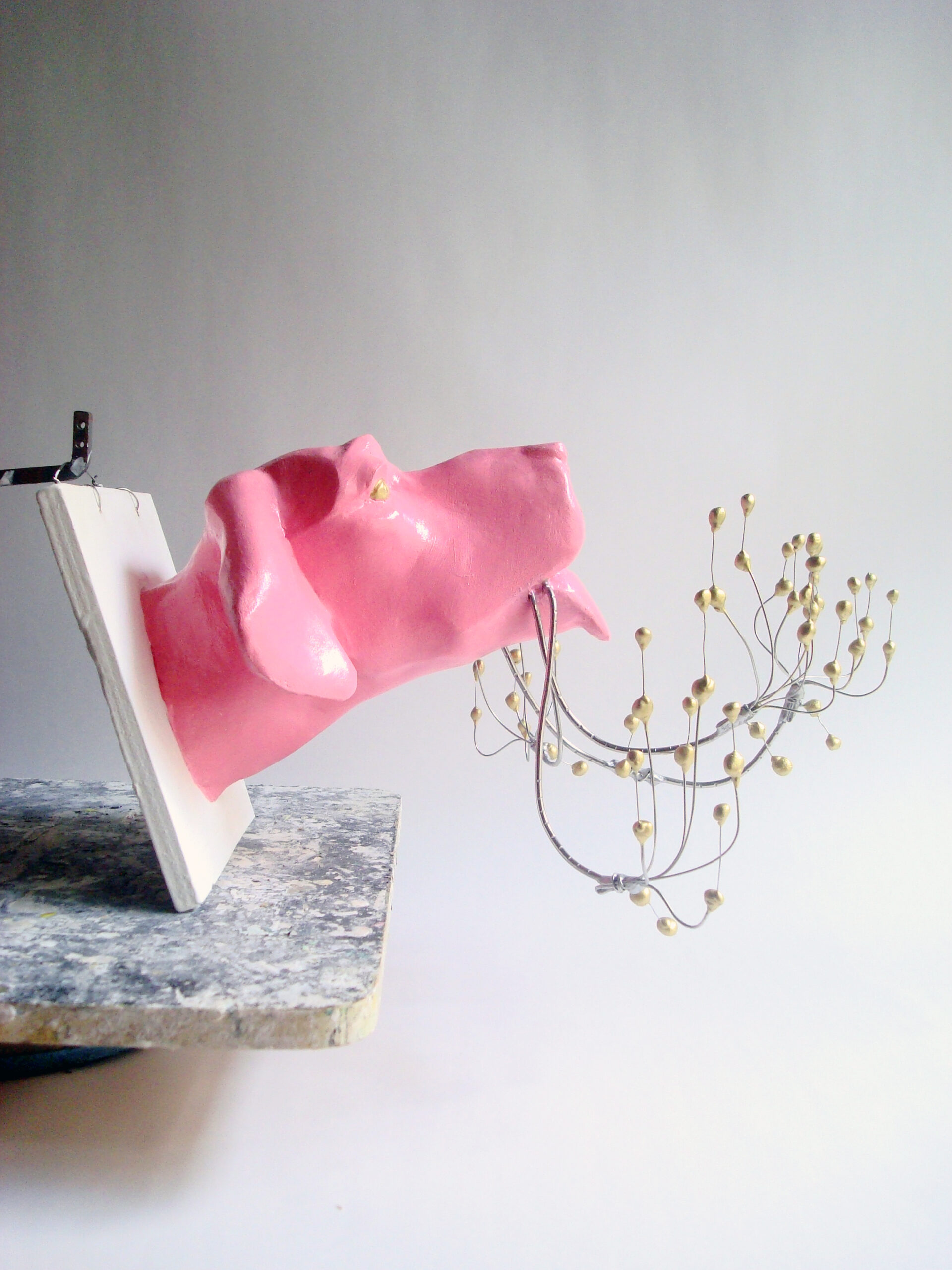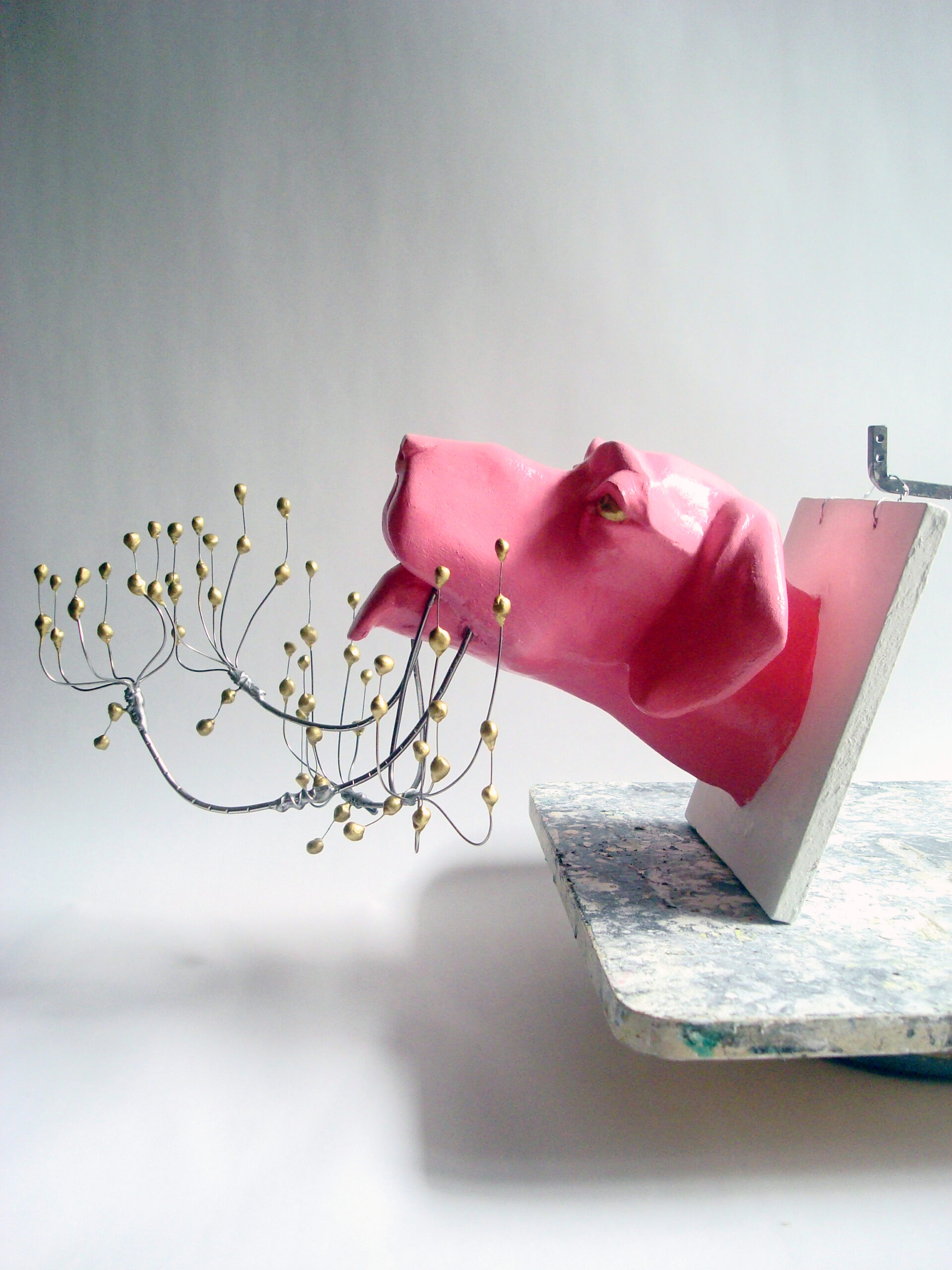 “針金と粘土を使って立体美術作品を作っています。 針金という素材の特徴(細く、軽く、柔らかく、光沢がある)と、 面性が強く形態感の強い形の彫刻(主に生物モチーフ)を組み合わせる事で、針金と彫刻のお互いの特性がより際立つようにしています。 彫刻の「重さ」に対して針金の「軽さ」をぶつける事で、お互いの造形の面白さを相対的に増幅させる事が出来るのではないかという事が今現在やっている創作活動の中で最も興味のある部分です。”