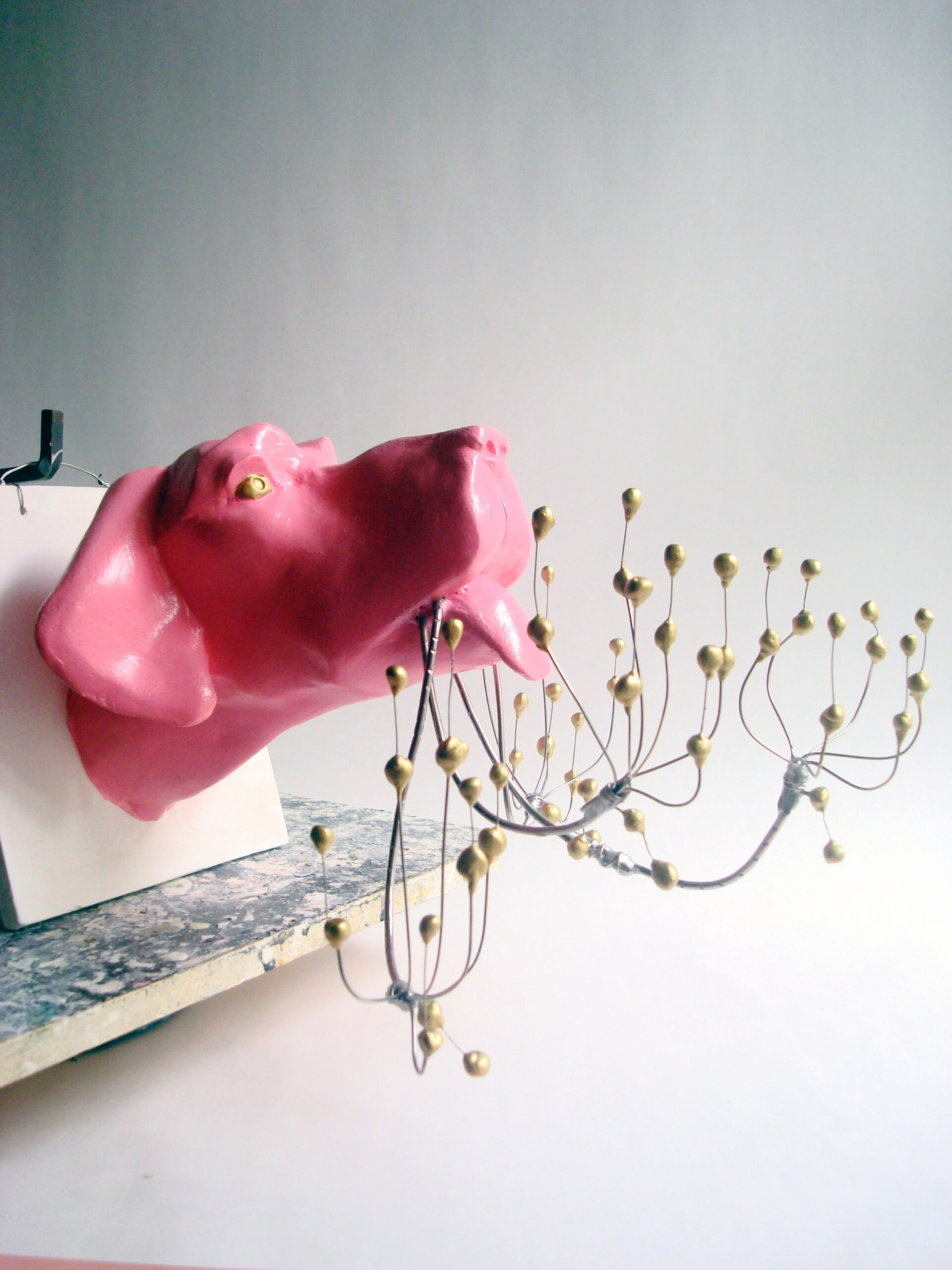 ラブラドール・レトリバーと有機的な形の針金のイメージを融合させて作りました。