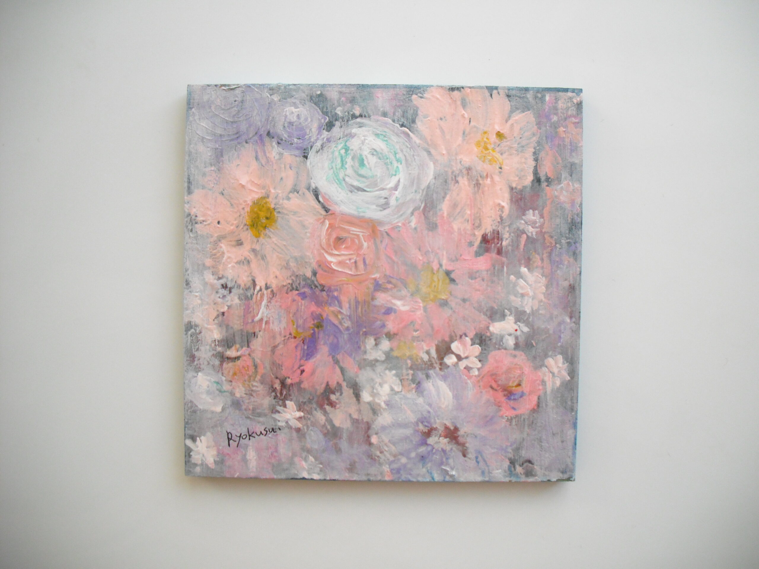 小さくて、軽い板に半抽象の花の絵を描きました。