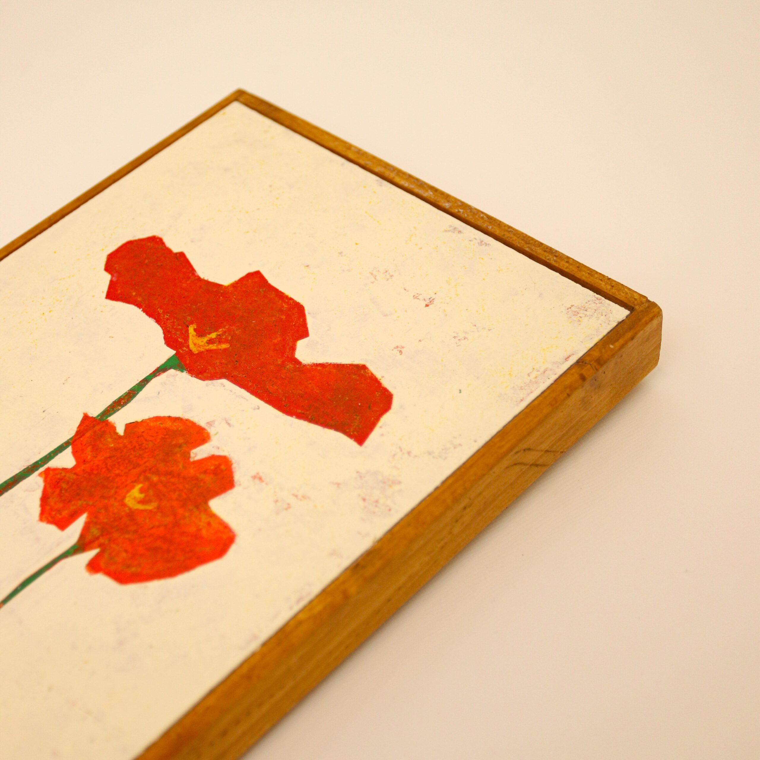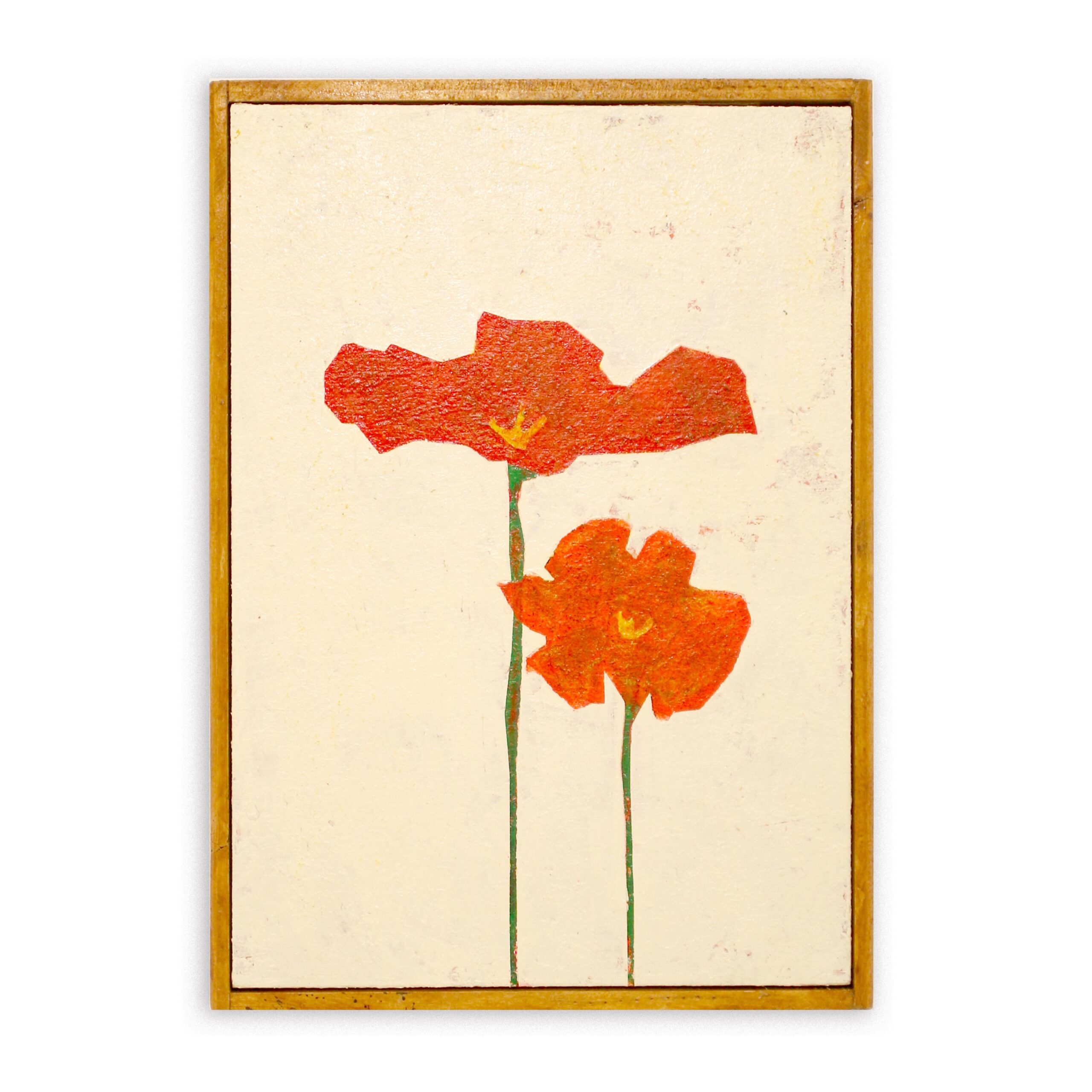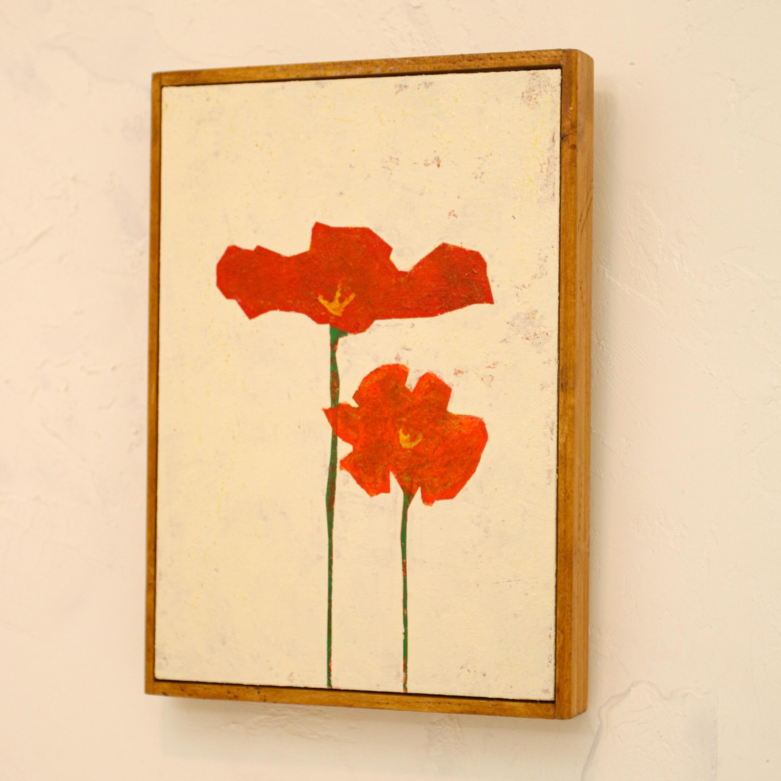 この作品は、ポピーの花をモチーフに、異なる素材と手法を重ねる「レイヤード・テクスチャーアート」の技法を用いて表現しました。花弁の粗く削られたエッジと、重ね塗りによる豊かな質感が、生命の儚さと力強さを象徴しています。白い背景の中に浮かび上がる赤とオレンジの花は、記憶の中に残る風景のように静かで鮮やか。さらに、額縁も自身で制作し、作品全体が持つ温かみを際立たせています。