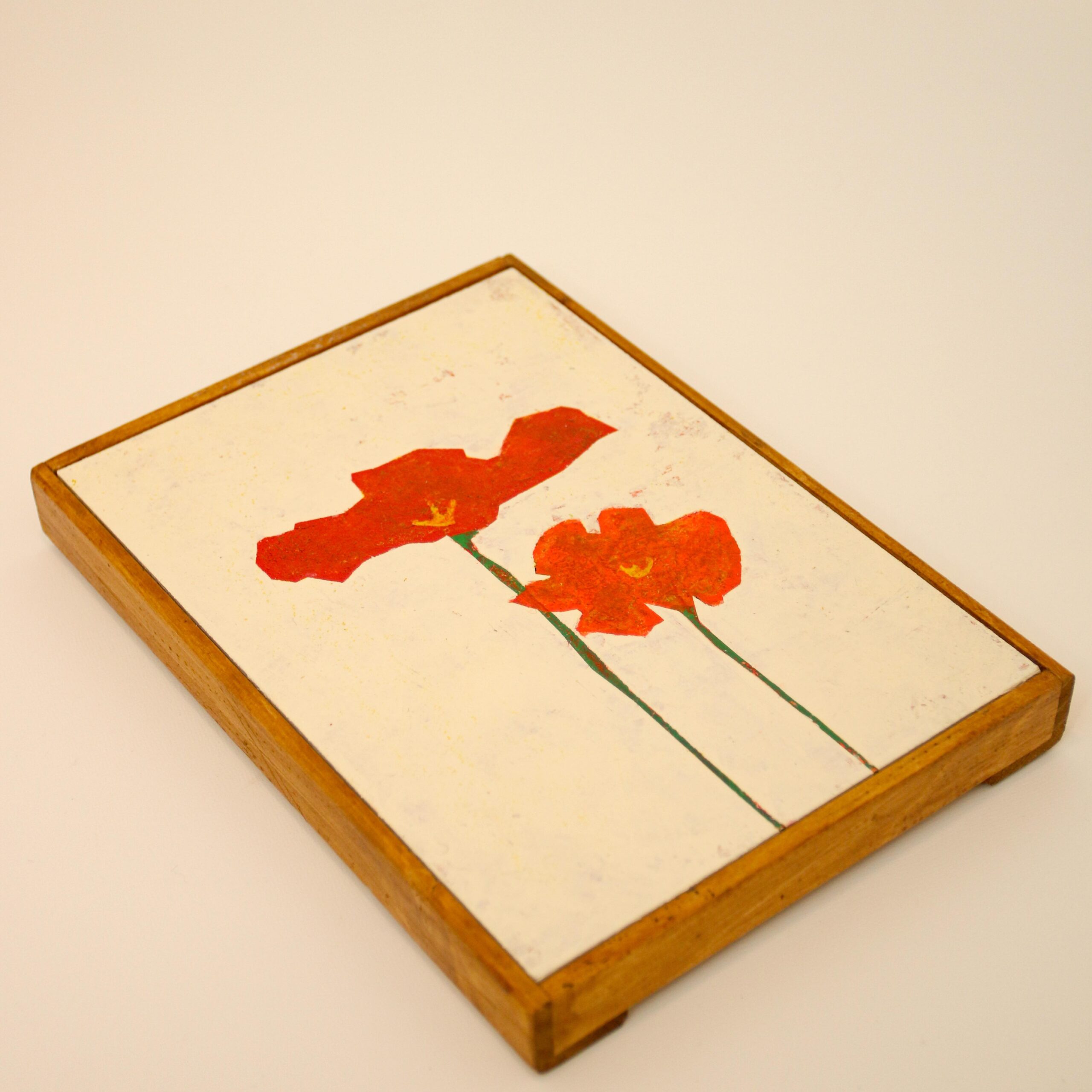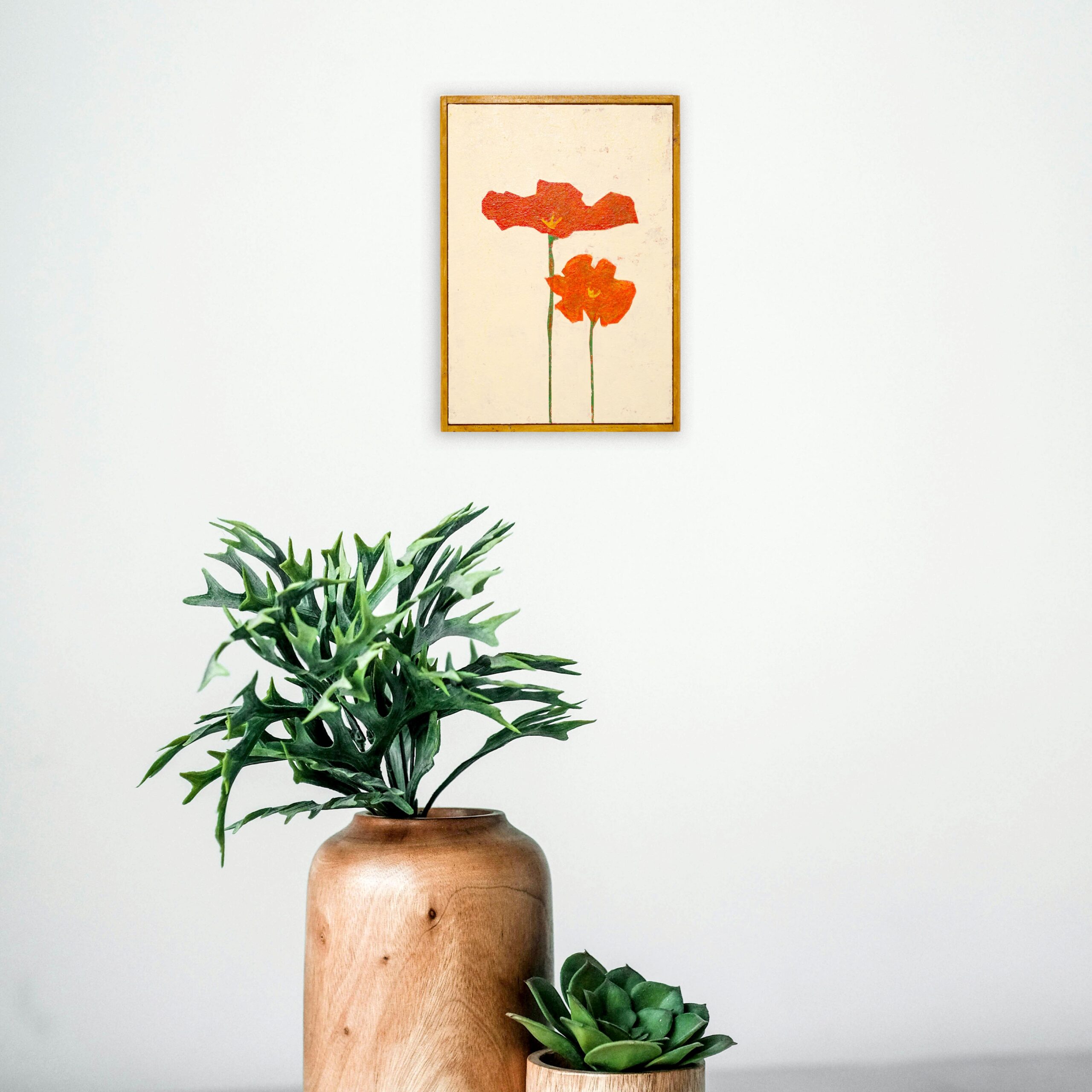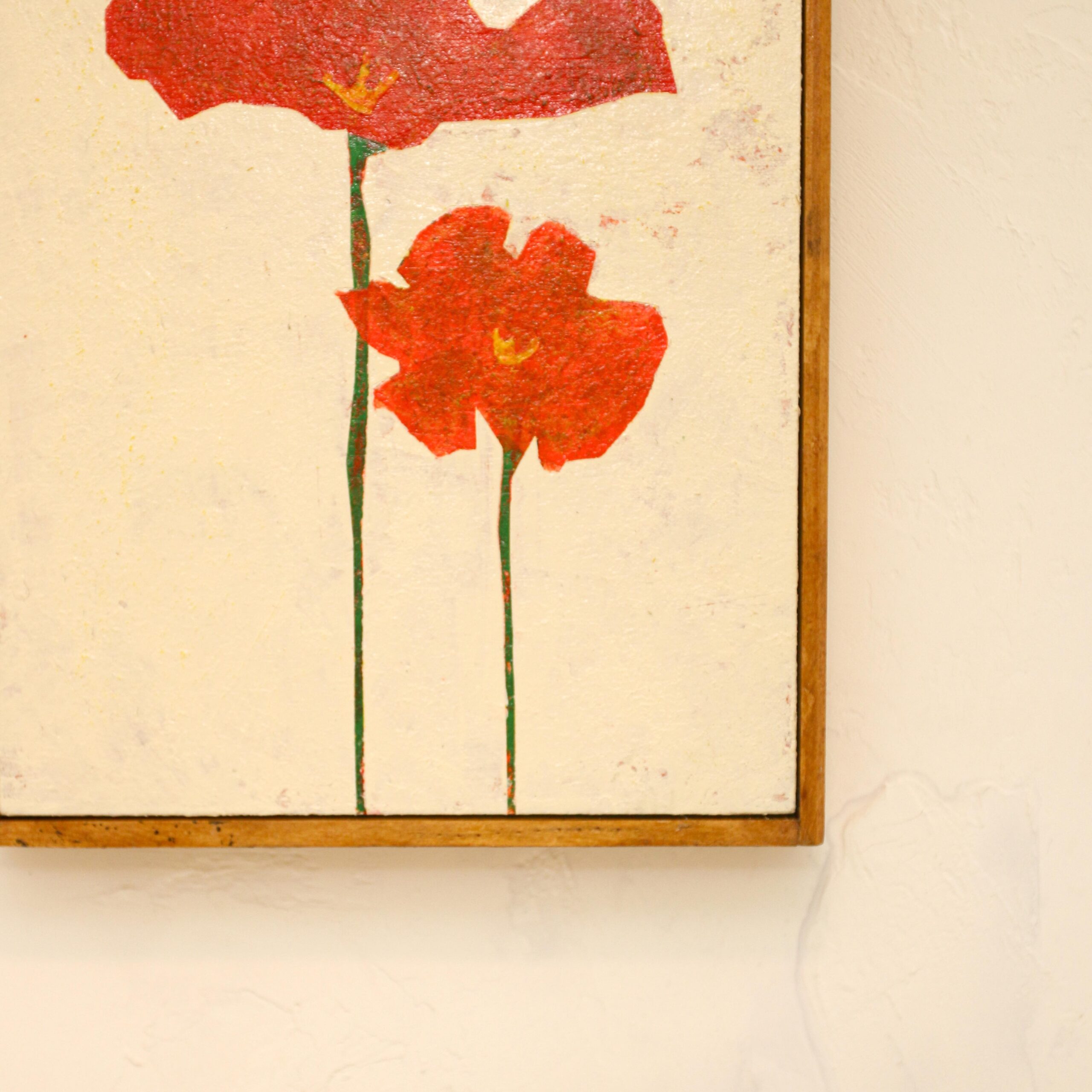 この作品は、ポピーの花をモチーフに、異なる素材と手法を重ねる「レイヤード・テクスチャーアート」の技法を用いて表現しました。花弁の粗く削られたエッジと、重ね塗りによる豊かな質感が、生命の儚さと力強さを象徴しています。白い背景の中に浮かび上がる赤とオレンジの花は、記憶の中に残る風景のように静かで鮮やか。さらに、額縁も自身で制作し、作品全体が持つ温かみを際立たせています。