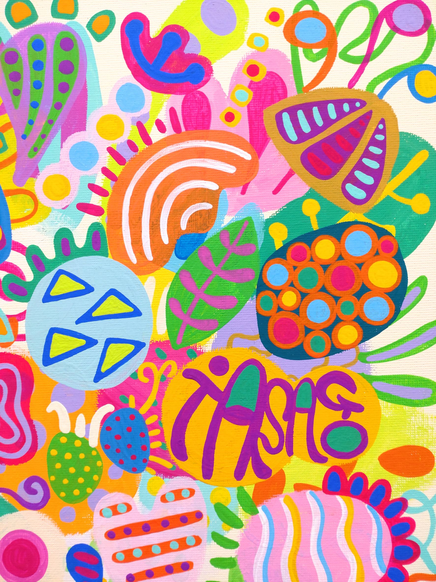 お寿司を食べたい♪という気分になっている花たちを描きました。お寿司を食べたい気持ちが大きくなって、花の形がお寿司っぽくなっています。例えば、左上には天ぷらっぽい形の花、その隣には鉄火巻きっぽい花がいます。その他にもまぐろ、サーモン、うに、いくら、納豆巻き、いなり、ほたて、あなご、いかなどの形みたいになった花たちがいます。