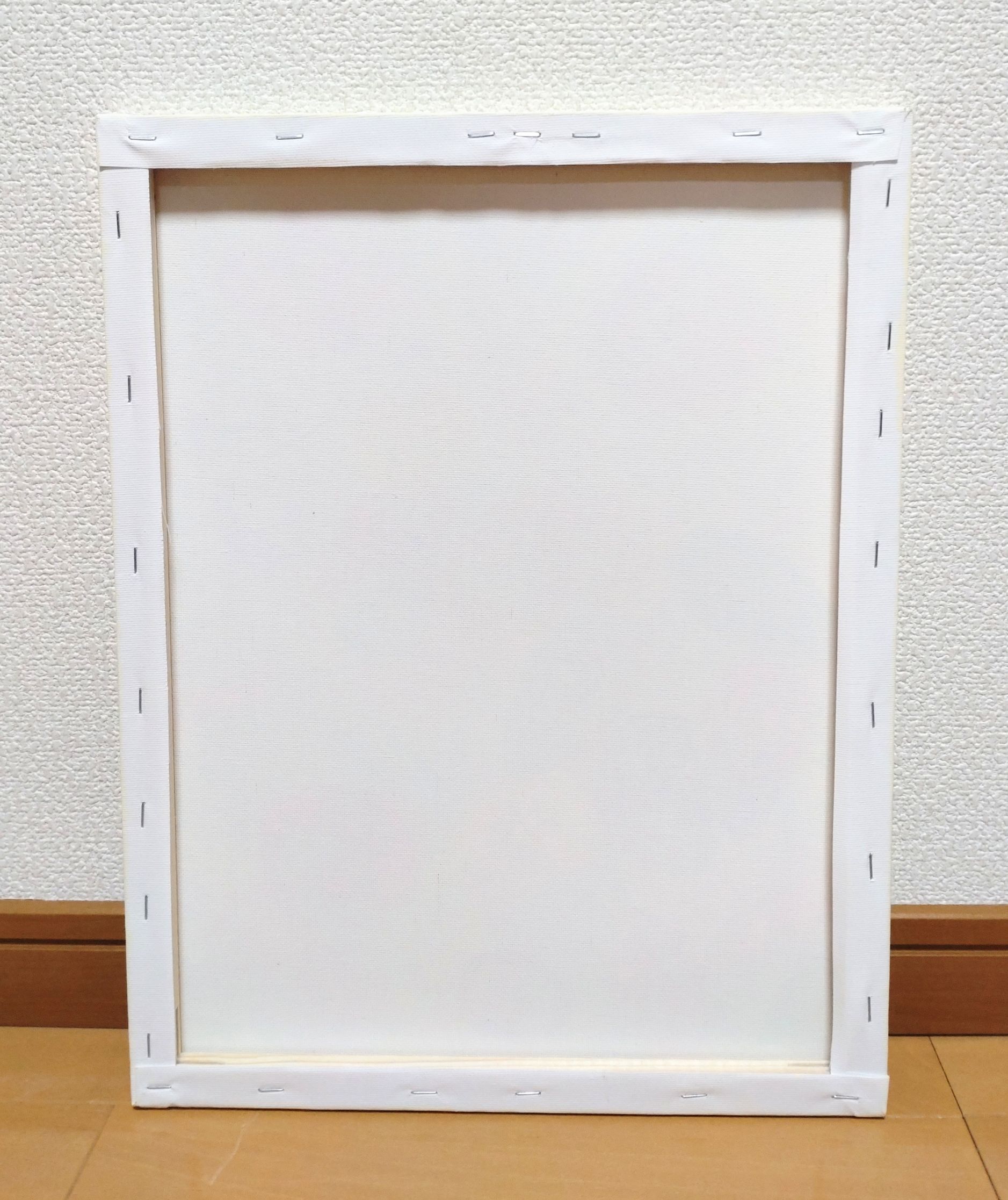 キャンバスのうしろにひもがついておりません。ピンにひっかけていただくと簡単&すぐに展示していただけます。(ふちの部分も色を塗っているので、そのまま飾ることができます。)
