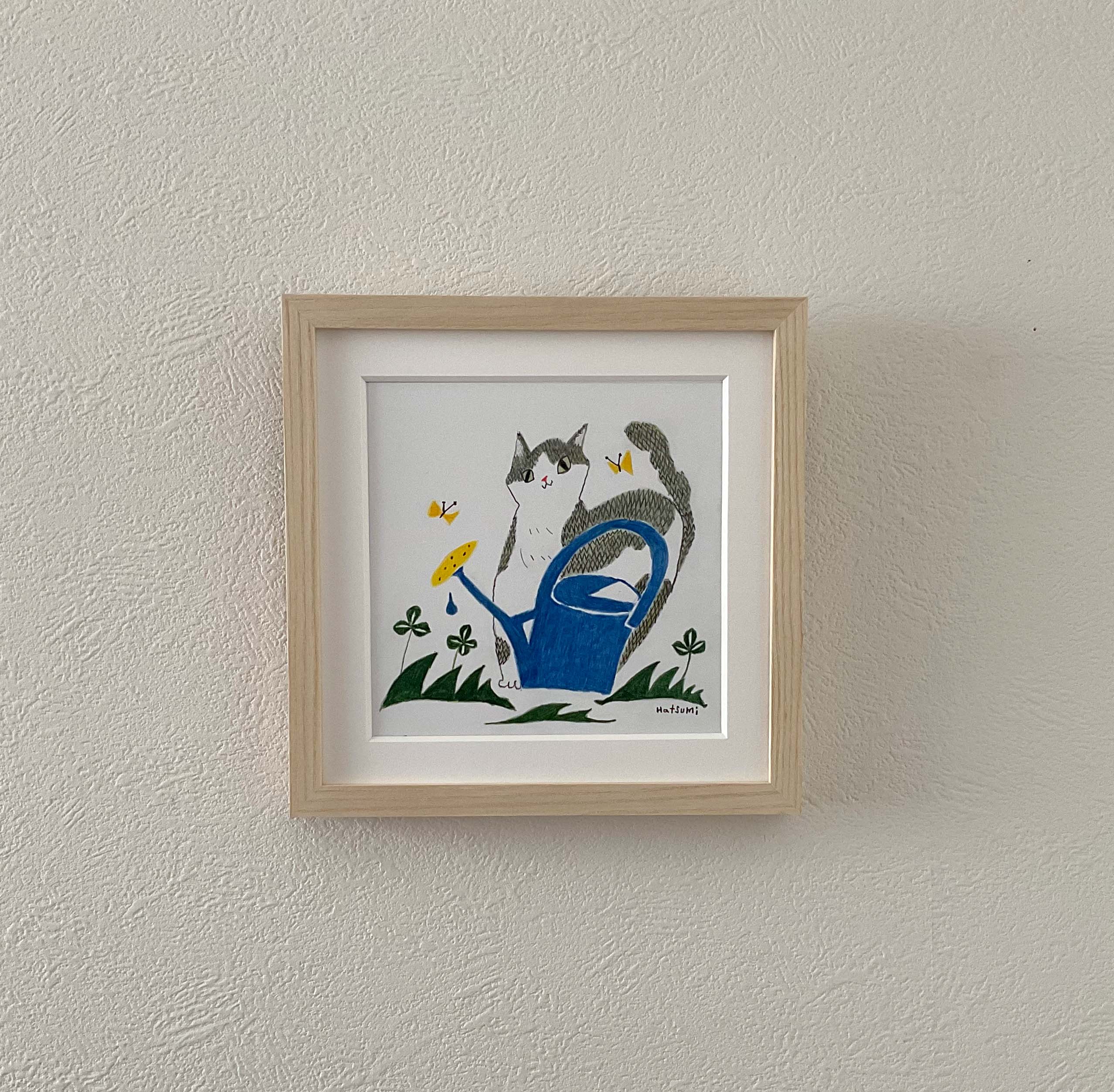 発色の良い油性色鉛筆で春から夏あたりの季節の雨上がりの庭にいる猫を描きました。
