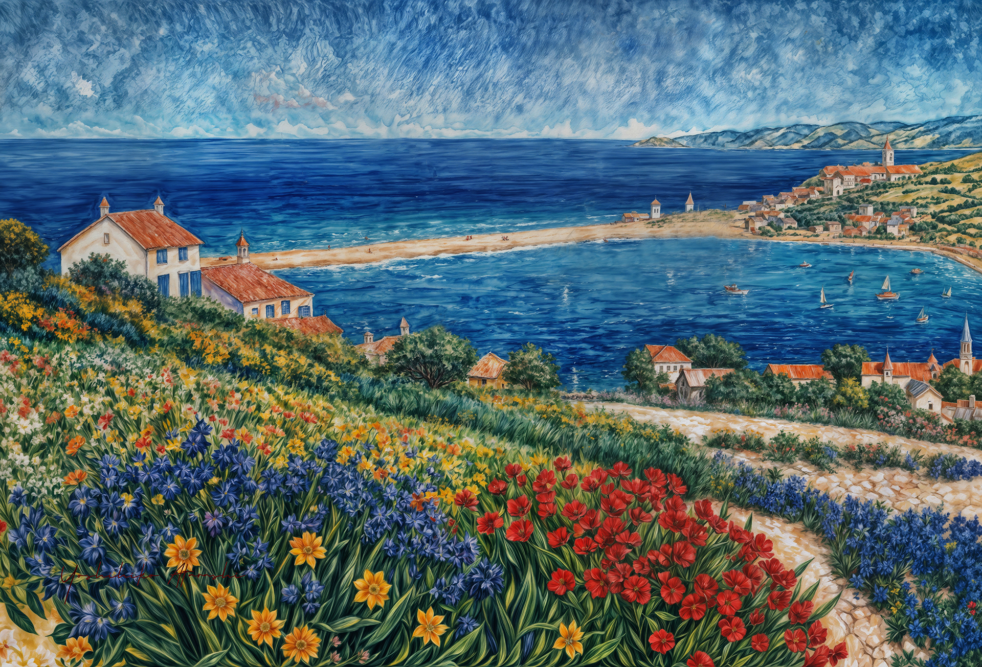 これらの作品は、エーゲ海の自然の美しさと穏やかな海辺の暮らしを描いた風景画です。風に揺れる色とりどりの花々、光を反射する青い海、そして緩やかな丘の上に佇む家々が、心地よい静けさと幸福感を醸し出します。印象派の筆致を活かし、光と影の変化、鮮やかな色彩を通じて、移ろいゆく時間や空気感を表現しました。この作品を通じて、観る人が心の安らぎを感じ、自然との調和を思い出してもらえれば幸いです。