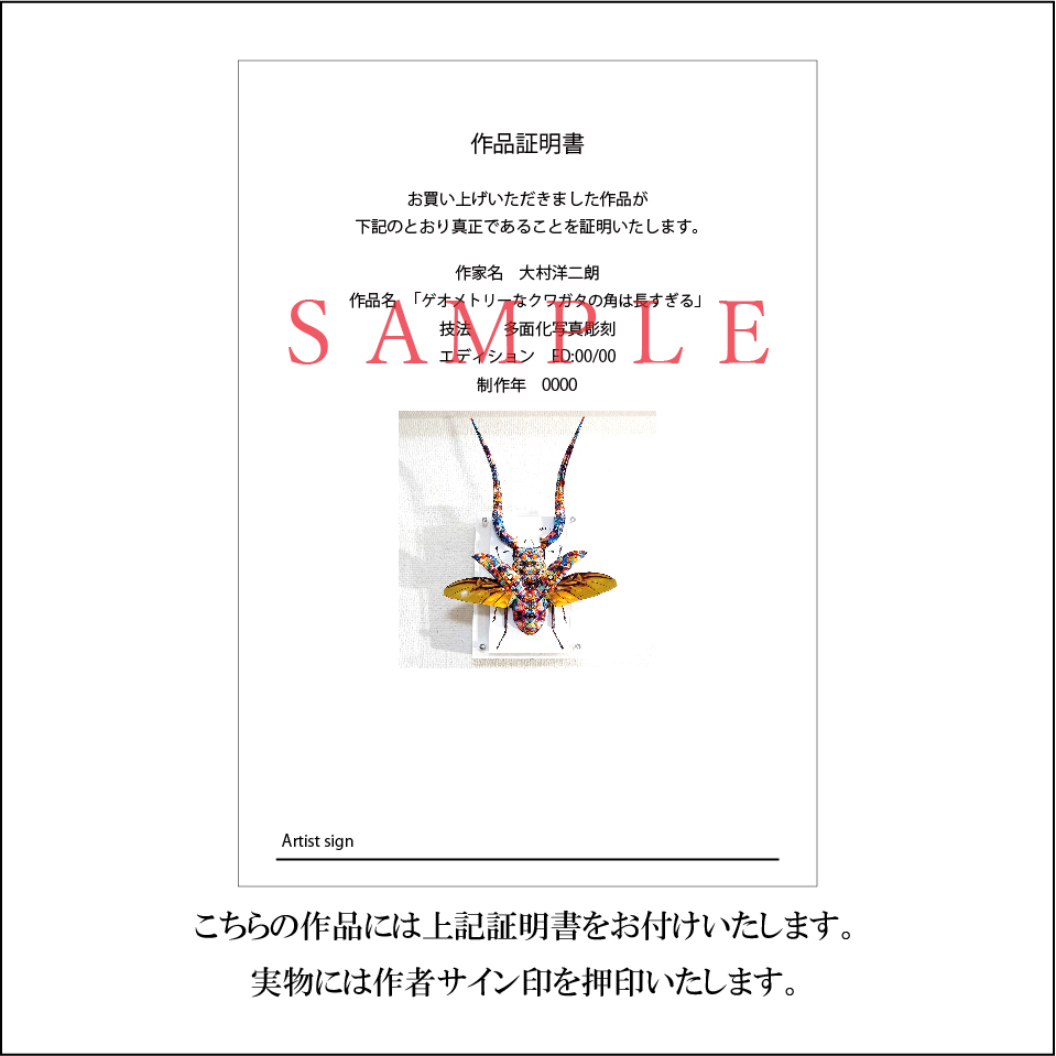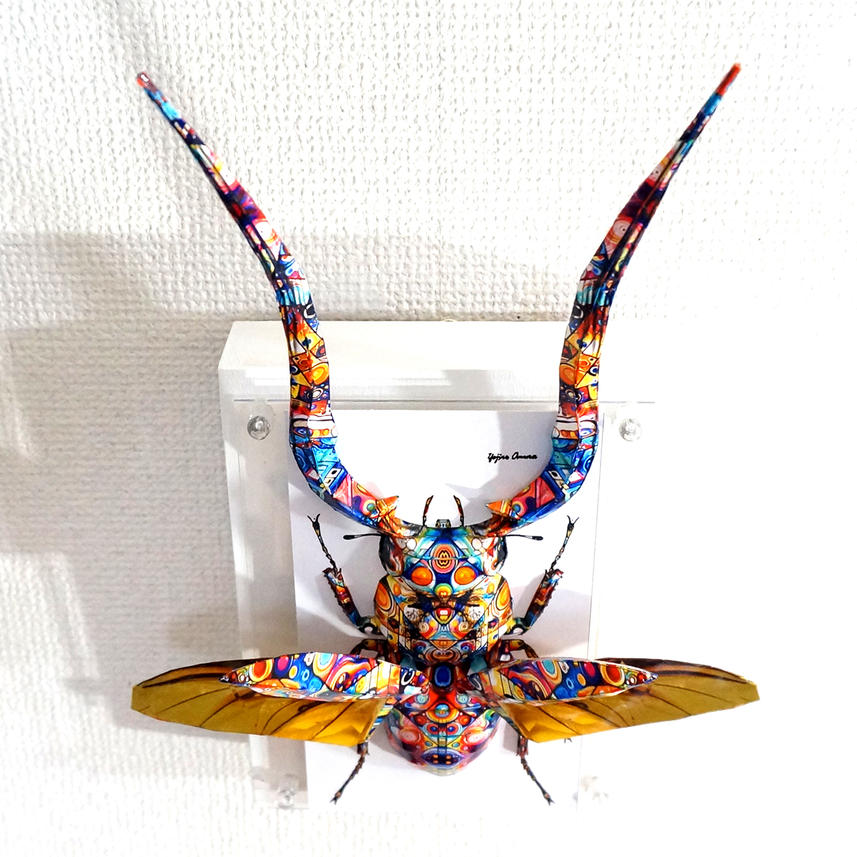 幾何学模様をカラフルに彩りクワガタ本来の風合いに重ね合わせたデザインになります。光沢紙の艶のある質感となっております。
