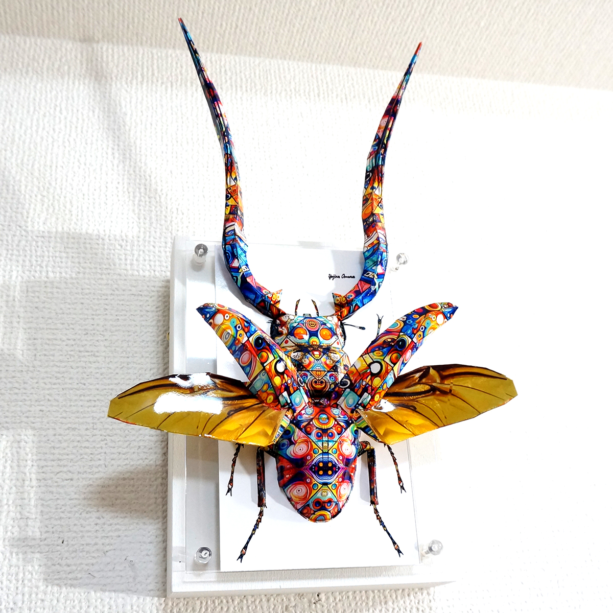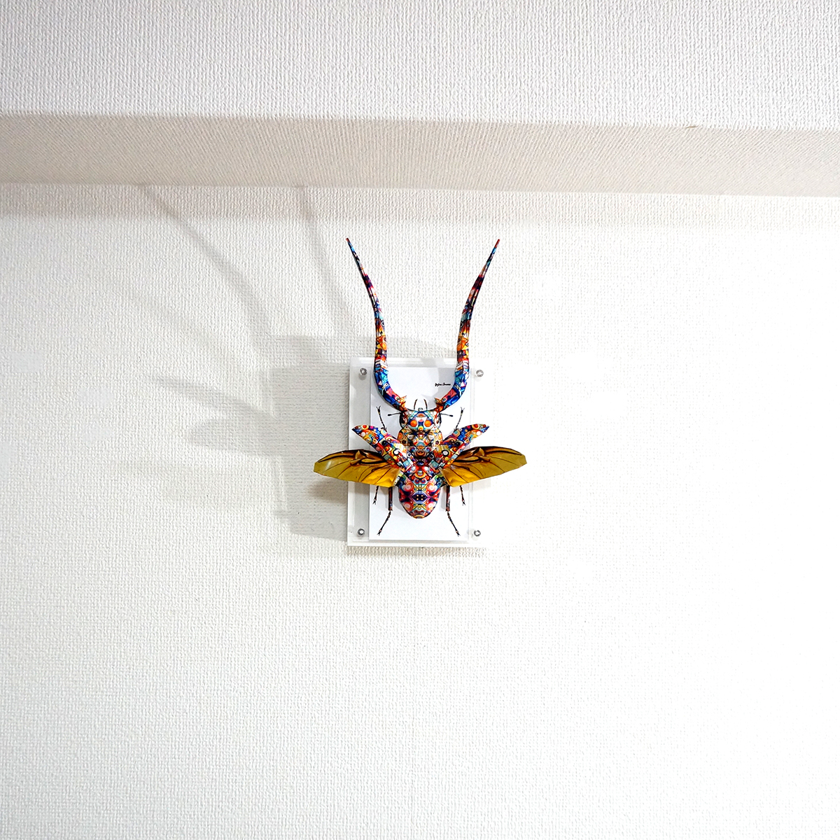 ペーパークラフト技術を用いてクワガタのコラージュ画像を立体的に表現した作品です。