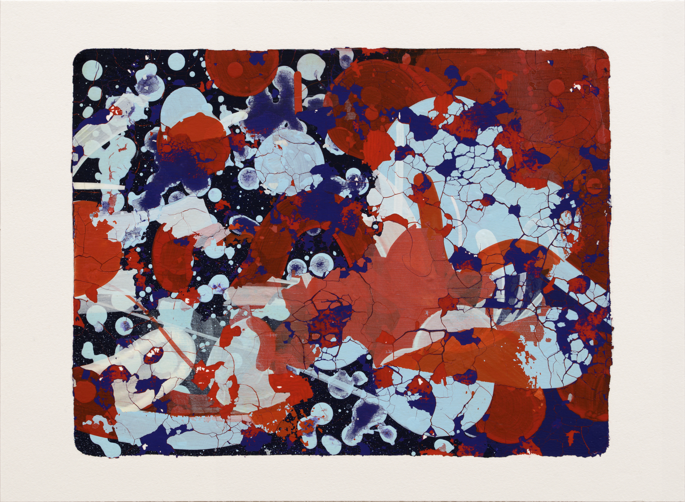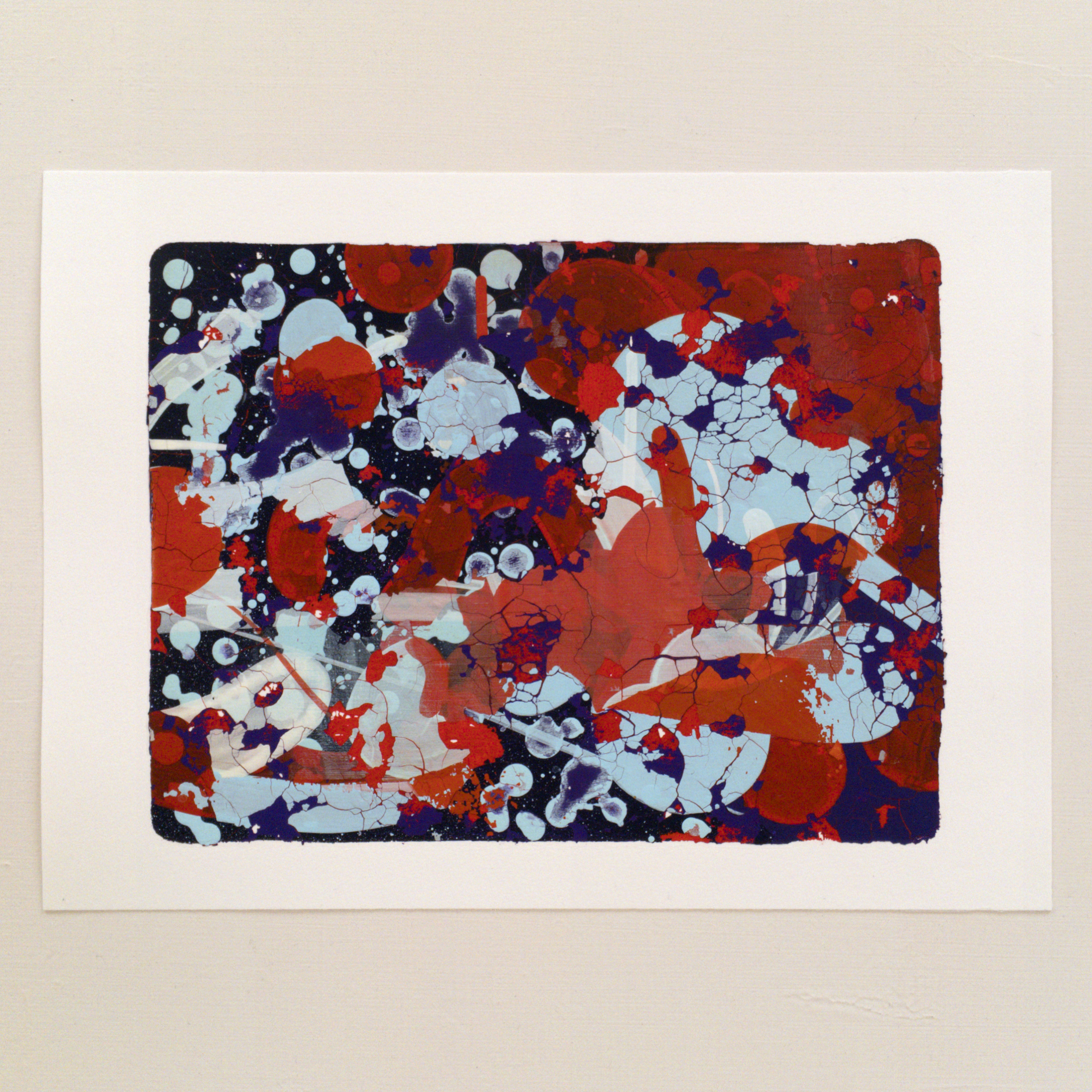 水彩紙(300 g/m2)にアクリル絵具で制作された実験的なモノタイプの作品です。版画の一種ですが、限定数が1枚の作品です。