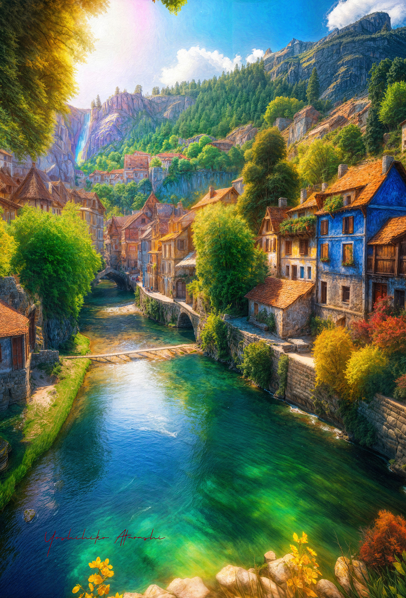 まるで物語の一場面に迷い込んだかのような、美しい川辺の村の風景画です。温かみある色彩と柔らかな筆致が見る者の心を癒します。木製フレームに収め、自然光の入る壁面に展示することで、その魅力が一層引き立ちます。心の旅をお楽しみください。