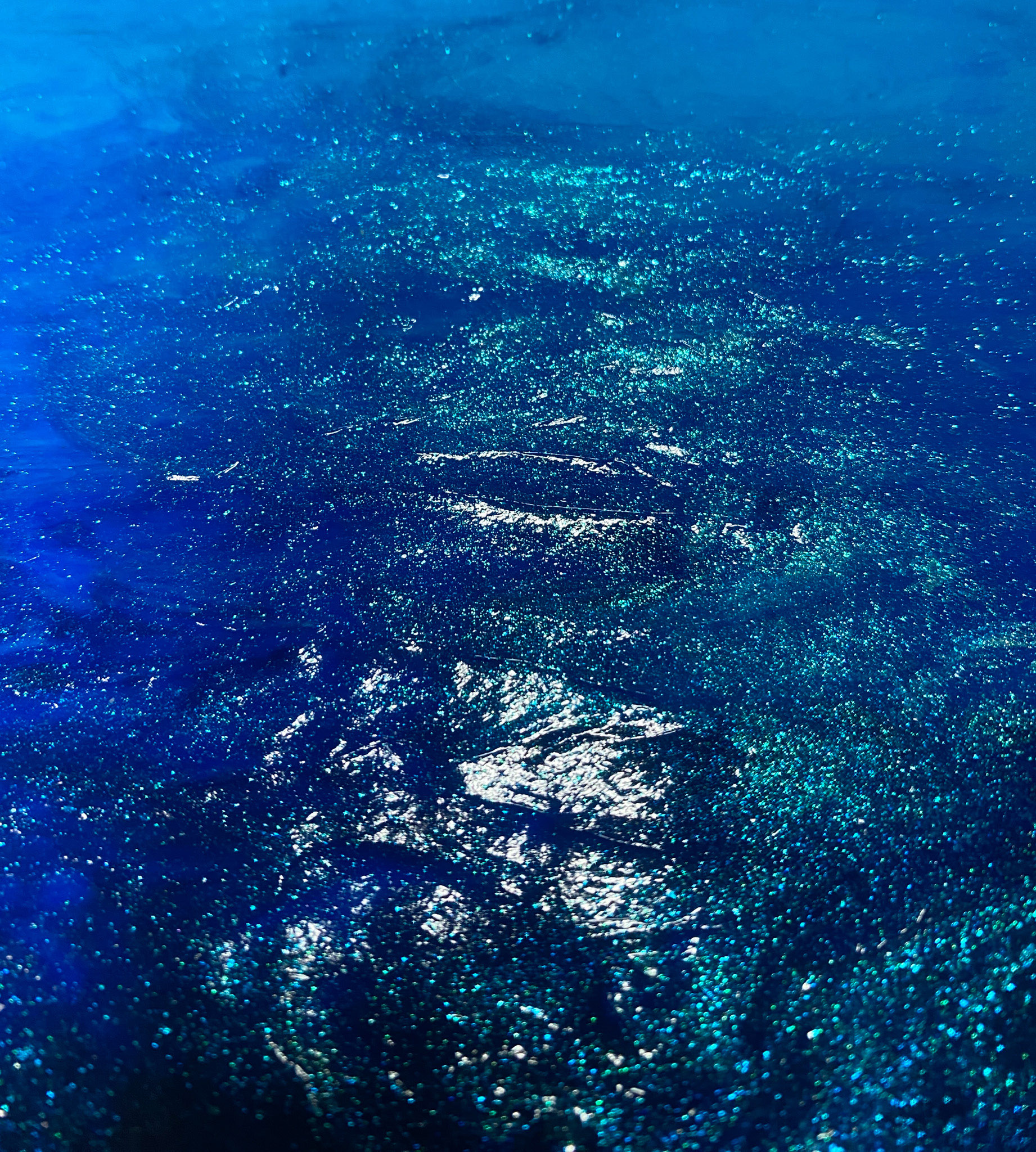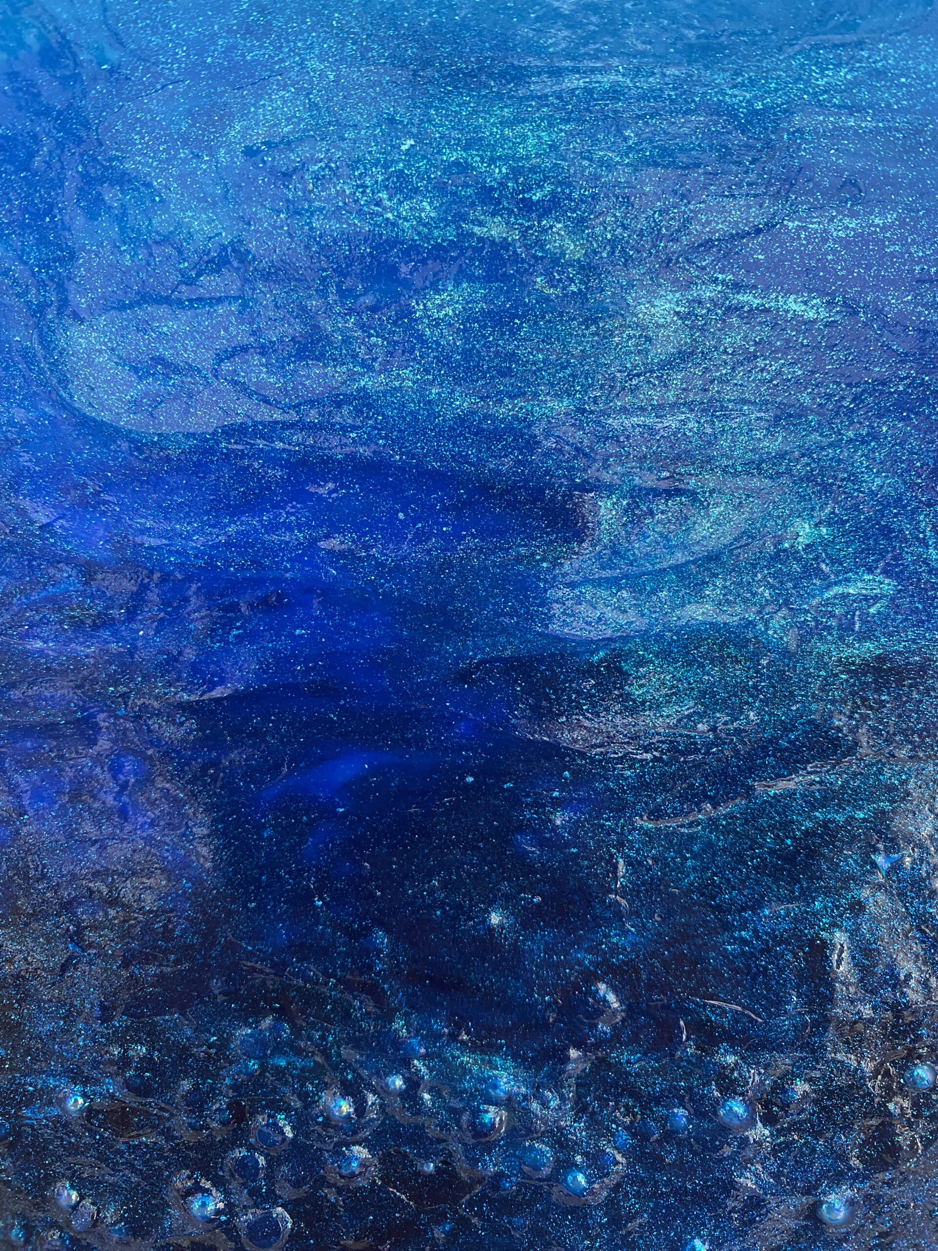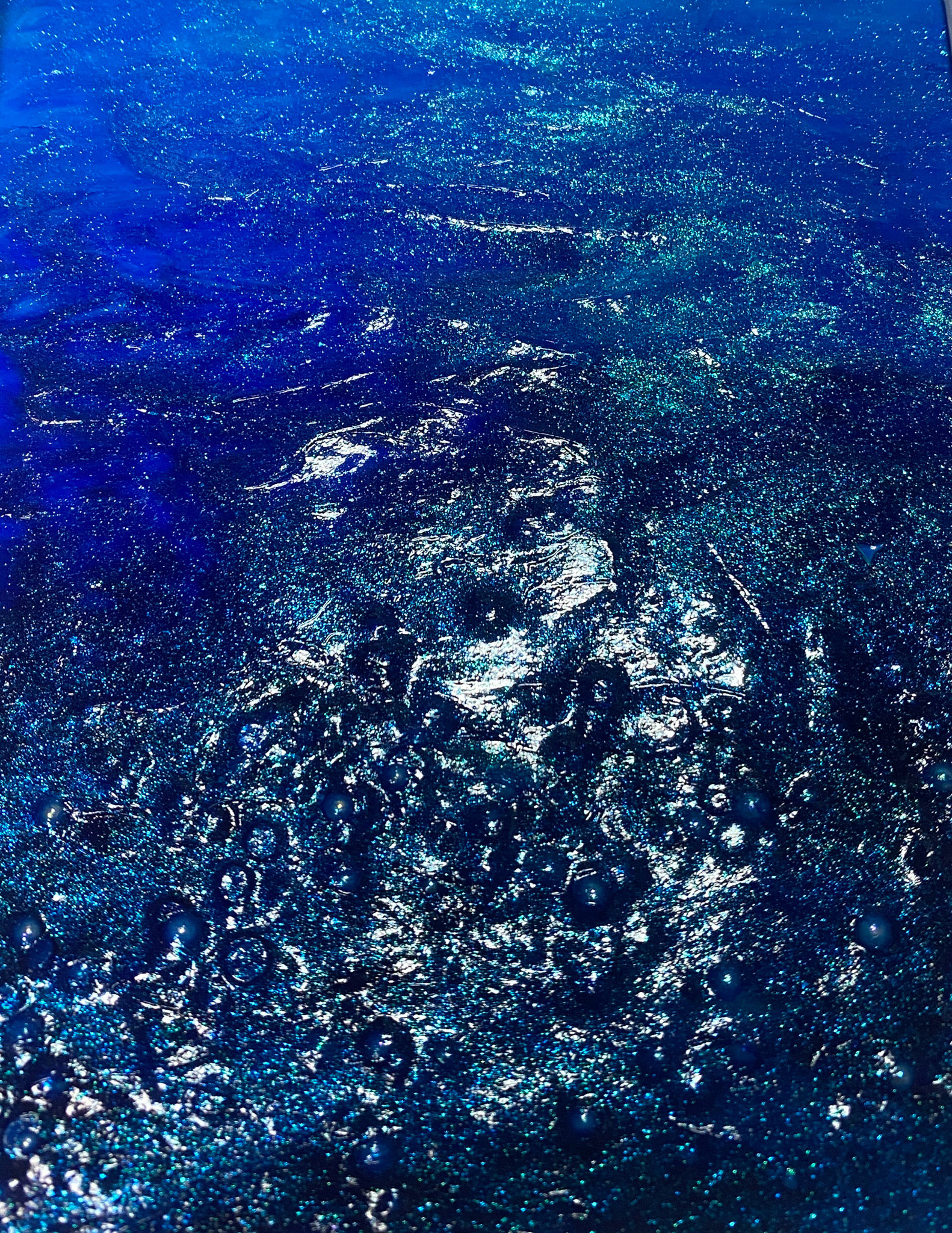 深海は美しくもあり、神秘的で謎めいた世界。人類にとってまだ未知の世界であり、人々を魅了する。ジェルメディウムやビーズなど、様々なメディウムを使用したミクストメディア作品です。