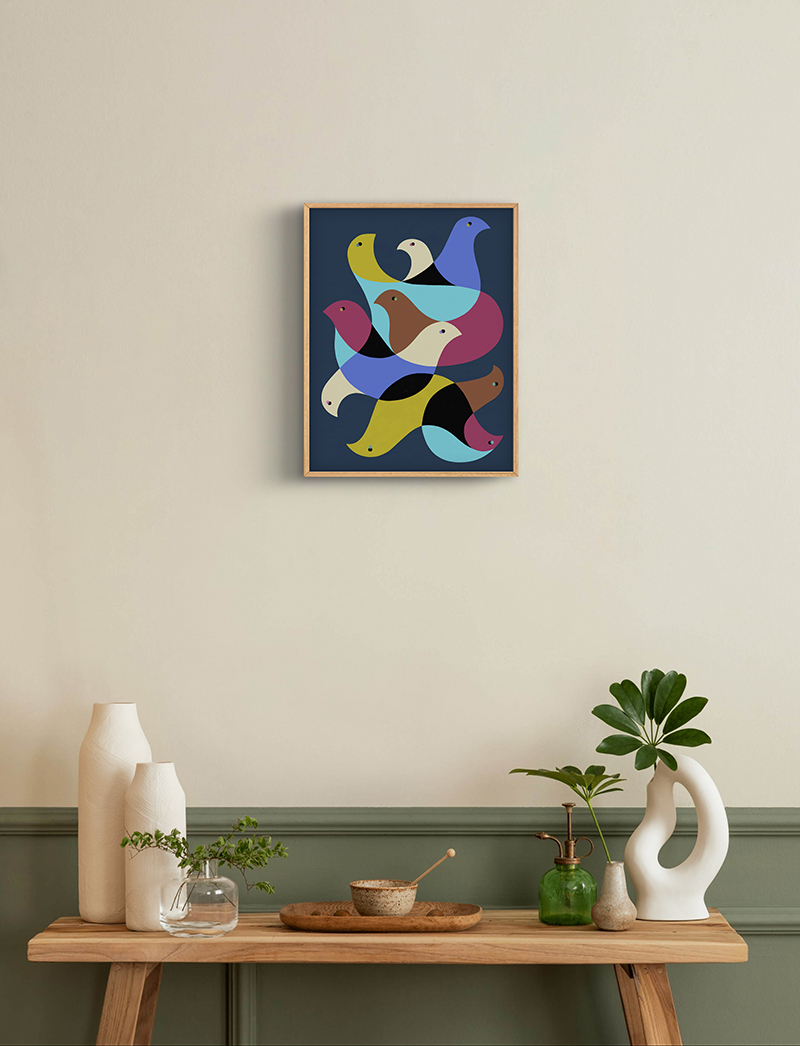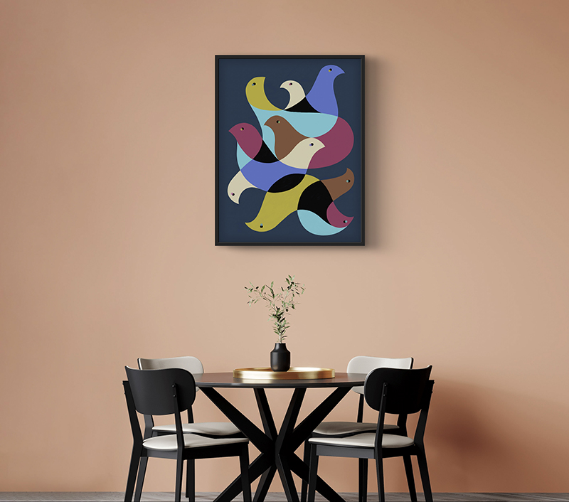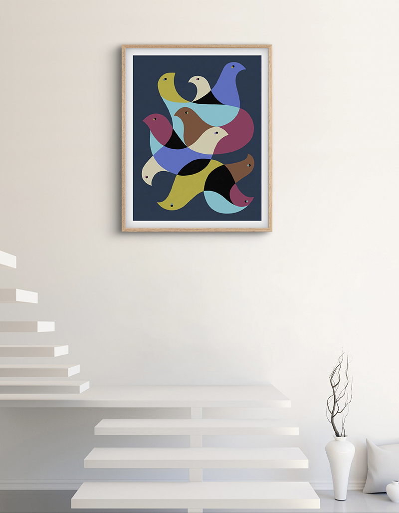 朝方の公園に、沢山の鳩が餌を求めて群がってる様子を、グラフィカルに変換し色とフォルムで表現しました。こちらは額装での販売となります。尚、サイズは適度な大きさでの販売になりますが、デジタル作品につき可能な限りサイズ変更が可能です。価格等は変動致しますがご相談ください。