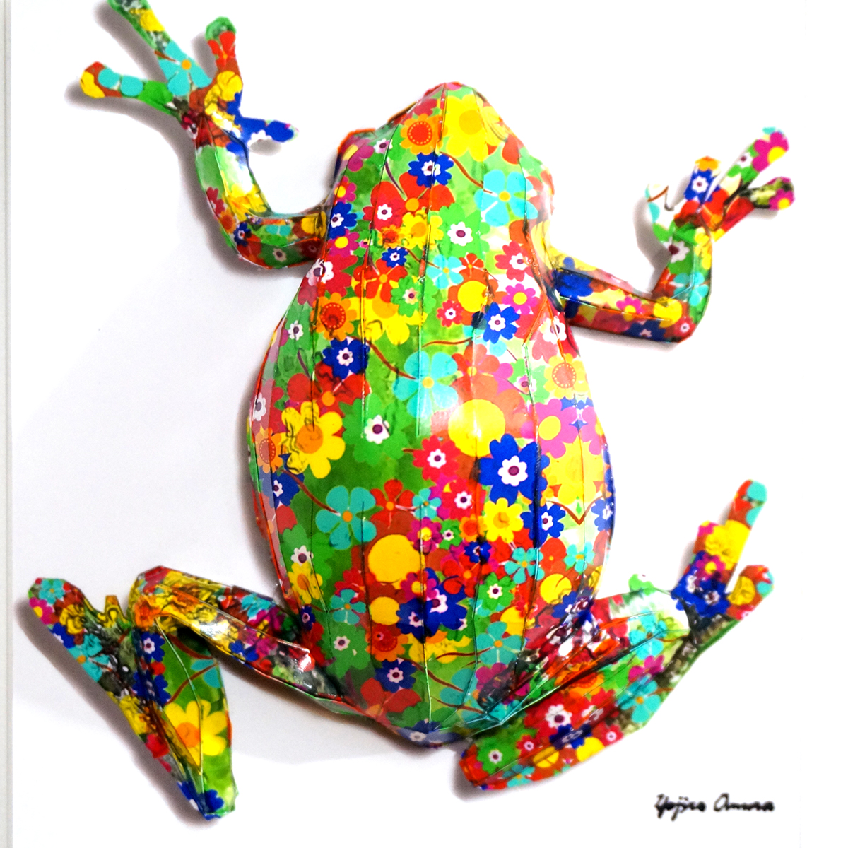 アマガエルのコラージュ画像を元にペーパークラフト技術を用いて立体的に表現した作品です。