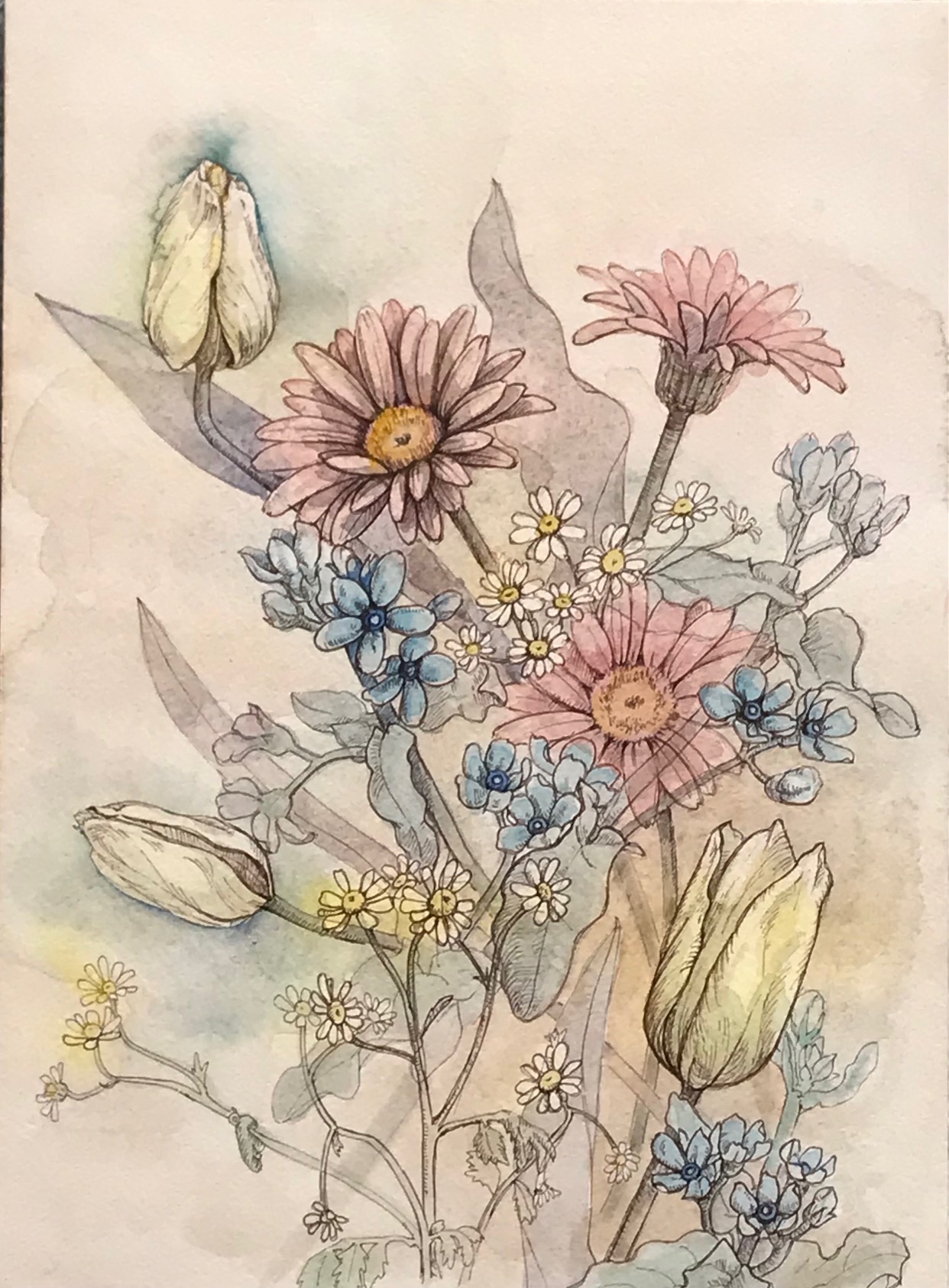 ダークブラウンのボールペンの線画に淡彩で着色してみました。セピアの背景の花たちは昔の記憶のように静かに揺れています。