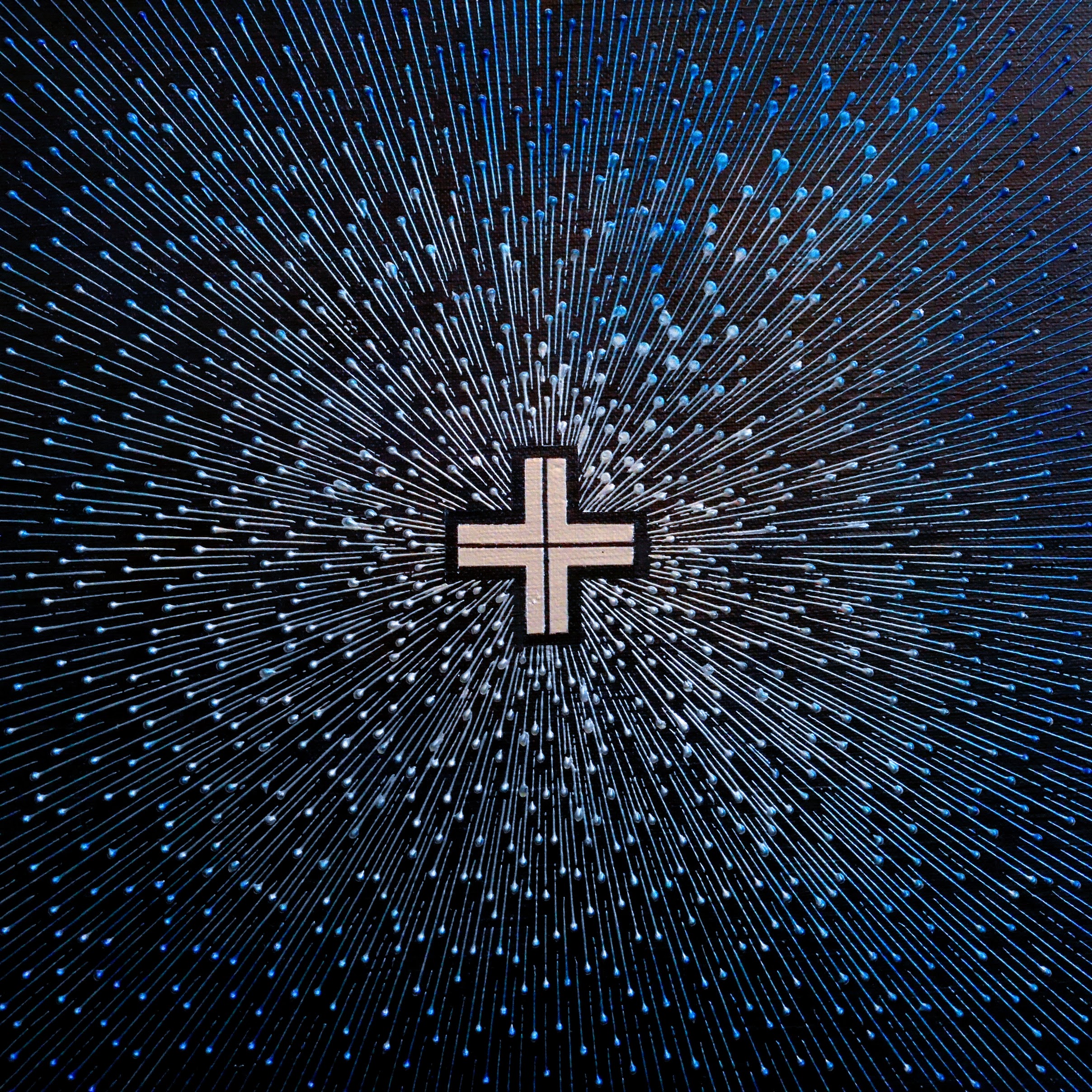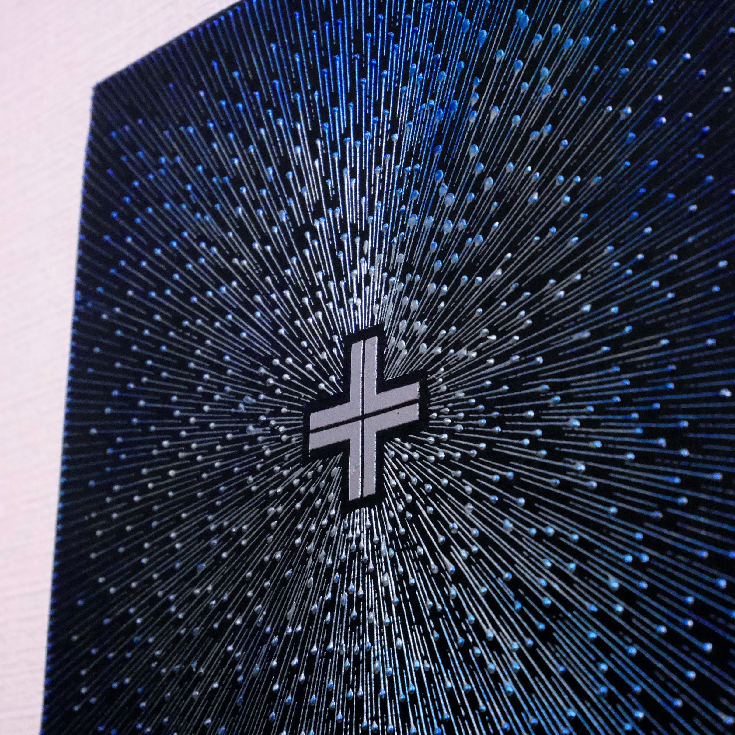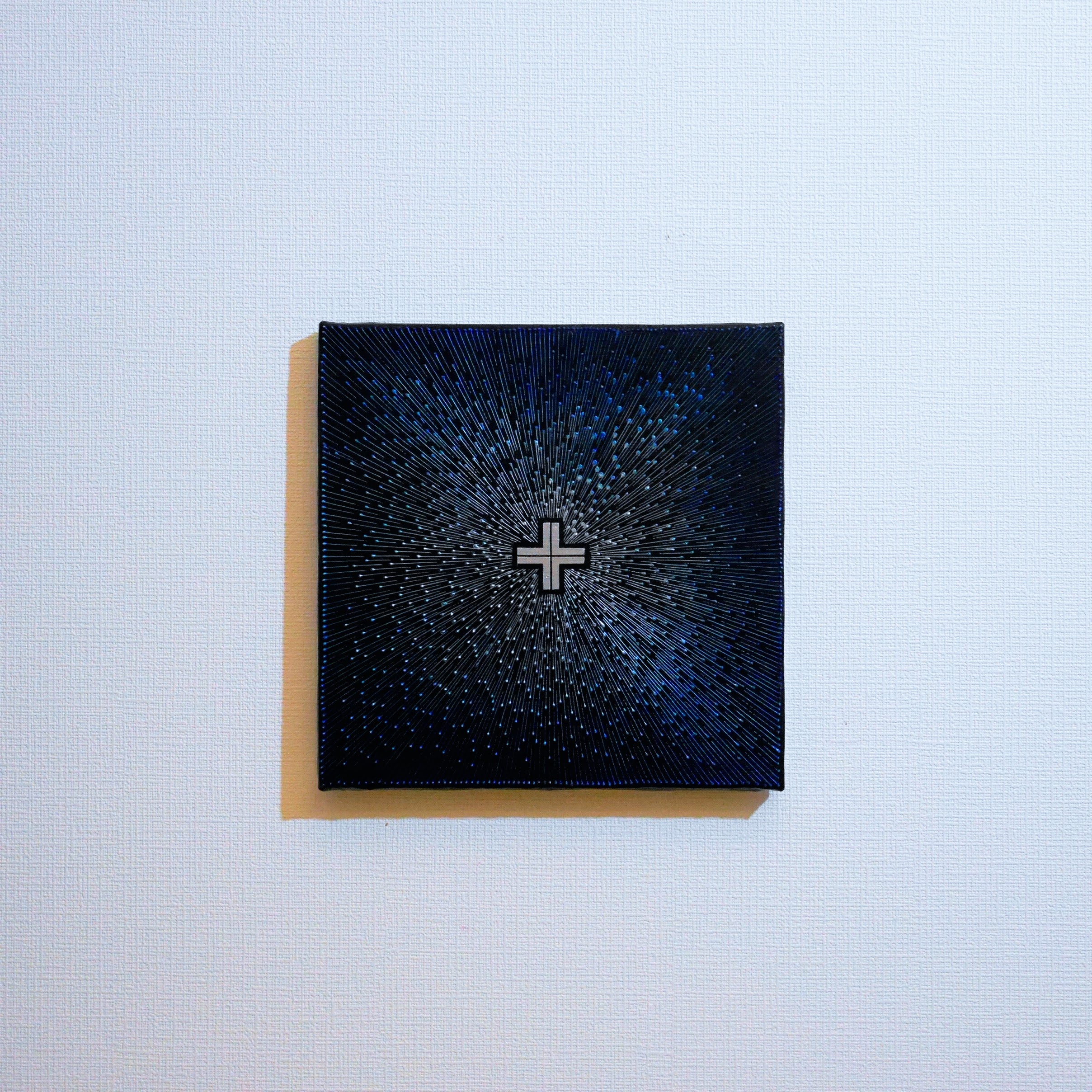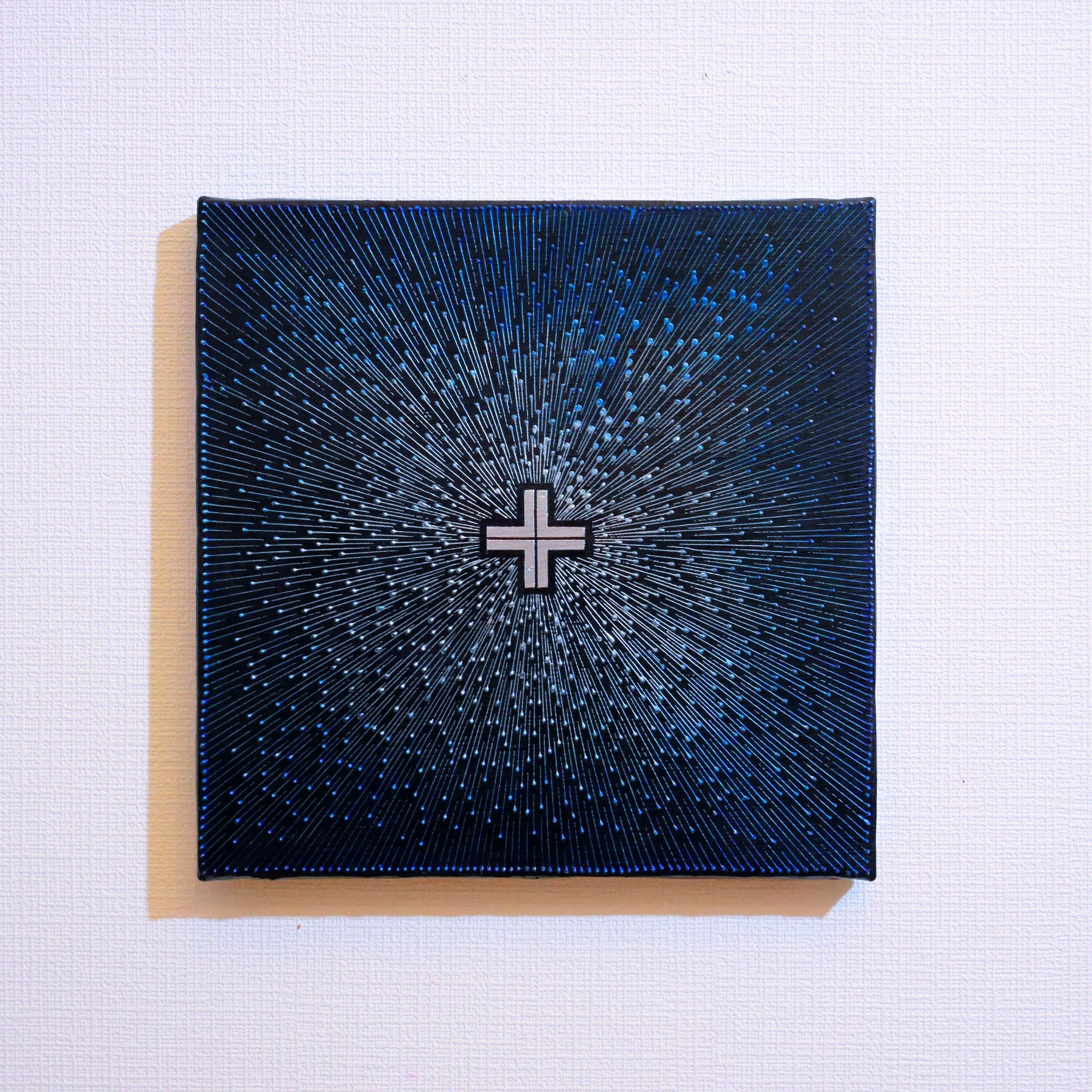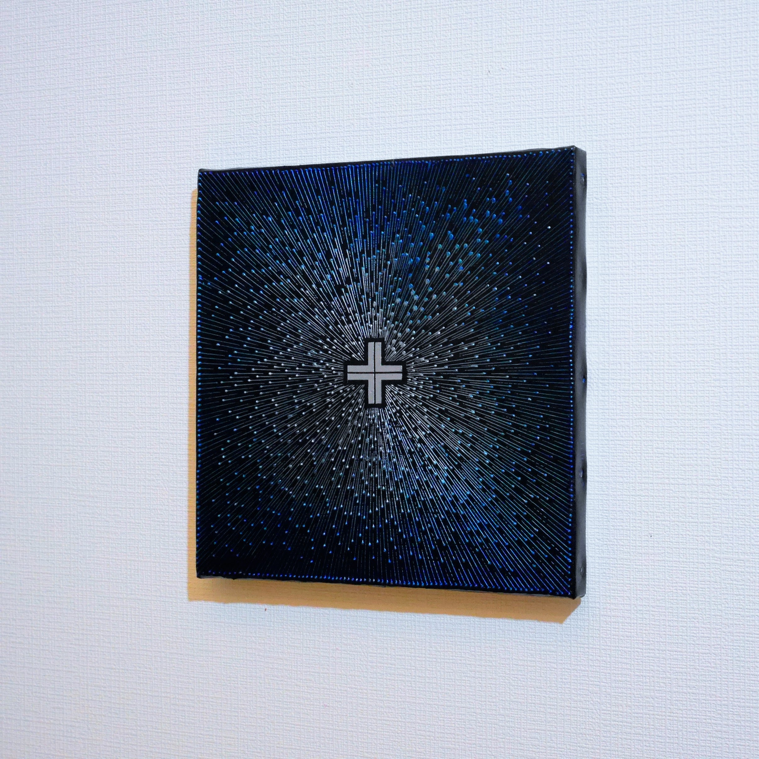S3サイズのキャンバスに油彩 銀色の正十字を中心に、 周囲には青銀色の線描が放射状に描かれています。 銀色から青銀色へグラデーション状に色彩が広がっています。 まるで宗教画のようでもありながら、抽象画でもあって、工芸品のようにも見えます。 シンボリックなデザインのため、思わず心のなかで祈りを唱えてしまうような雰囲気を生み出しています。 光加減で表情が変化する様を見て頂ければ幸いです。 宗教も信仰も問わずとも 苦しいときには祈りたくなるのが人の心だと思います。 それは弱いことでも恥ずかしいことでもなく、 ただただ自分の絡んだ感情や草臥れた思考をリセットしてくれるものなのだと思います。 そんな祈りに近い気持ちを抱えながら十字を反復し続けて制作しました。 是非、寝室などで静かになりたいときに眺めてください。
