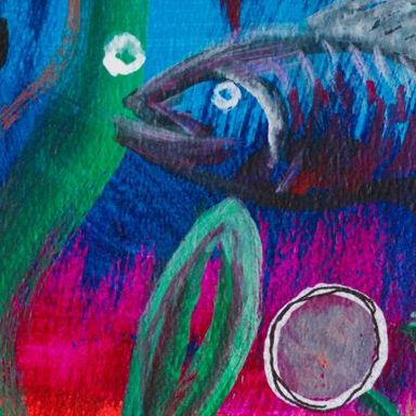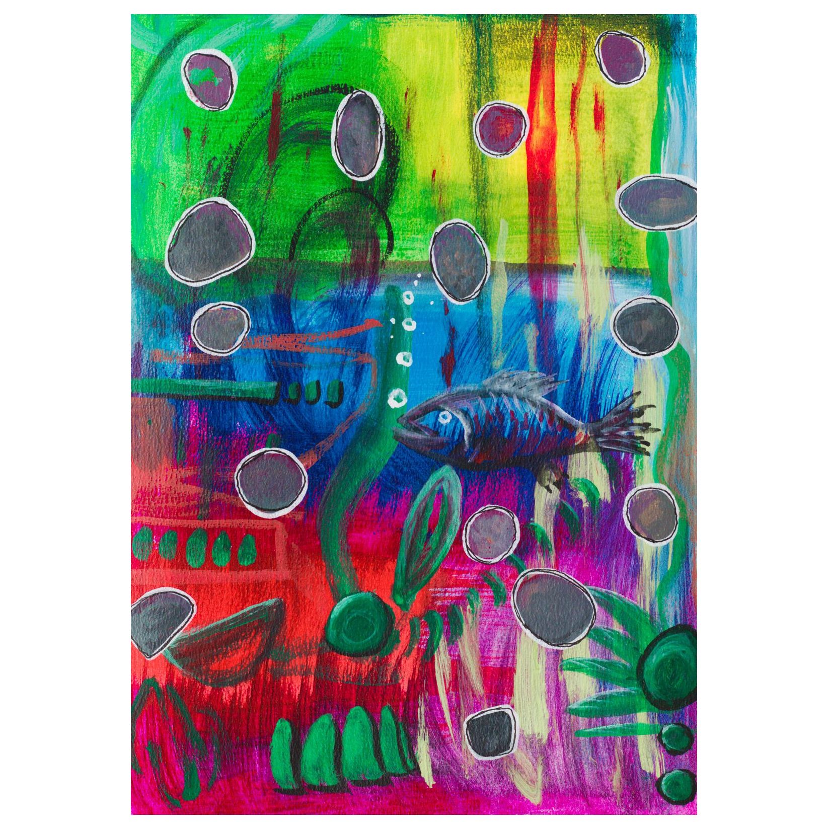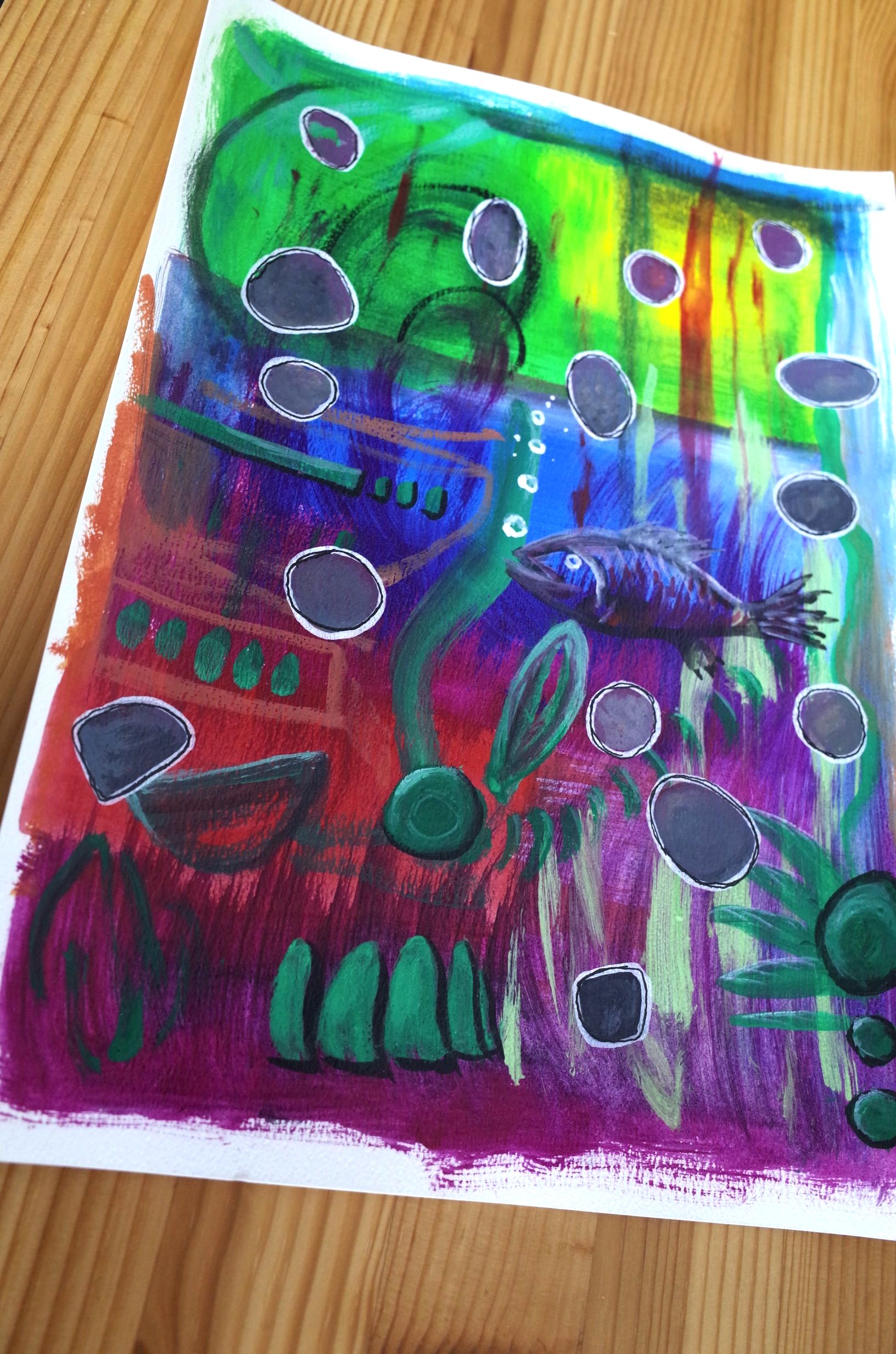 アクリル絵の具とマーカーを使って透明感のある中にマットなモチーフと魚をくわえ、カラフルに仕上げました。