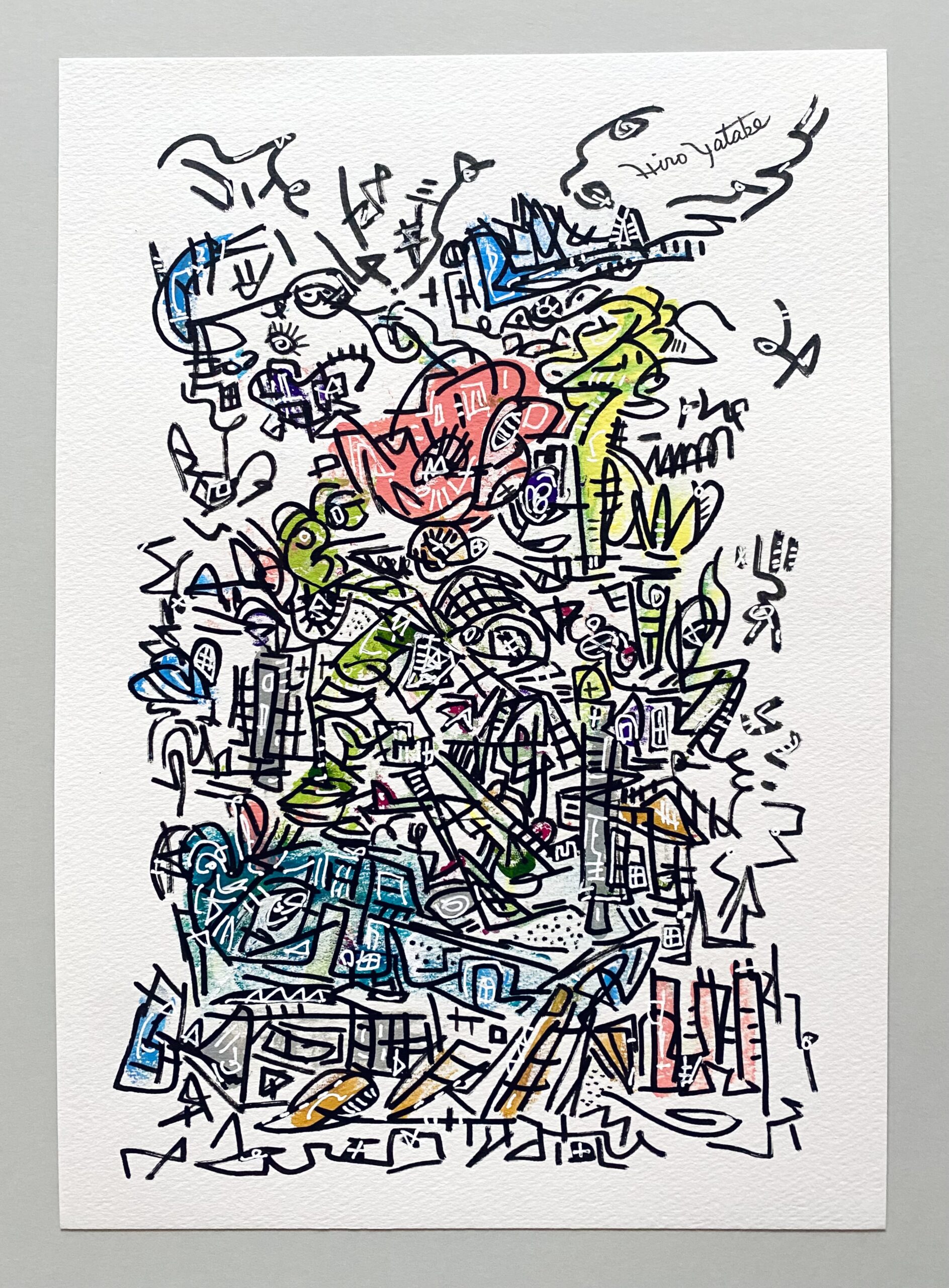 2008年 浮かんだイメージを付箋にボールペンでスケッチ。2012年になりそれをまとめたものを知人に見せたところサイズや画材をかえて絵画として発表することを勧められ、2013年、公募展にA4サイズのカードボードにペン・パステルで描いた作品を出品。その後アクリル絵具での創作をスタート。