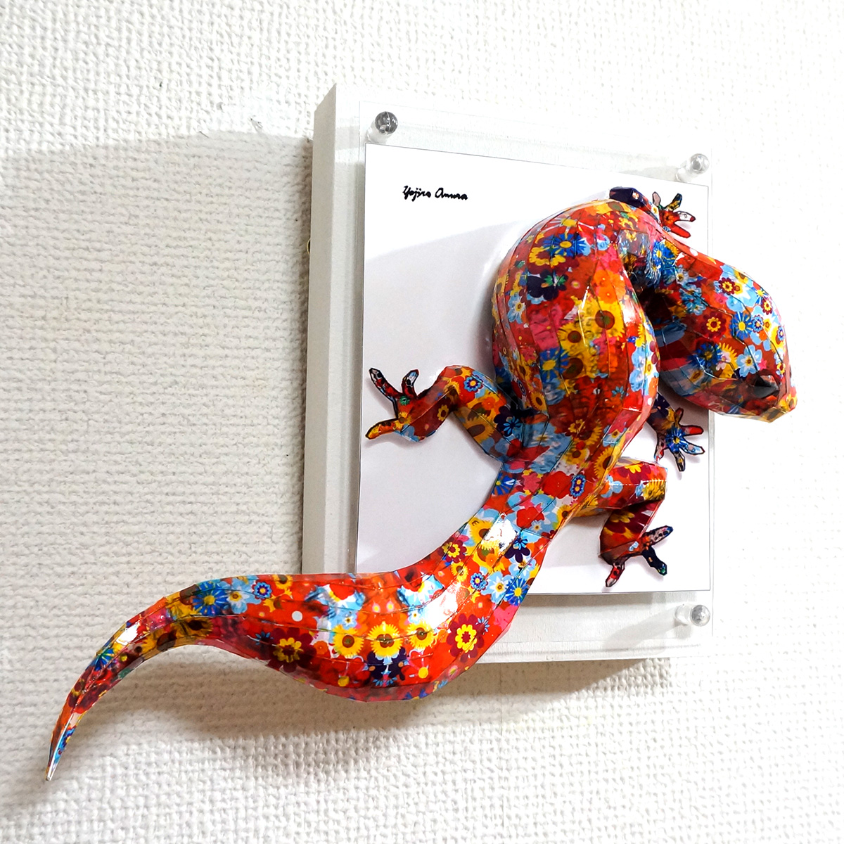 表面上はカラフルな花柄模様をトカゲ本来の表情と重ね合わせたデザインです。表面上は光沢紙の艶のある質感となっております。