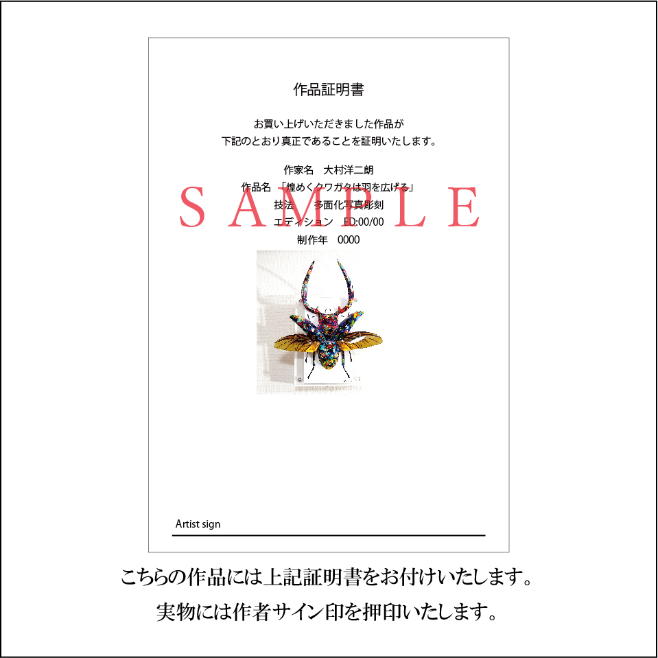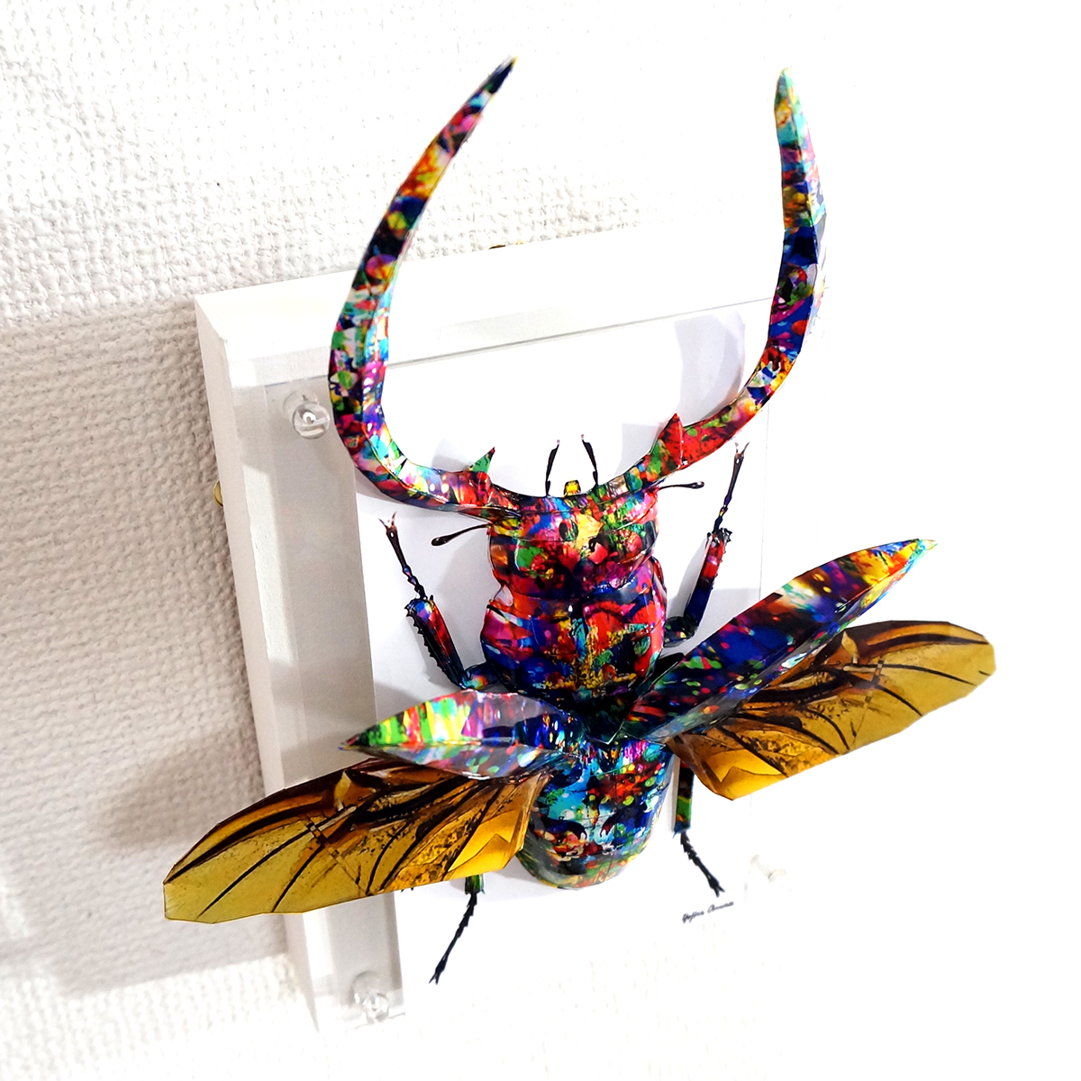 煌びやかでカラフルなイメージの模様をクワガタ本来の風合いに重ね合わせたデザインです。表面上は光沢紙の艶のある質感となっております。