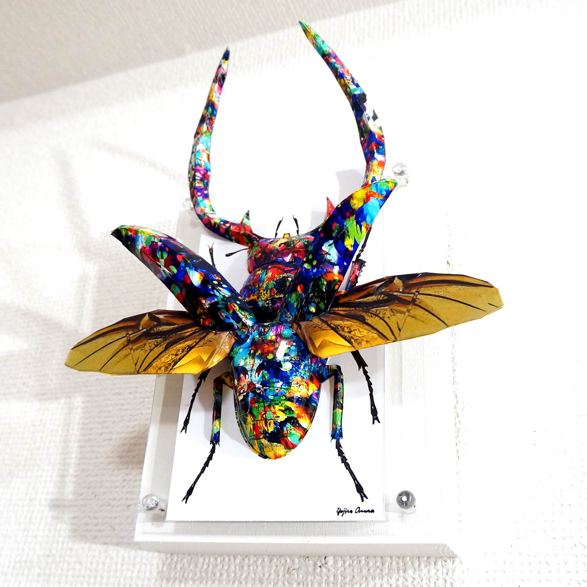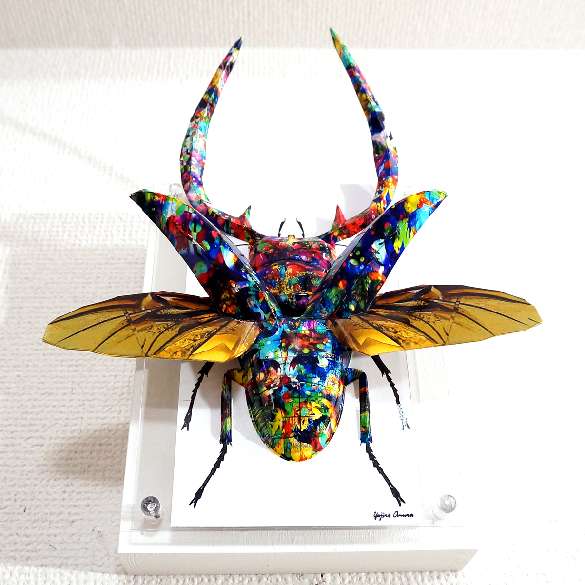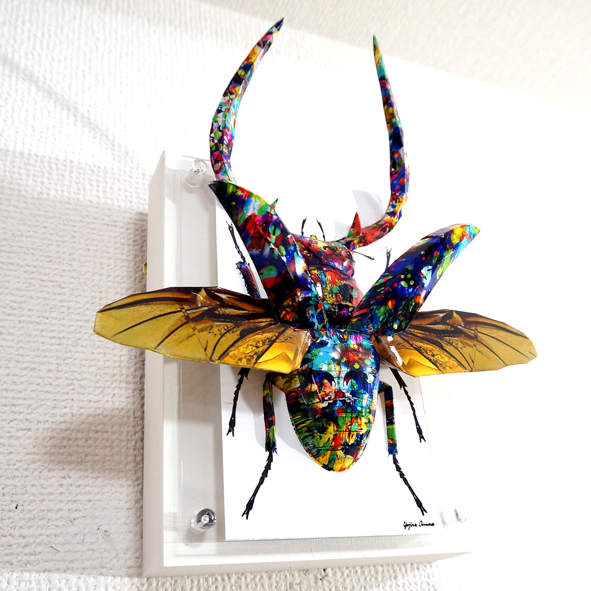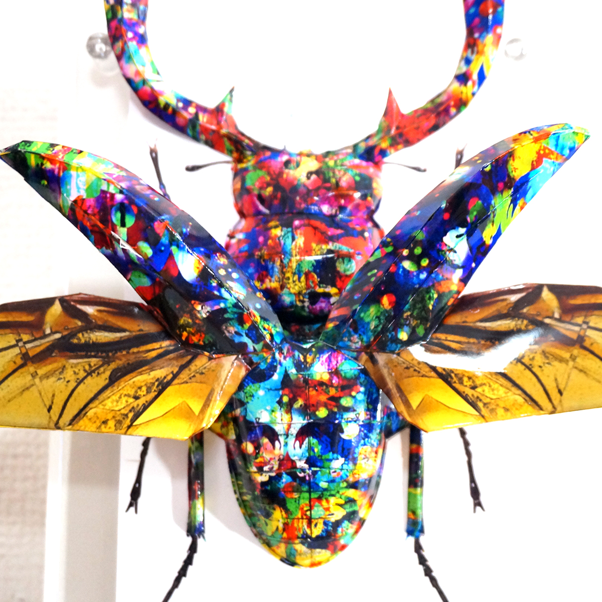 ペーパークラフト技術を用いてクワガタのコラージュ画像を立体的に表現した作品です。