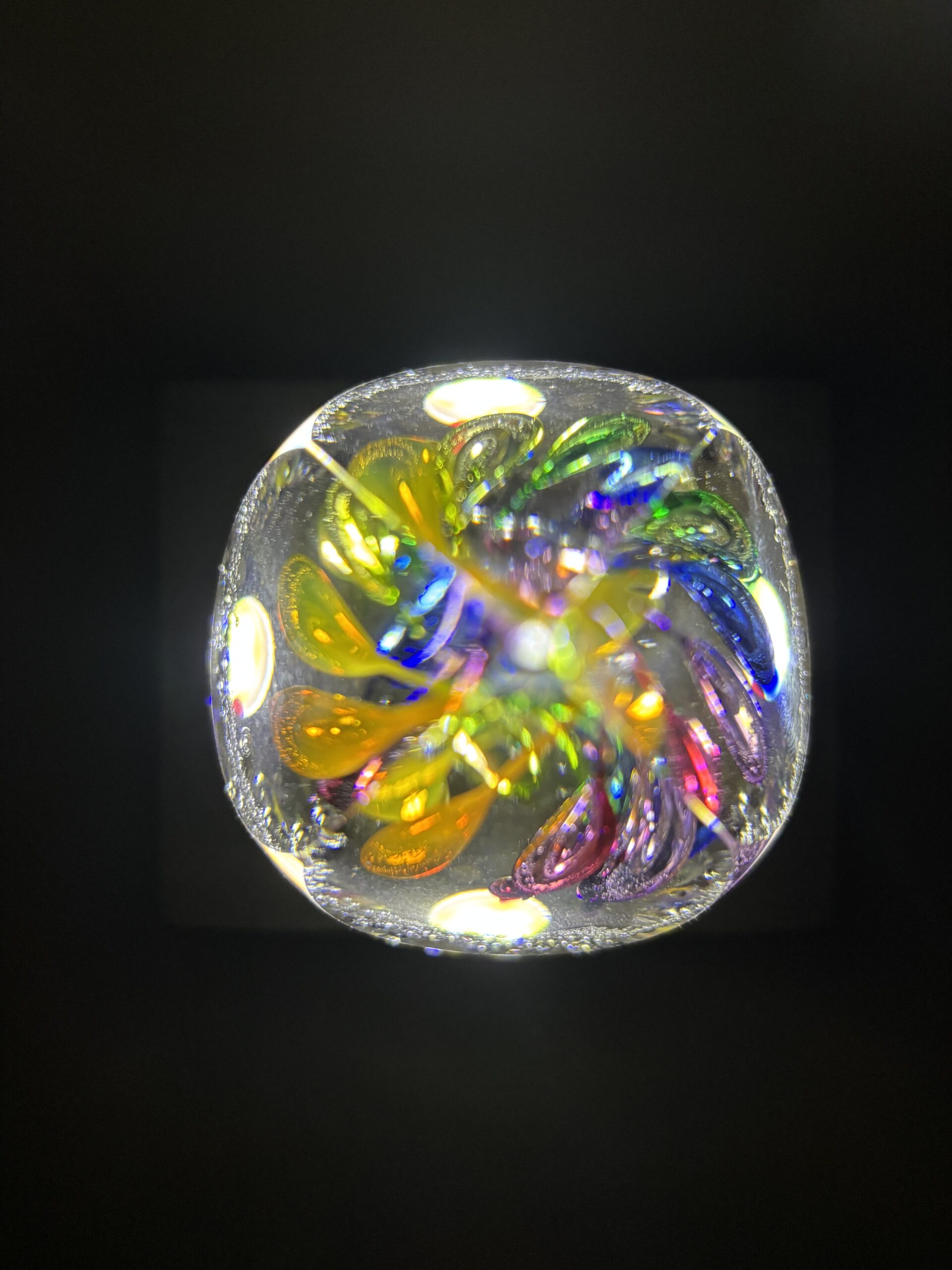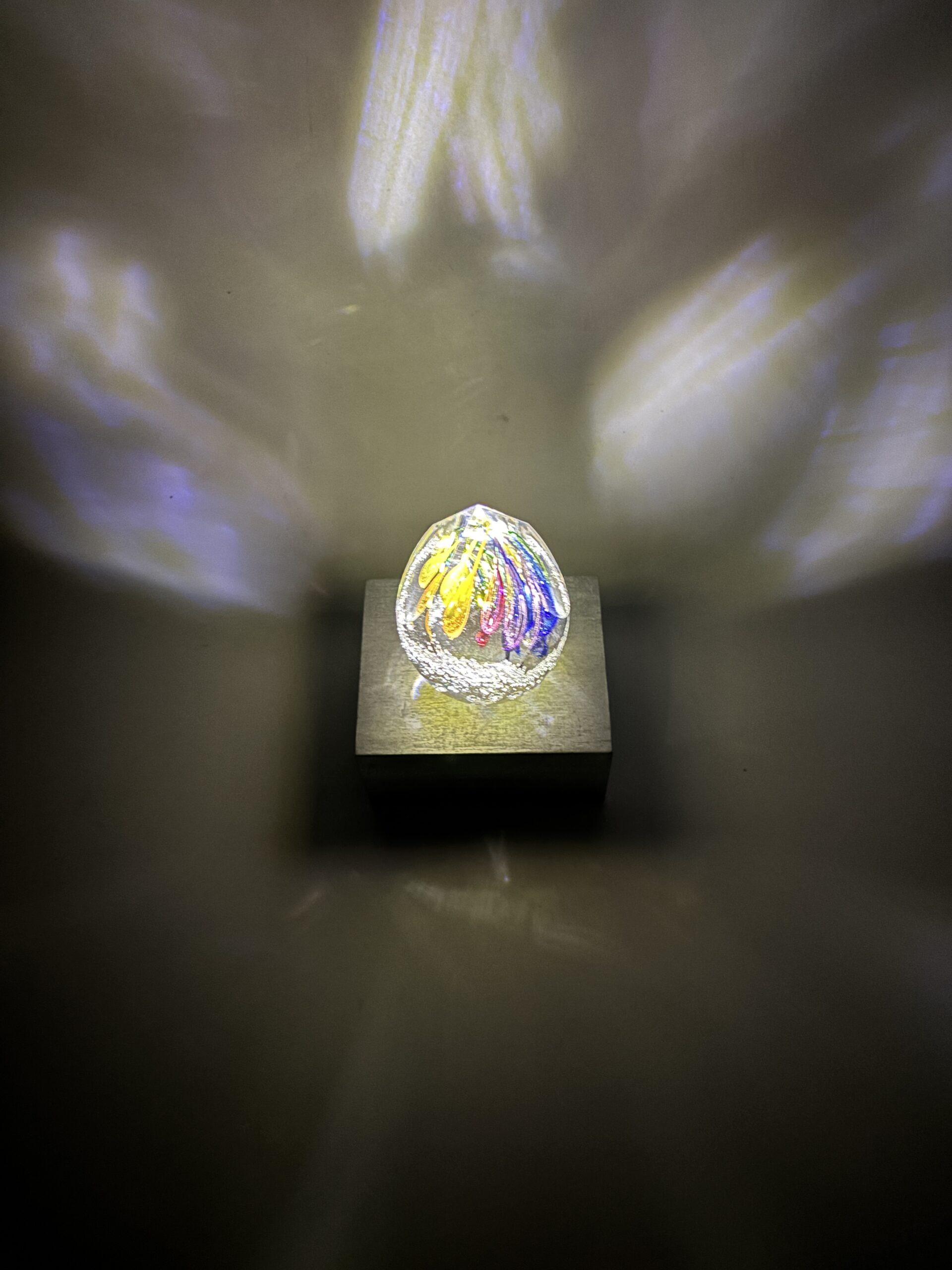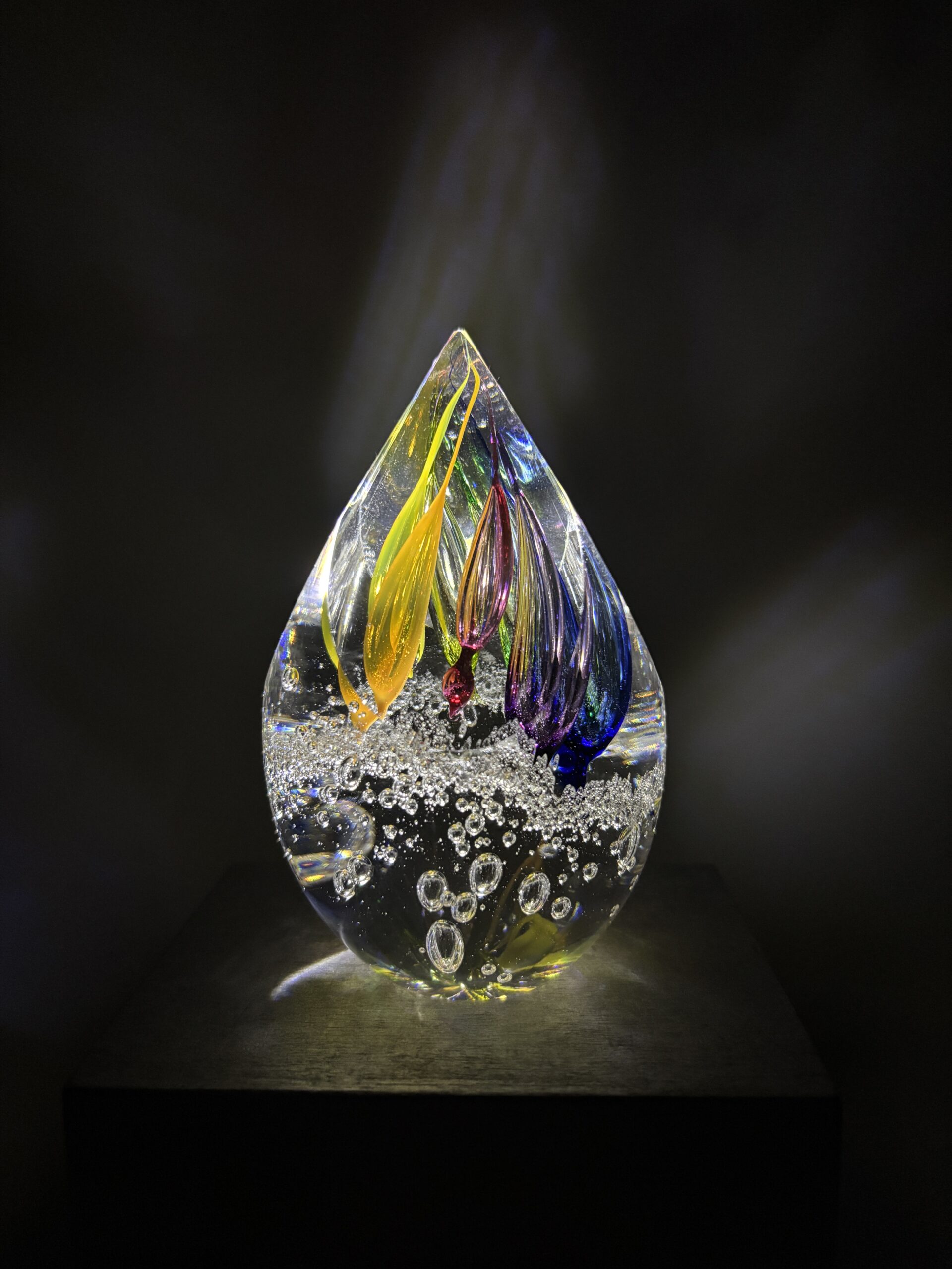 たまご型の上部をピラミッド型カットして、7色のガラスの気泡が下の方から上に上がって来る様。