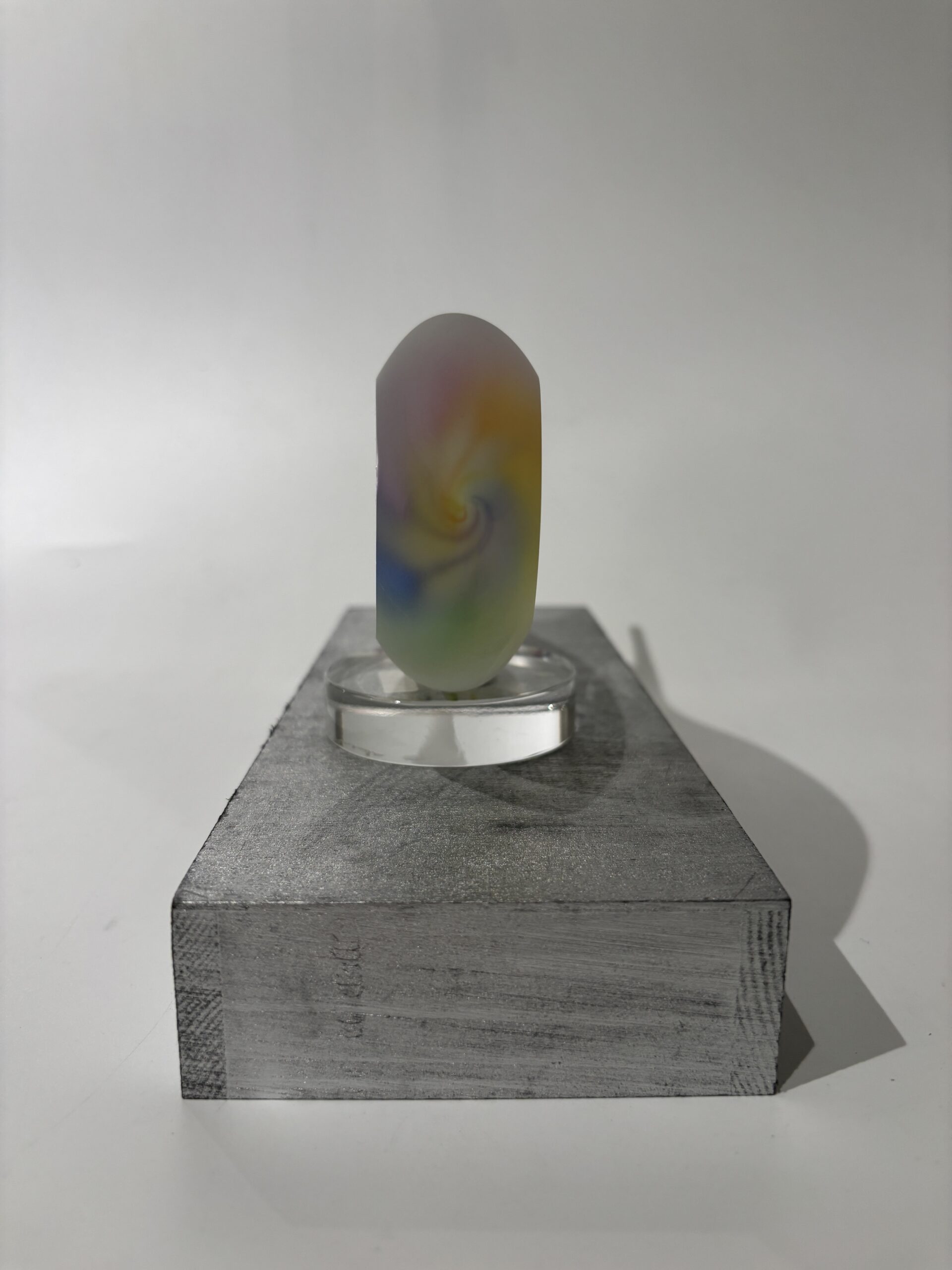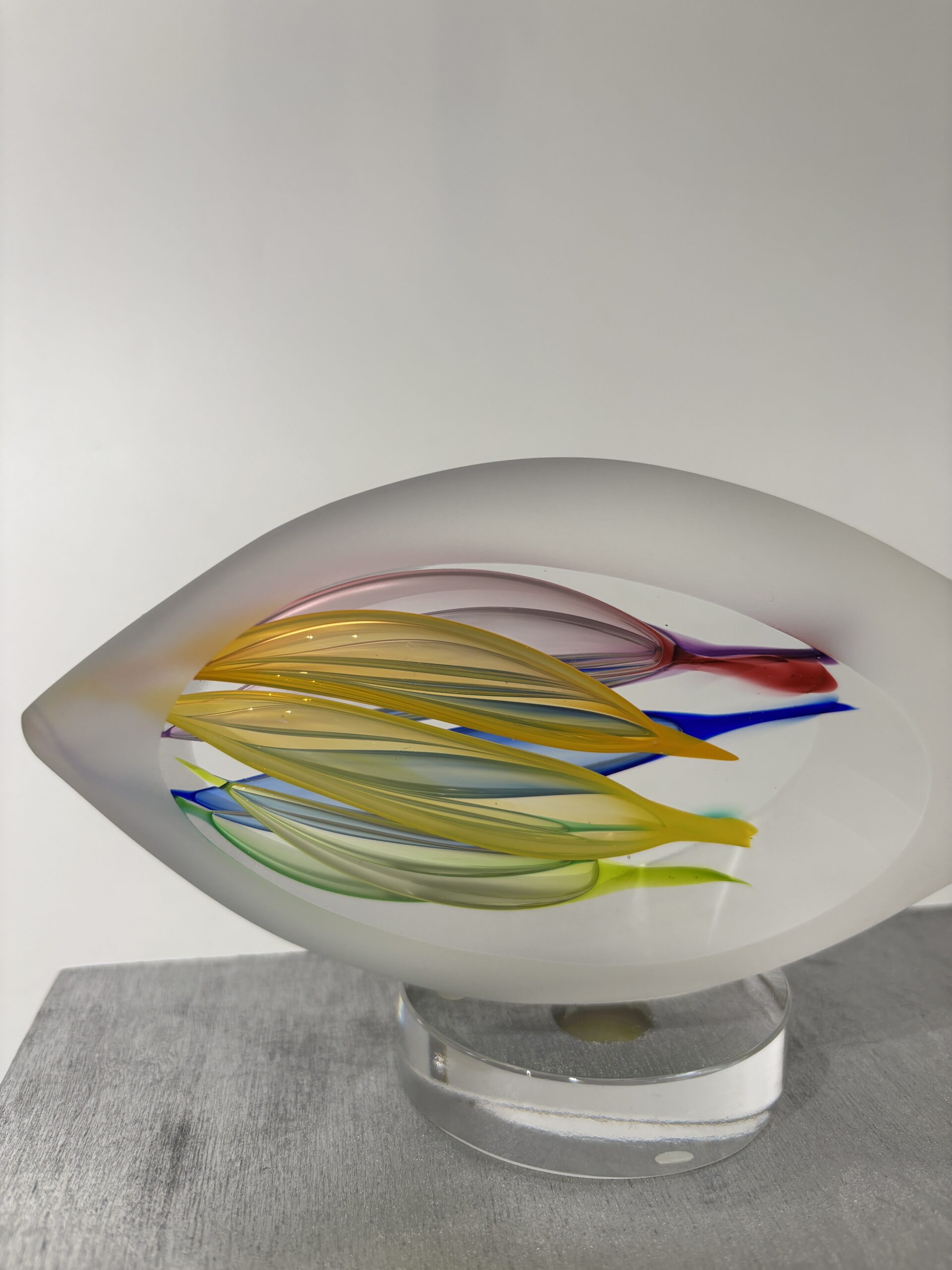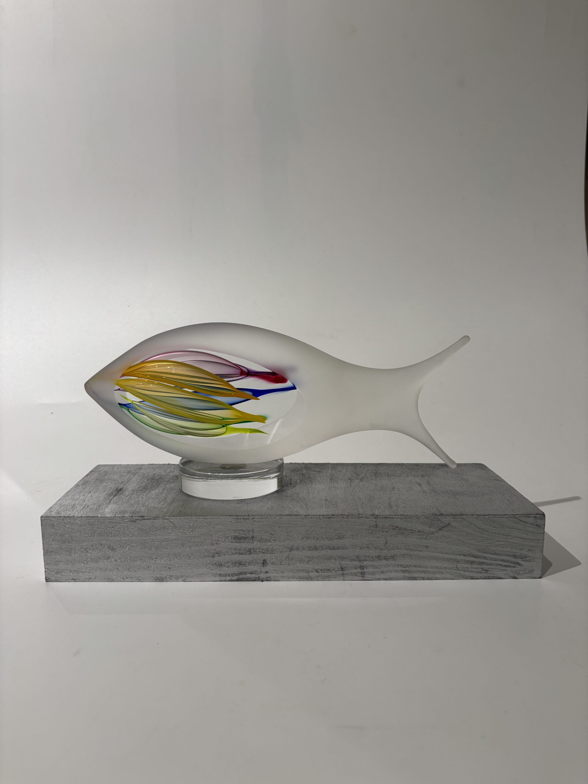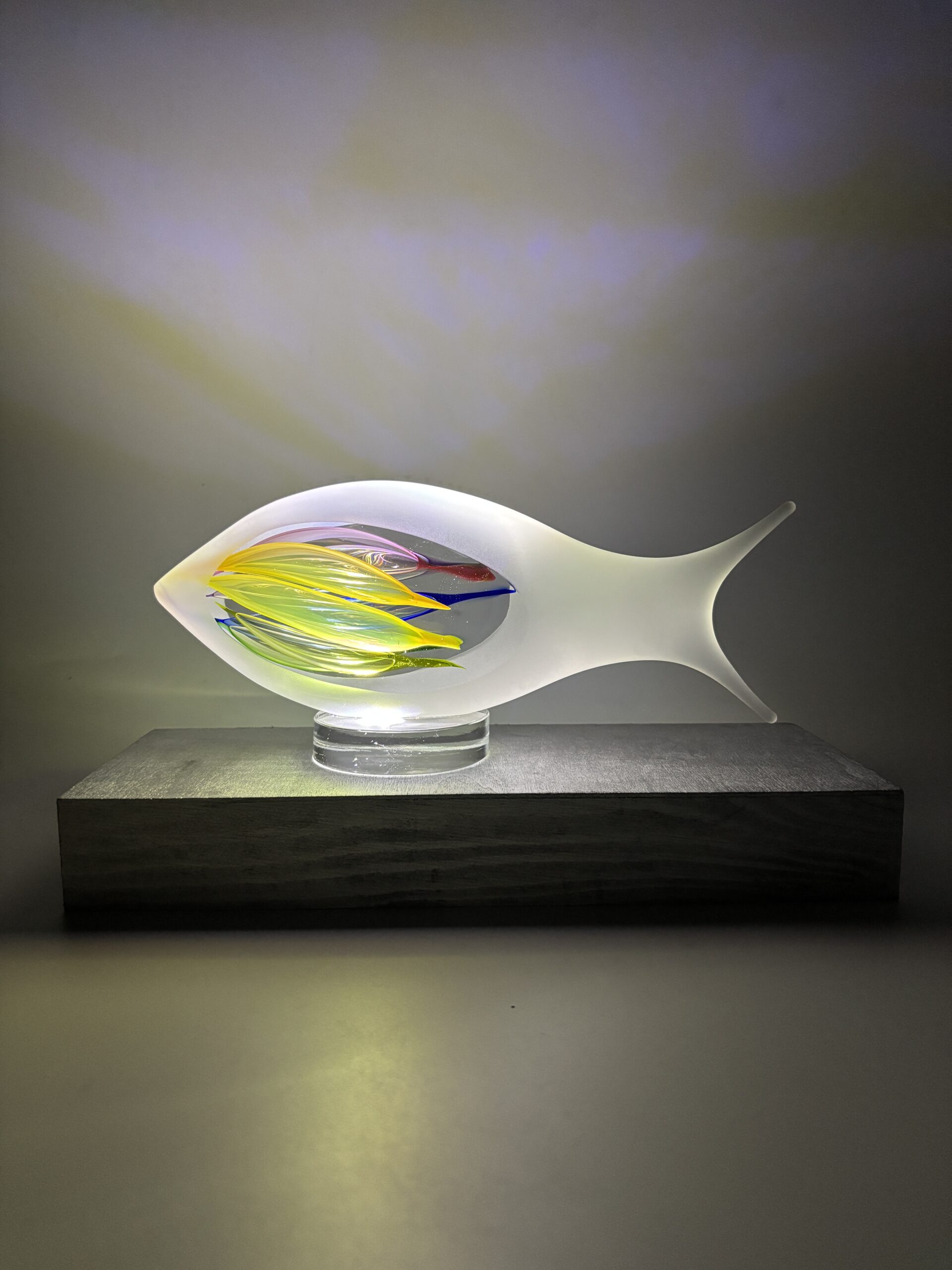 魚の形をガラスで作り、中に7色の泡が魚の様に入る。外側をサンドブラスト加工をして2面をカット。下の台付き。電池式のライトが付いて照明の様にもなる。