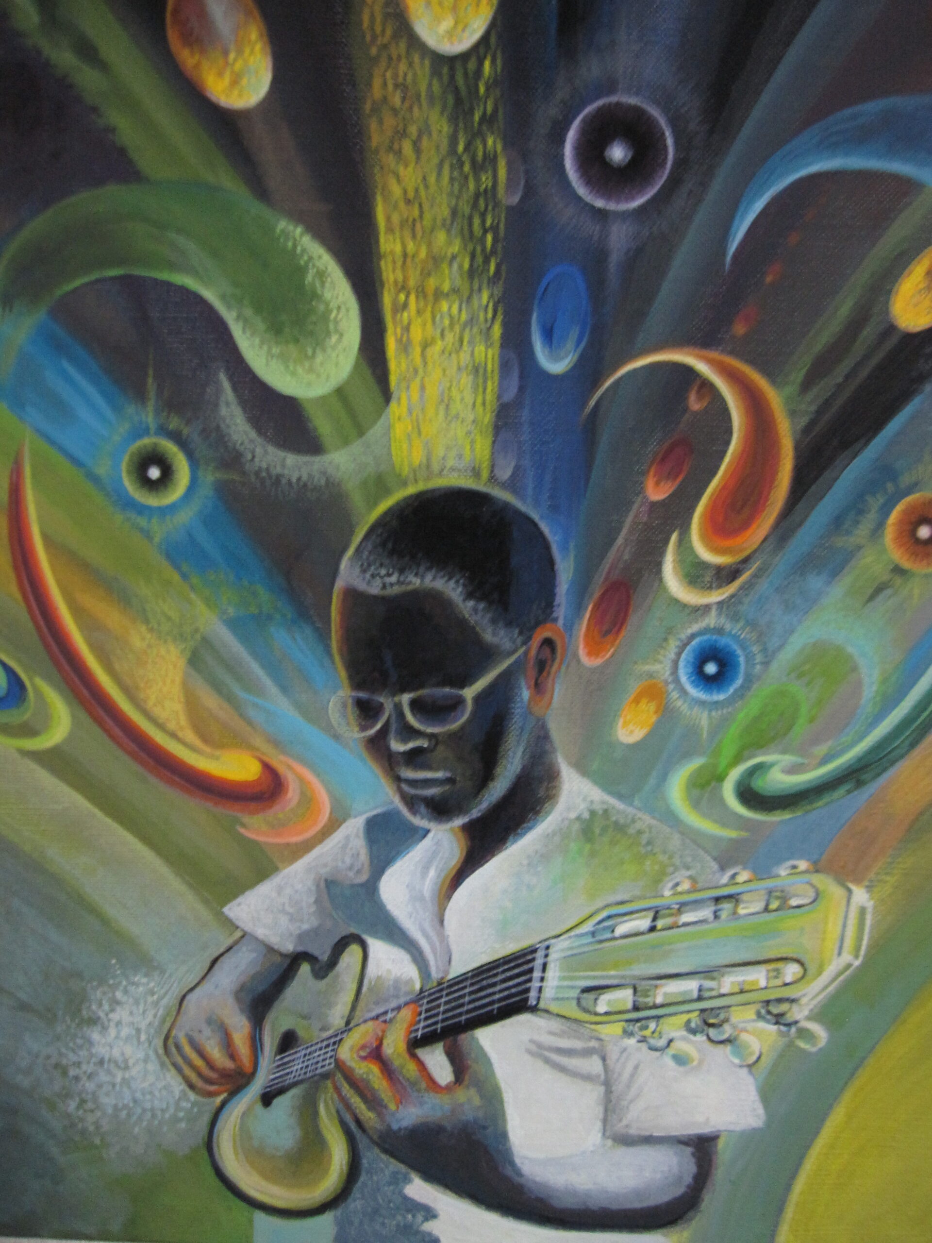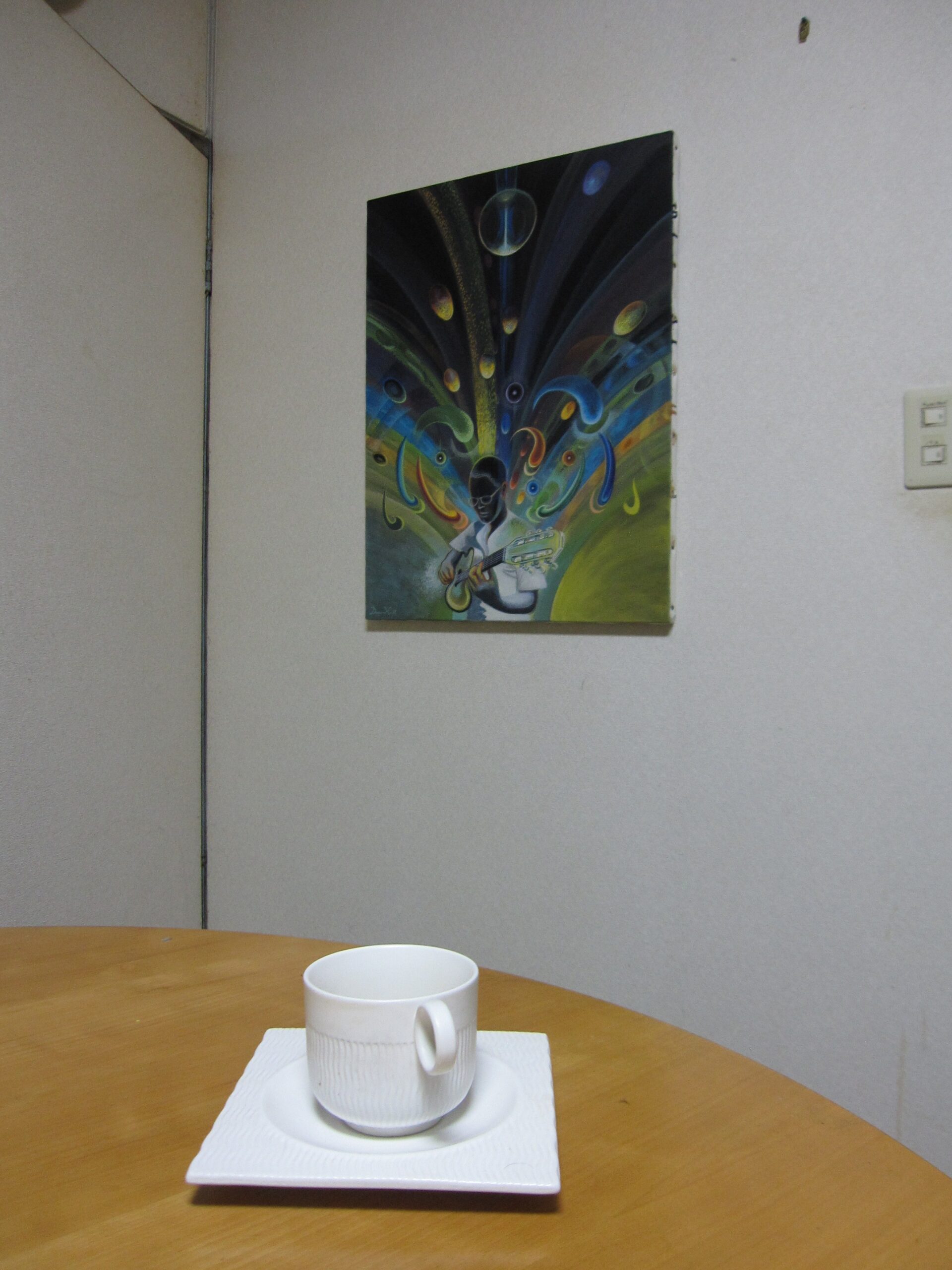 音楽家の魂を描くシリーズの1枚。安倍一城さんは、日本でも有数のジャズギタリストで、マイルスデイビスの名作・マイルストーンのサビを奏でている瞬間の魂のかたちをイメージしました。