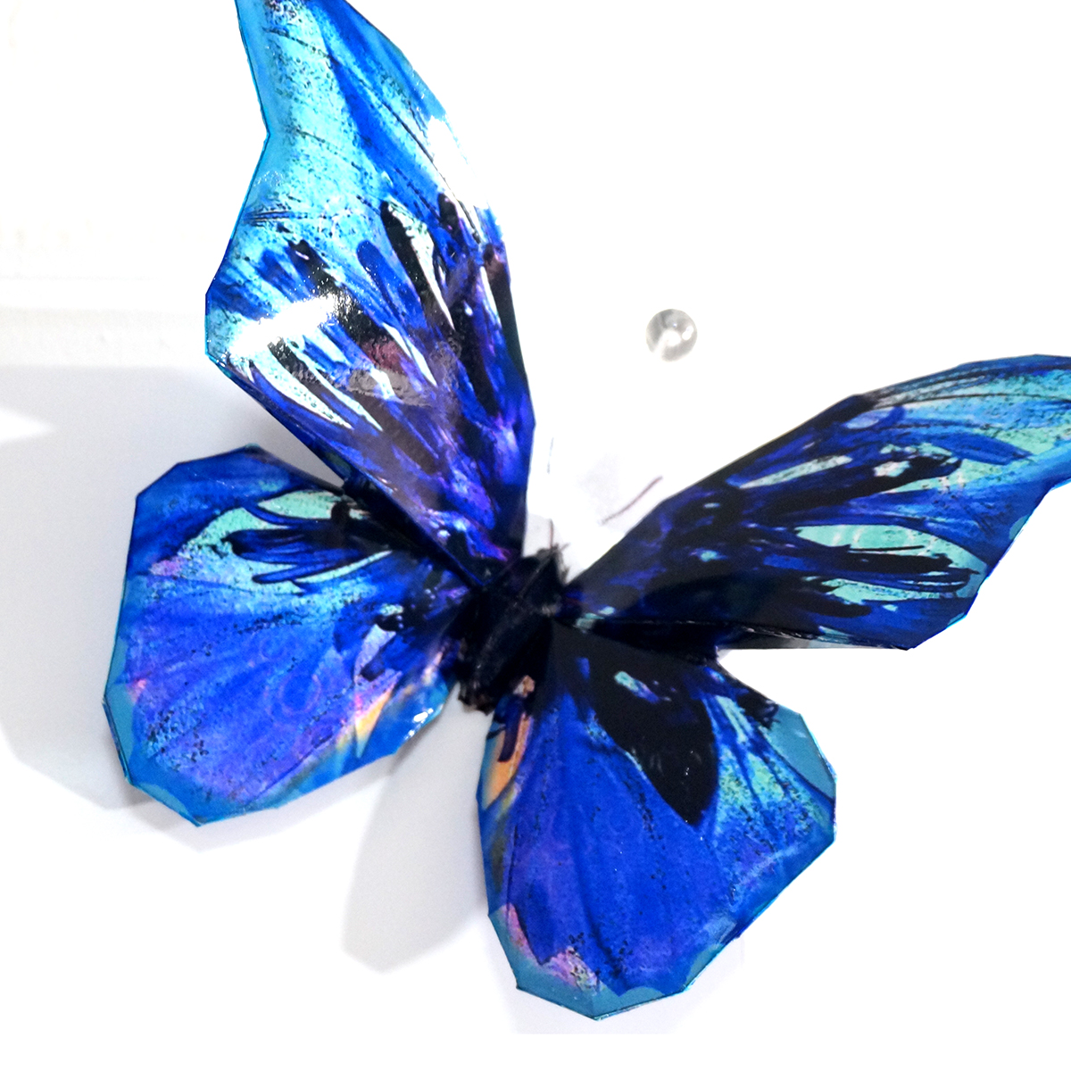 蝶々のコラージュ画像を作成しペーパークラフト技術を用いて立体的に表現した作品です。