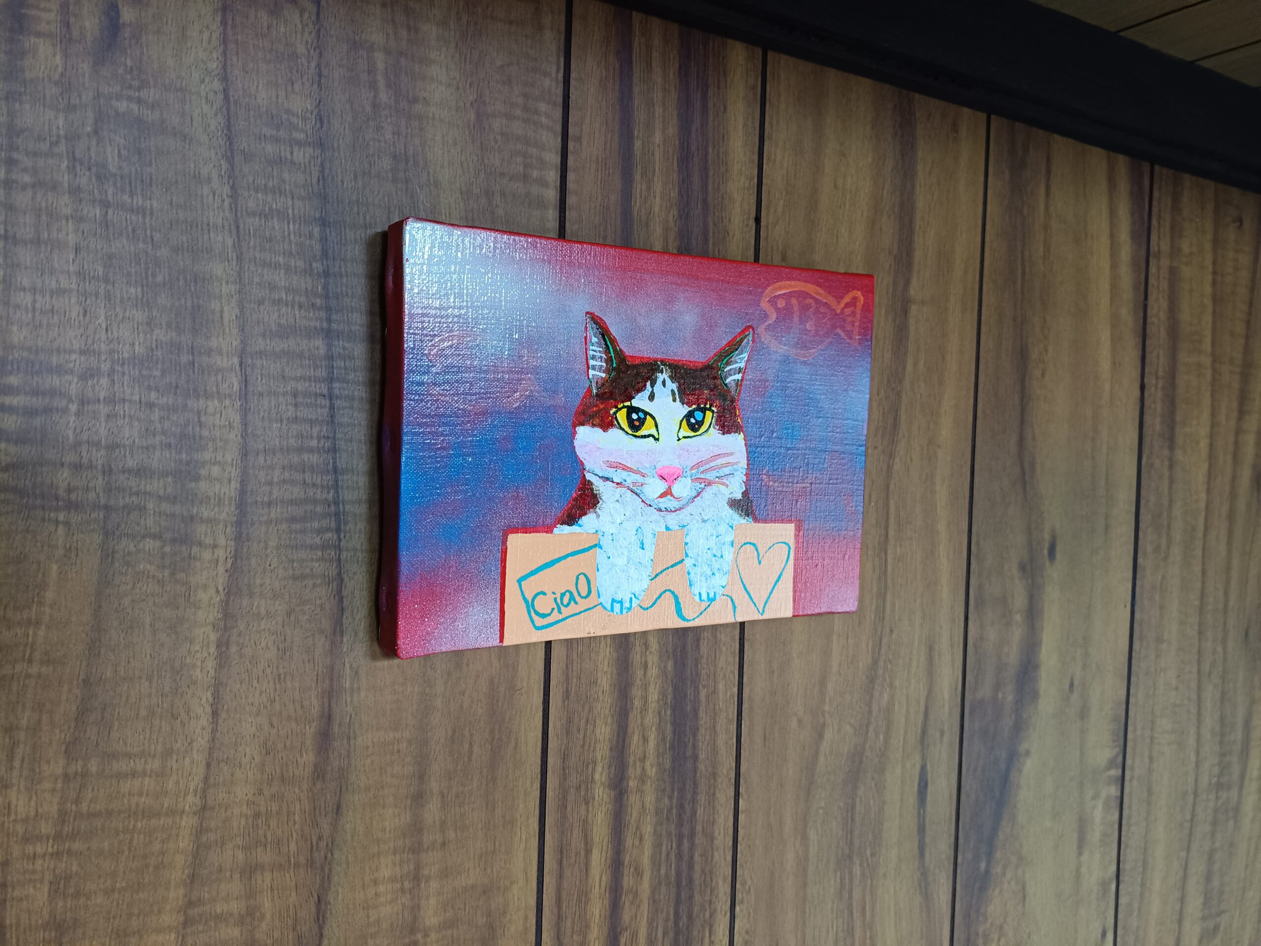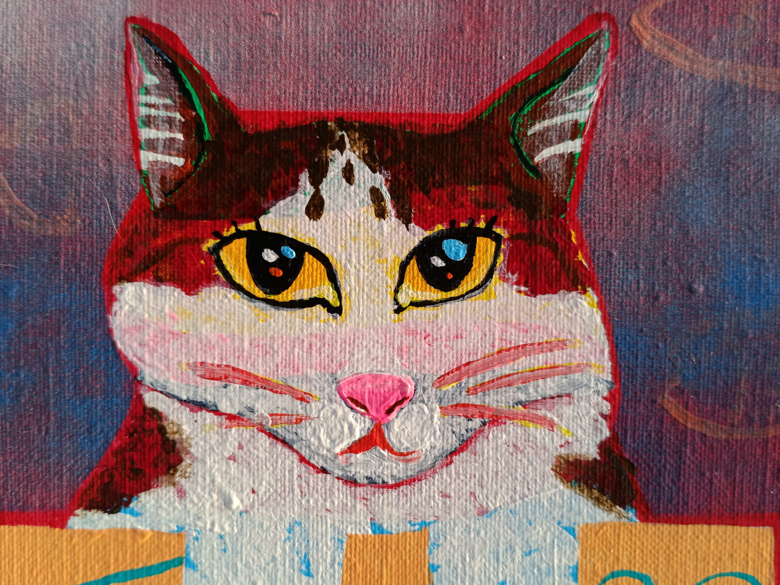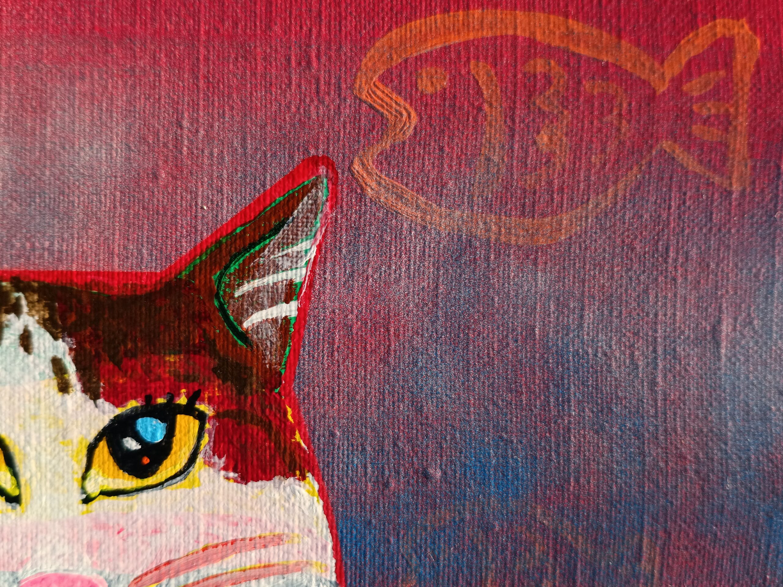 この作品には、アクリル、グアッシュ、スプレーを巧みに組み合わせ、遊び心のあるポップアートの精神と抽象的な感覚を融合させ、躍動感あふれるエネルギーを注ぎ込みました。猫の気まぐれな視線は温かさと好奇心を誘い、滴る水の質感は人生の予測不可能さを表現しています。この作品は喜びを放ち、どんな空間にも温かく愛情深い雰囲気をもたらします。魅力と自発性を称えるこの作品は、心からの喜びで周囲を活気づけます。