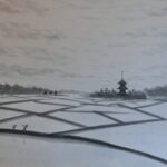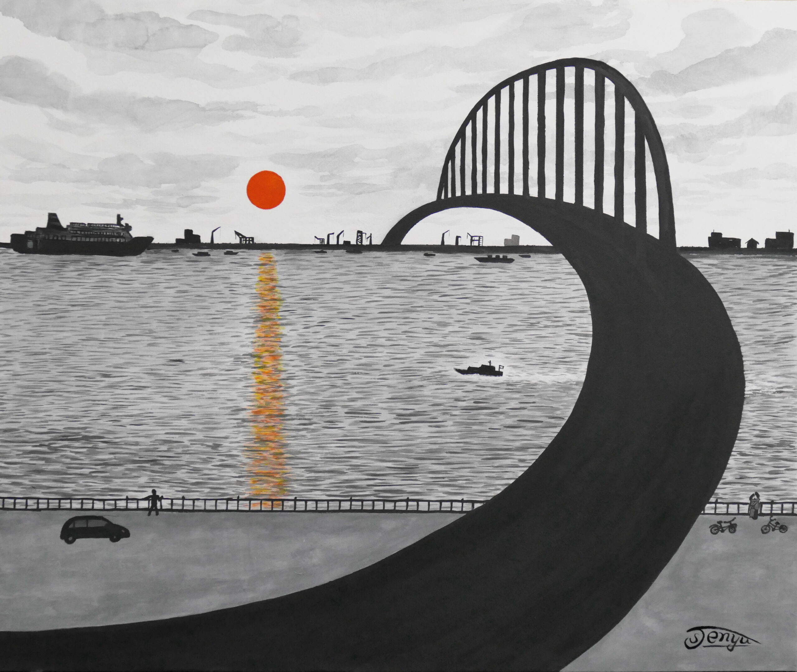 大橋を龍の如く誇張表現し、港に沈む夕陽に向かう様を心象表現した作品