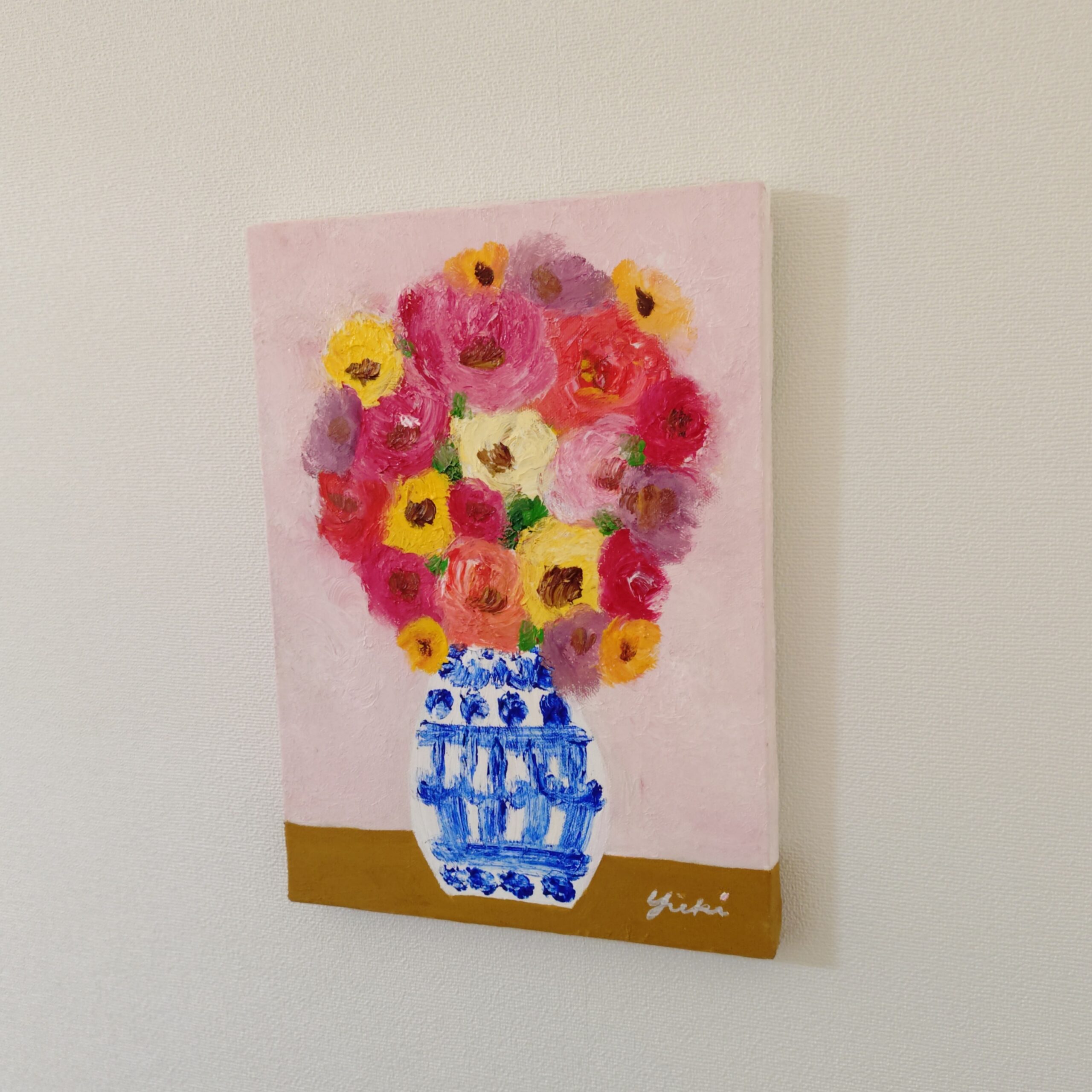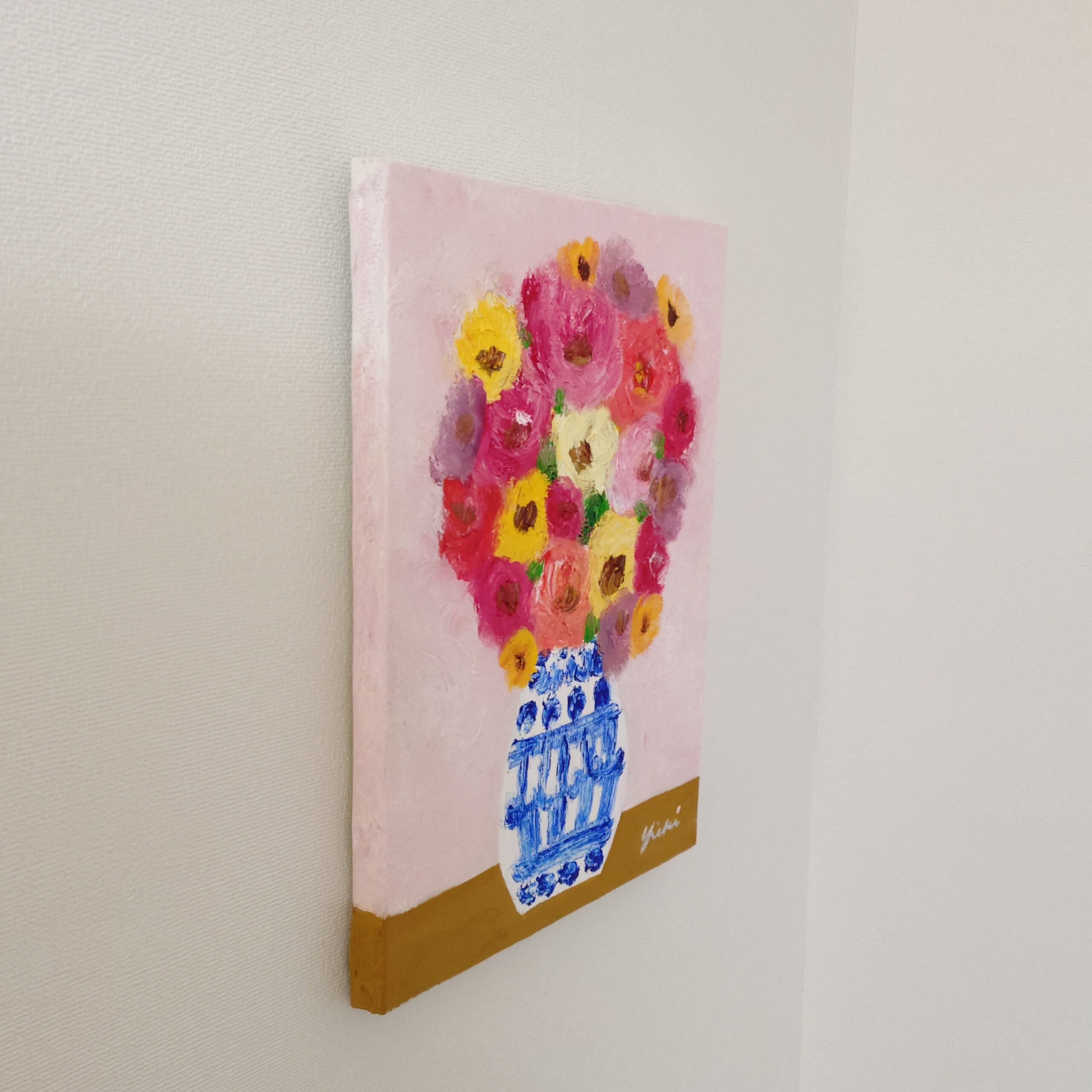 花瓶の花 静かな午後という作品は私がお仕事の合間に描く作品です。静かな午後、心静かに油彩と向き合い静かな時間を過ごすことが最近の私の主なルーティンとなっています。お花を飾ってその時その時違う表情を見せてくれる愛らしい花たちを眺めながら一作品一作品描いています。
