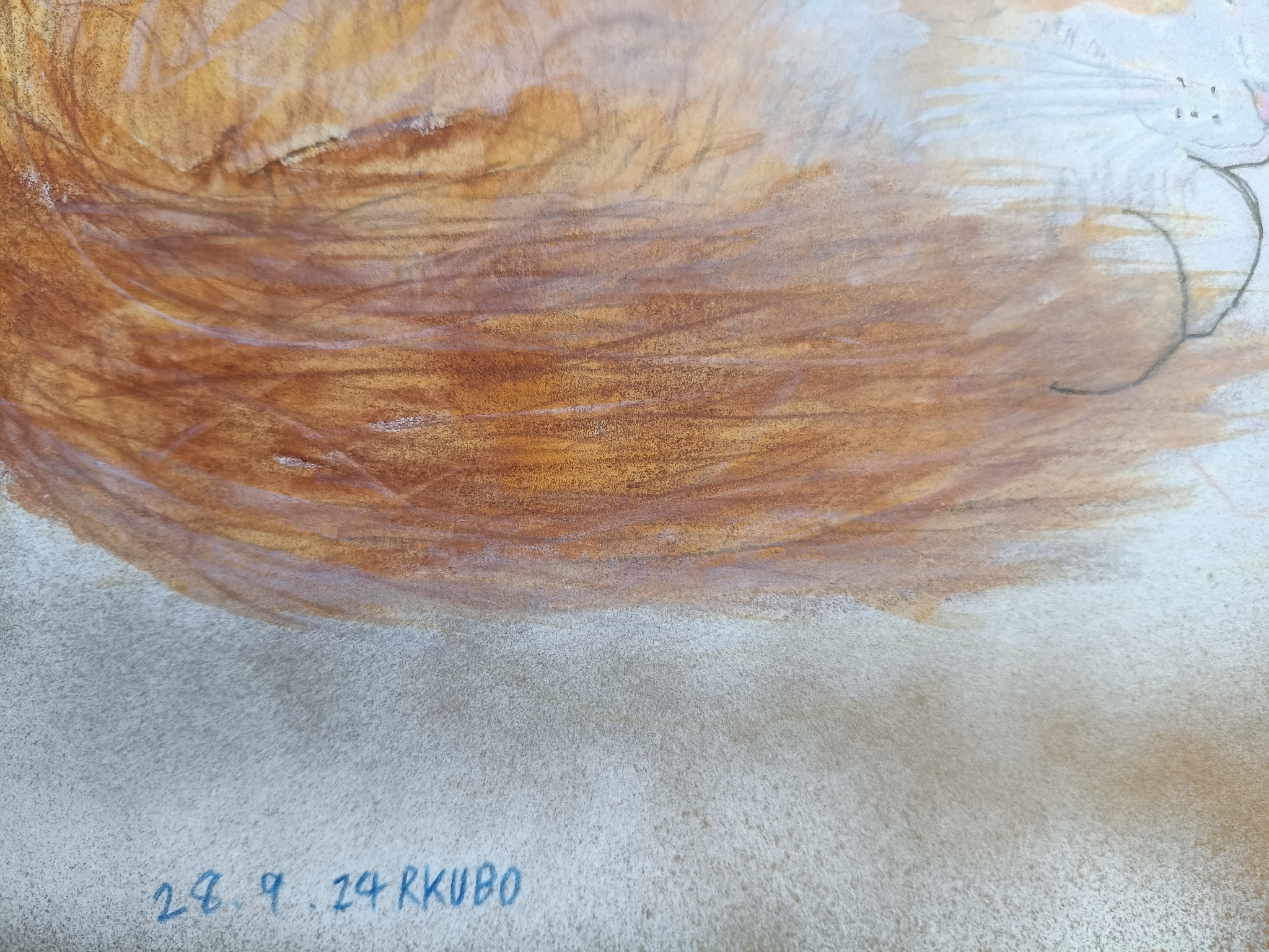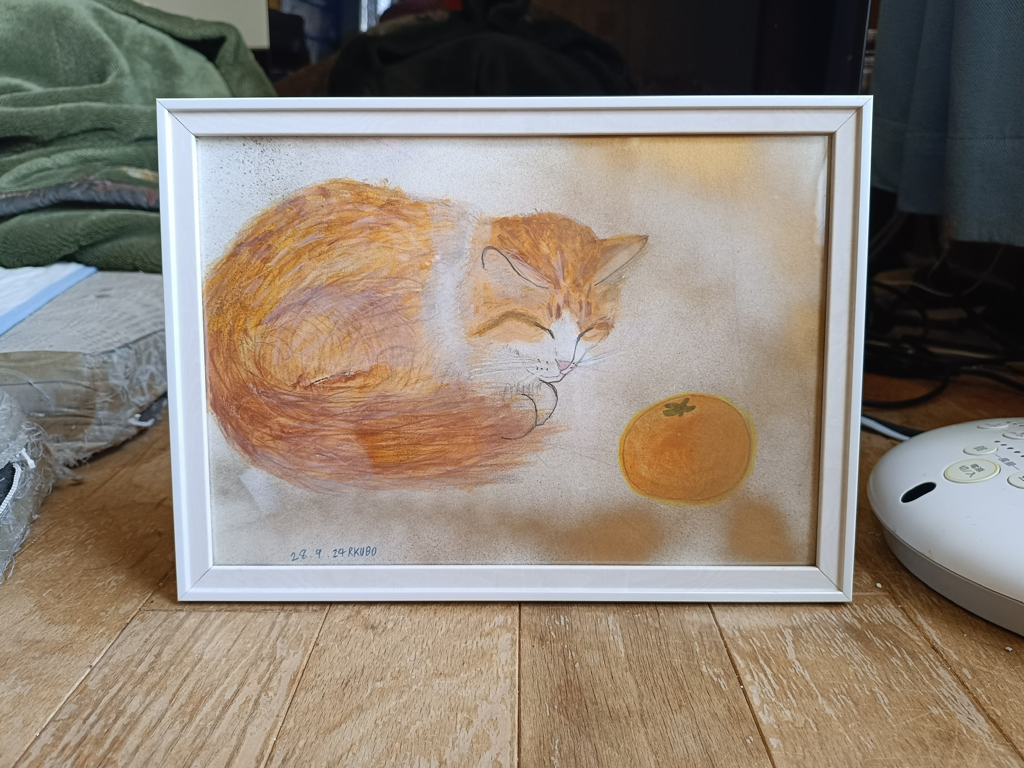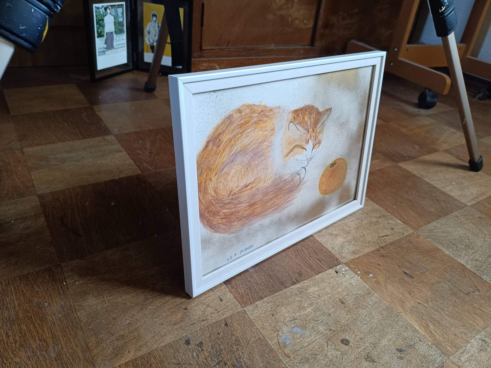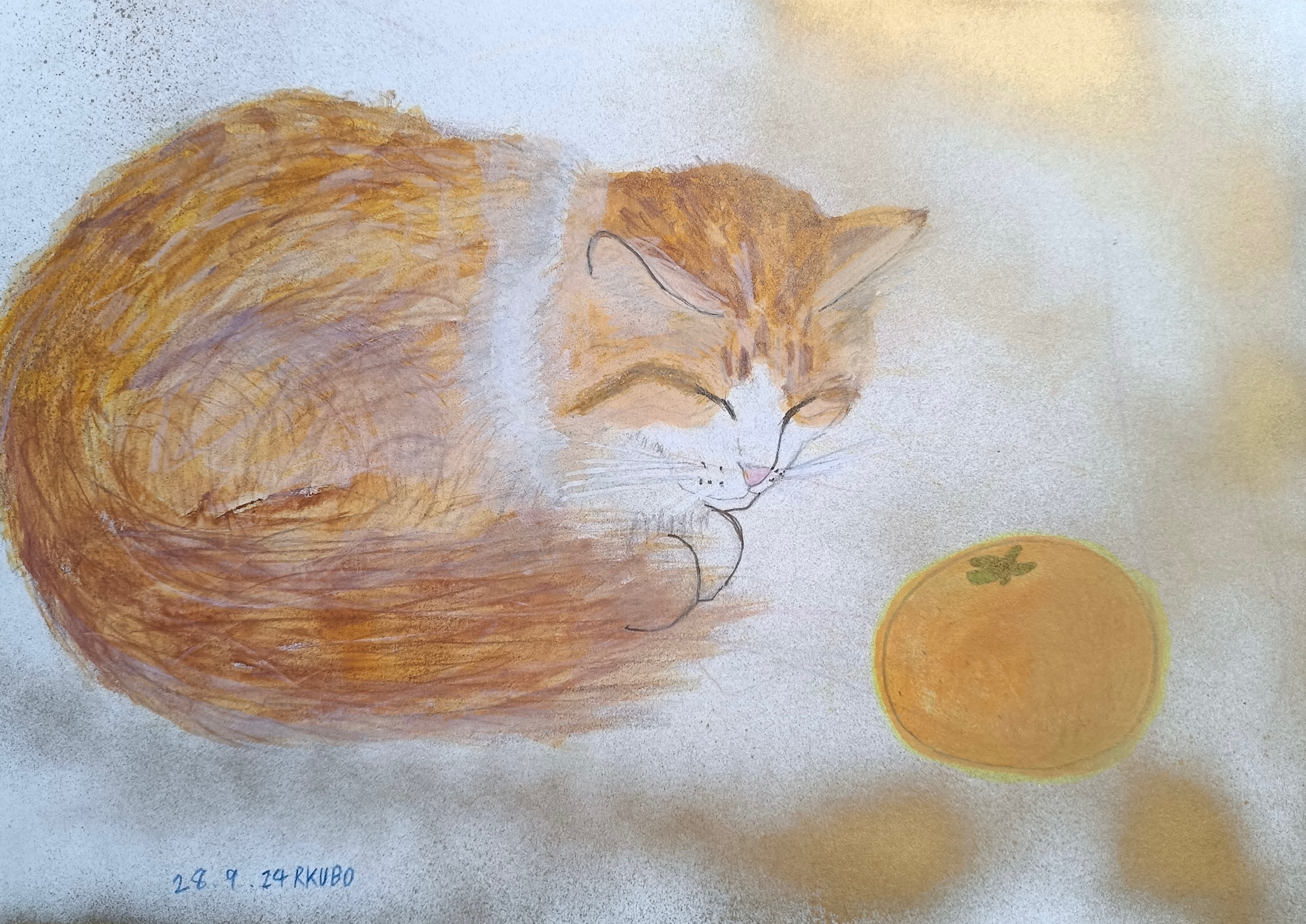 この作品では、水彩、色鉛筆、スプレーを巧みに組み合わせ、一筆一筆に温かさと静けさを込め、鮮やかなオレンジの横で眠る猫の柔らかな静けさを表現しました。写実的な表現が静寂を誘い、ほのかなポップアートのエネルギーが遊び心のあるコントラストを生み出しています。この作品は、心地よく穏やかな雰囲気を醸し出し、空間を穏やかな安らぎと静かな喜びで満たすのに最適です。