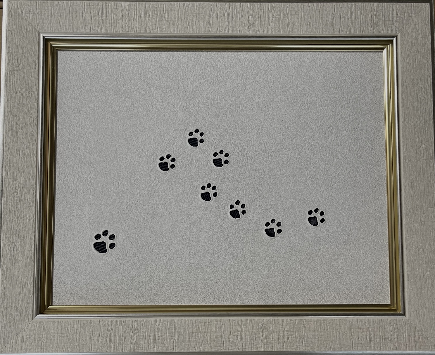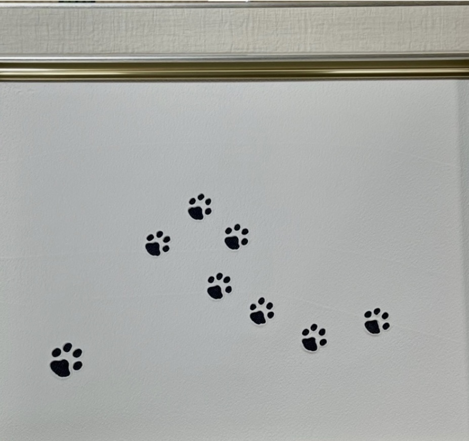 砂骨塗料をベースにし肉球の型取りをしてその後肉球部をくり抜き裏へデニムを貼ったアート作品。