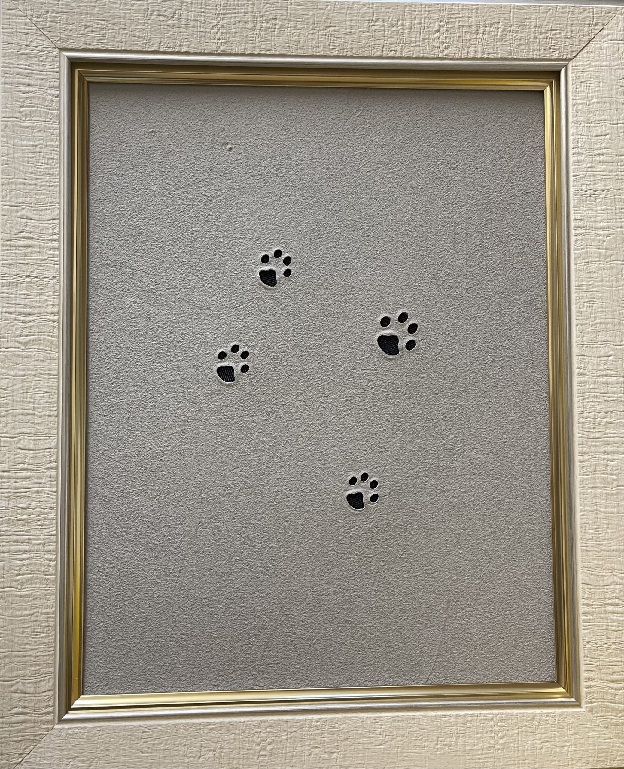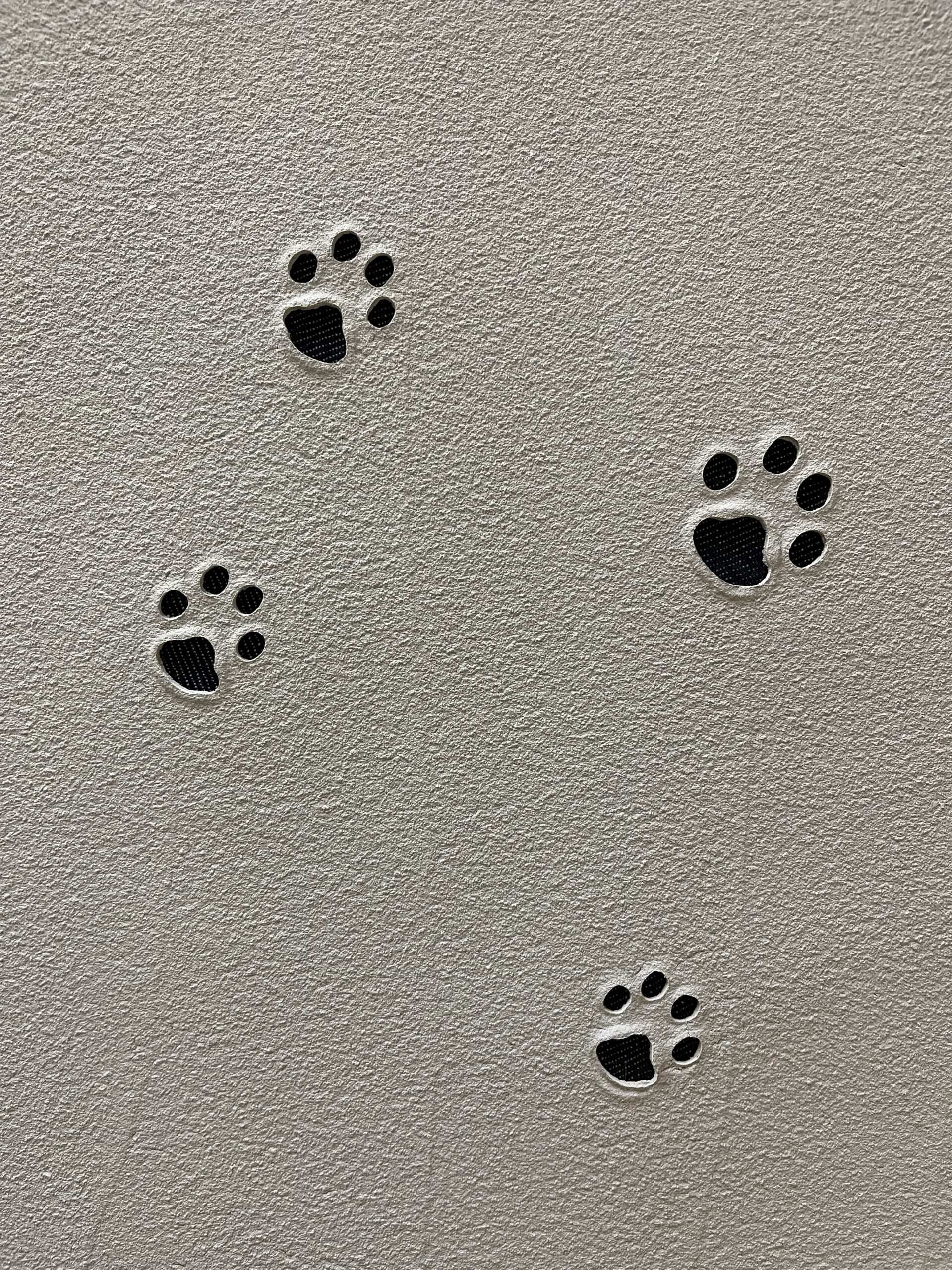 砂骨塗料をベースにし肉球の型取りをしてその後肉球部をくり抜き裏へデニムを貼ったアート作品。