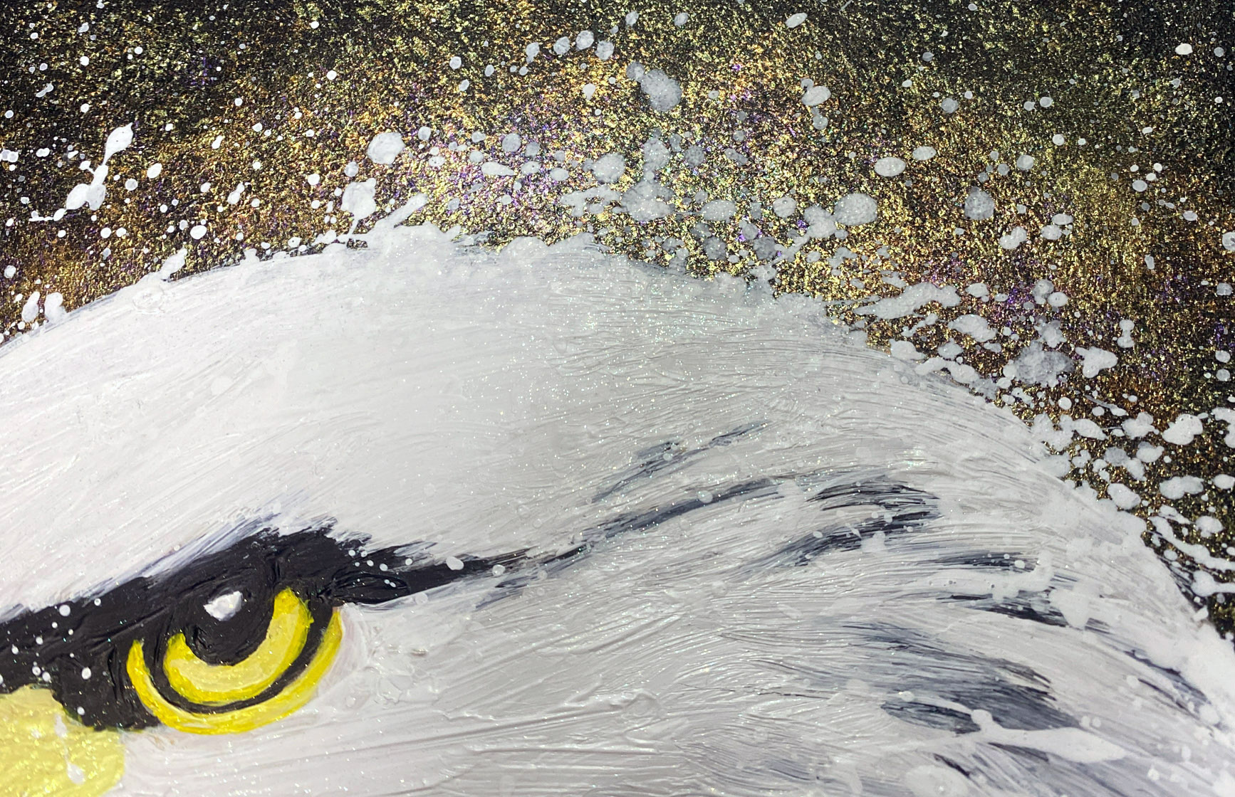 見る角度によって輝き方が変わる特殊なアクリル絵の具を使用しており、画面全体がキラキラと輝きます。