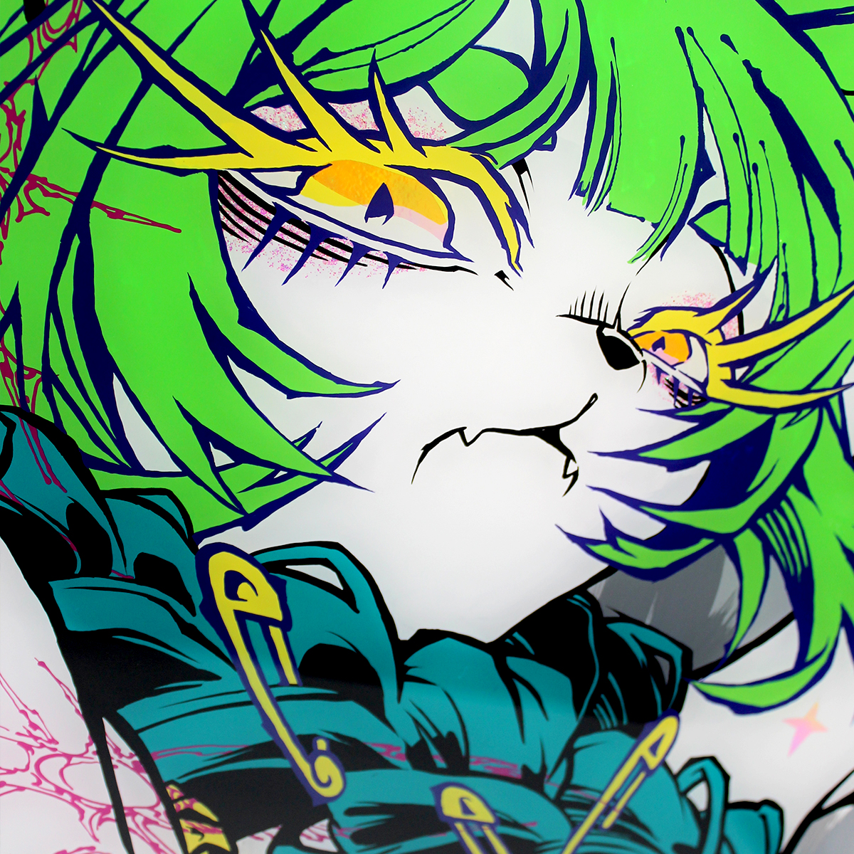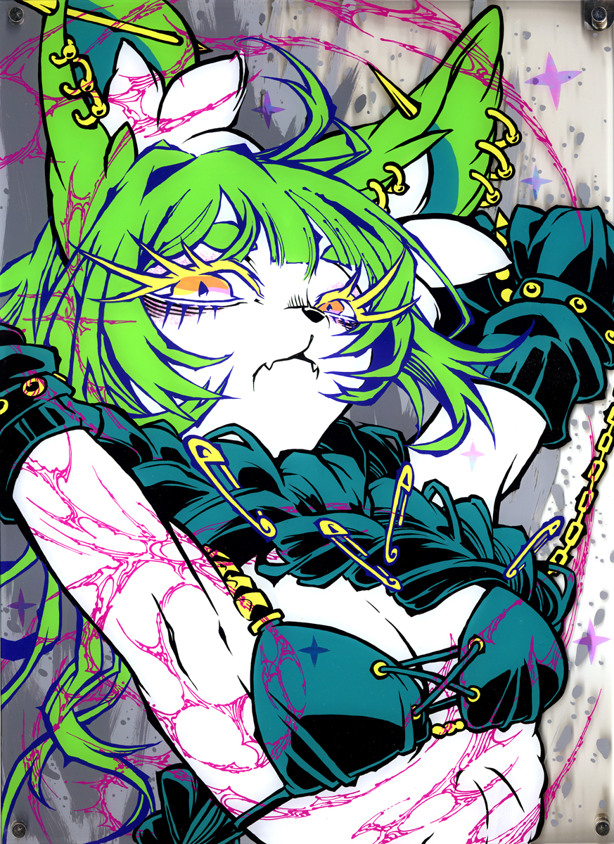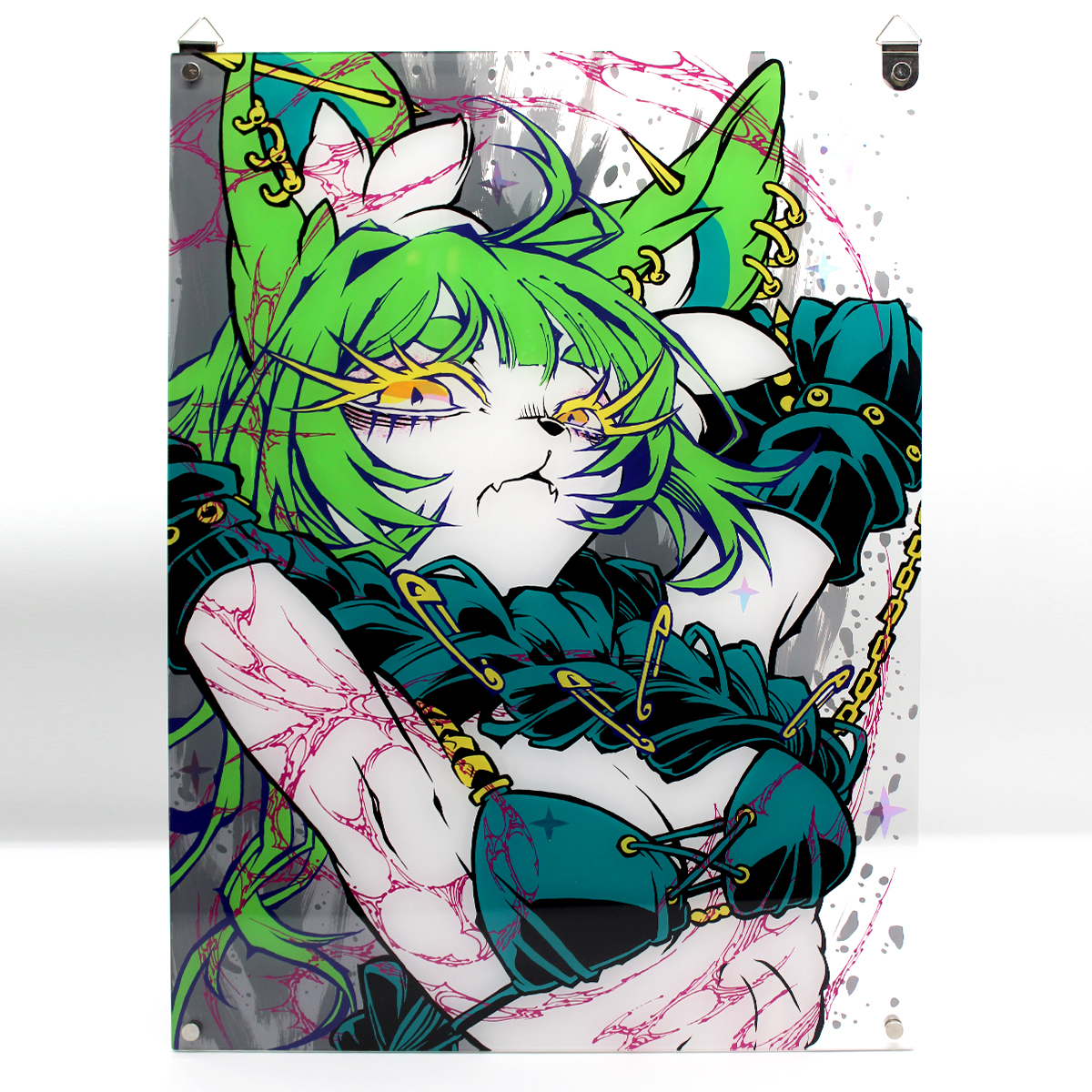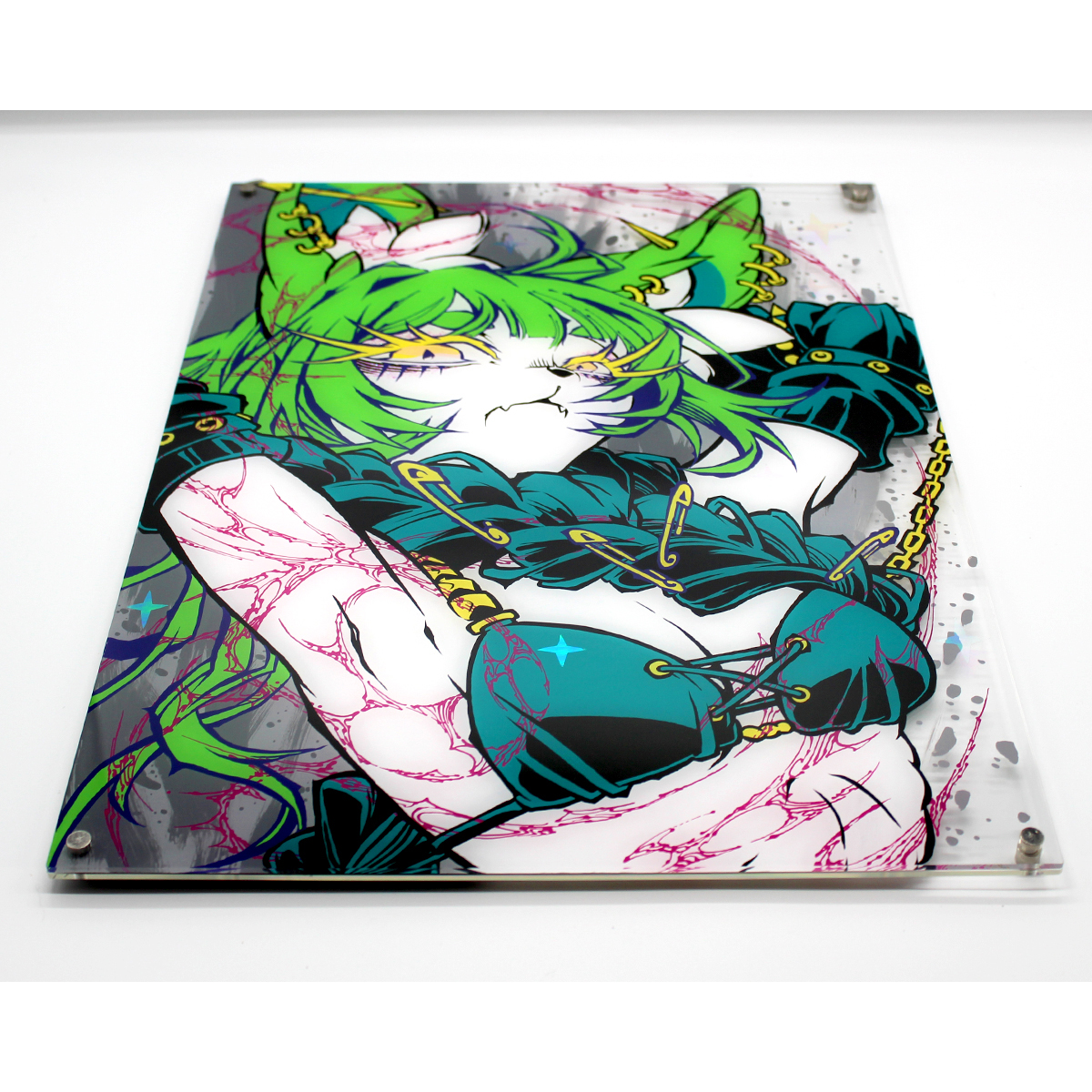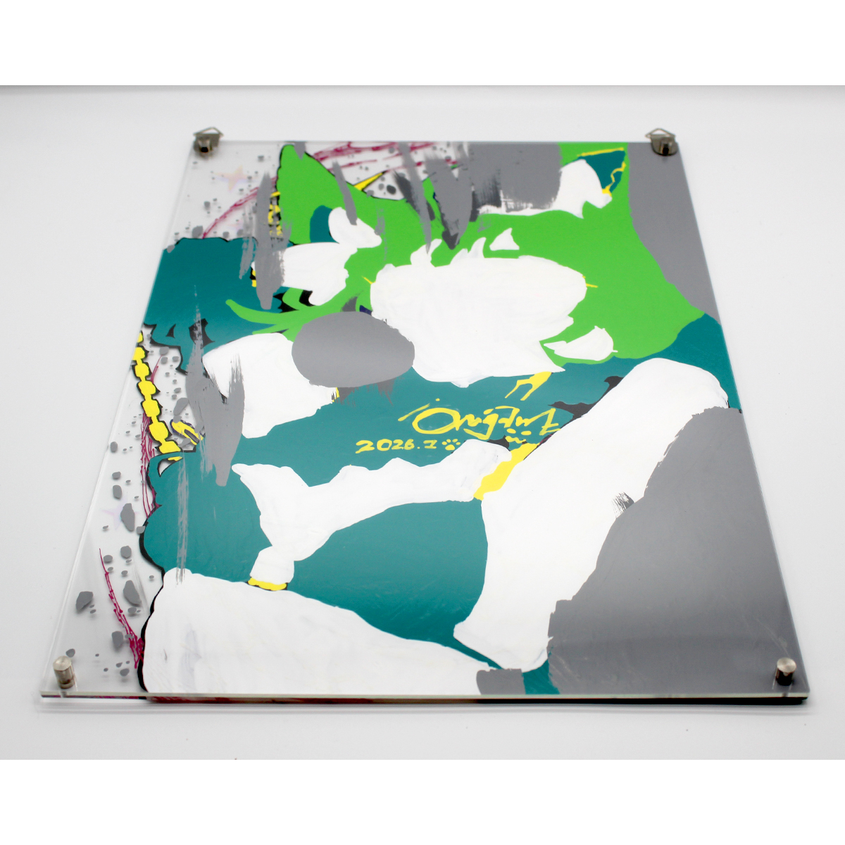 ▼ アクリル板を2枚重ねたアクリルガッシュ作品です。部分的にホログラムシートとグリッターを使用しているので角度によって見え方が変化します。
