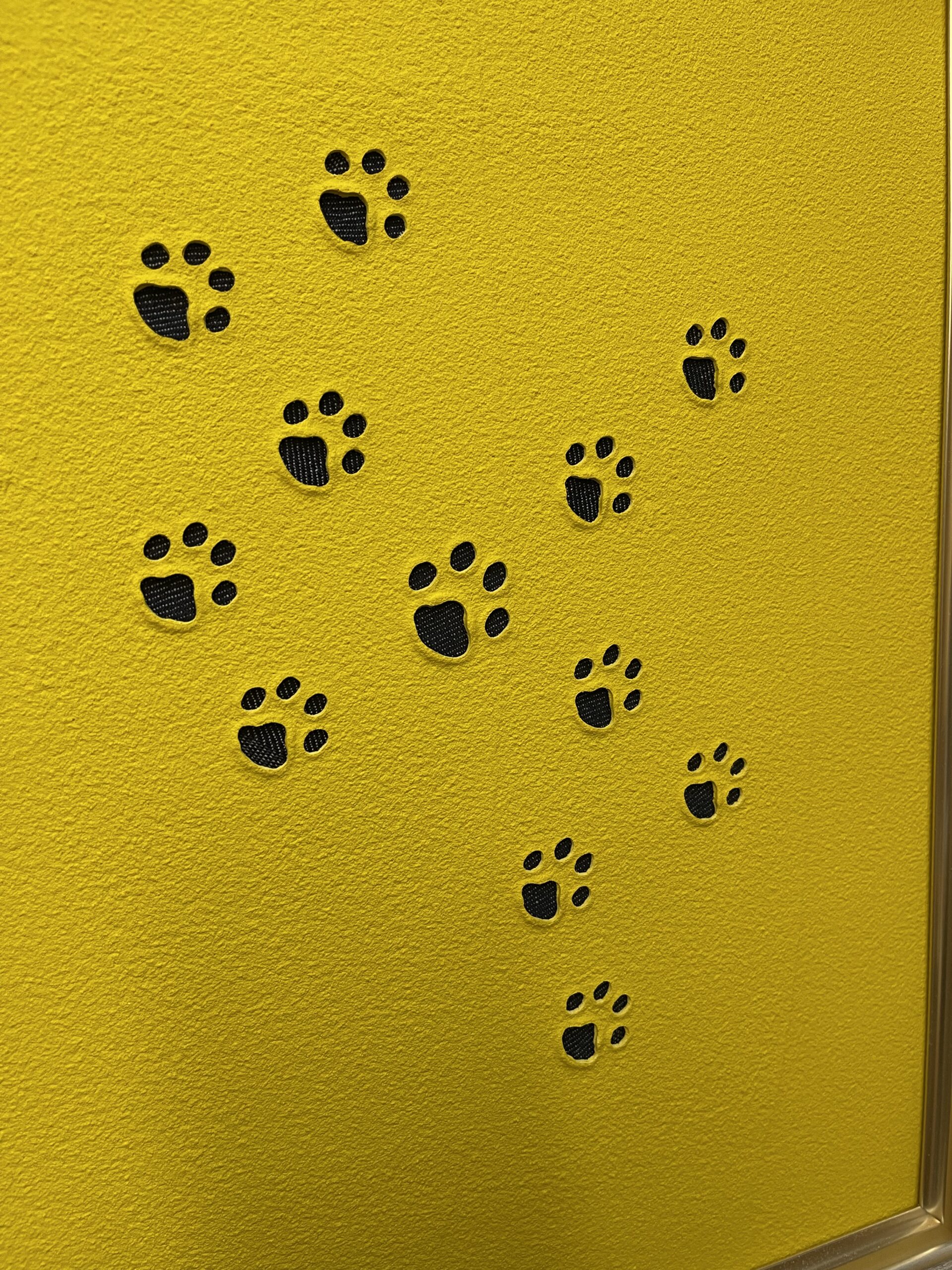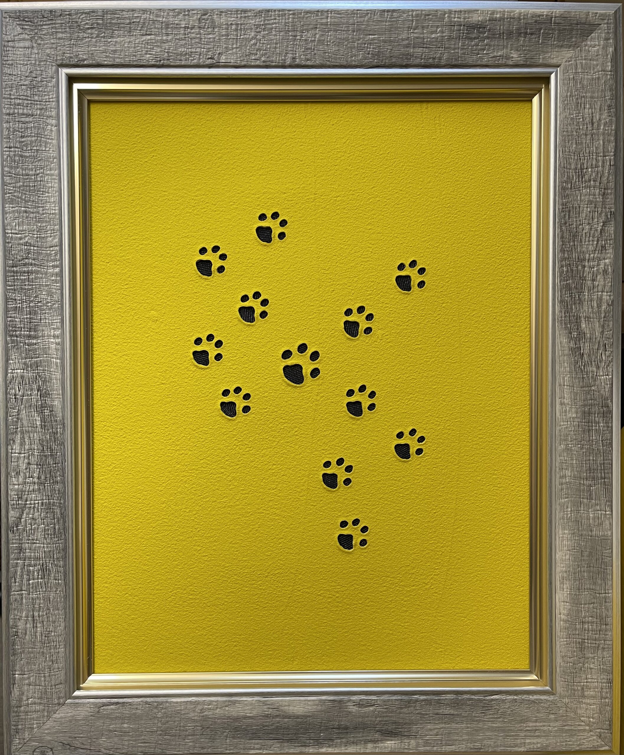 砂骨塗料をコテでベースを作り肉球の型取りをしてその後肉球部をくり抜き裏へデニムを貼ったアート作品。