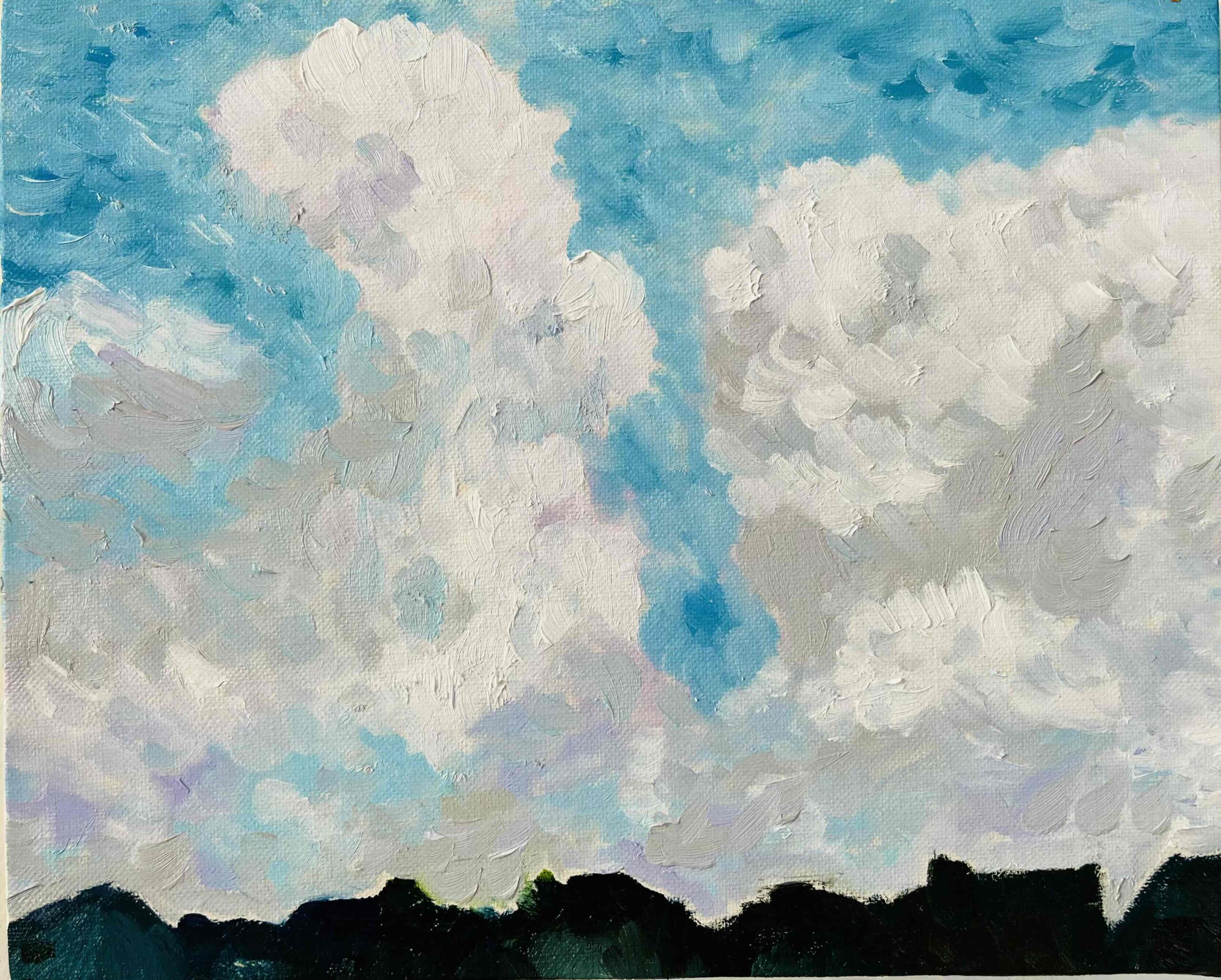油彩画 原画「民家とジャイアントクラウド」アート 絵画 22×27㎝ F3 キャンバス