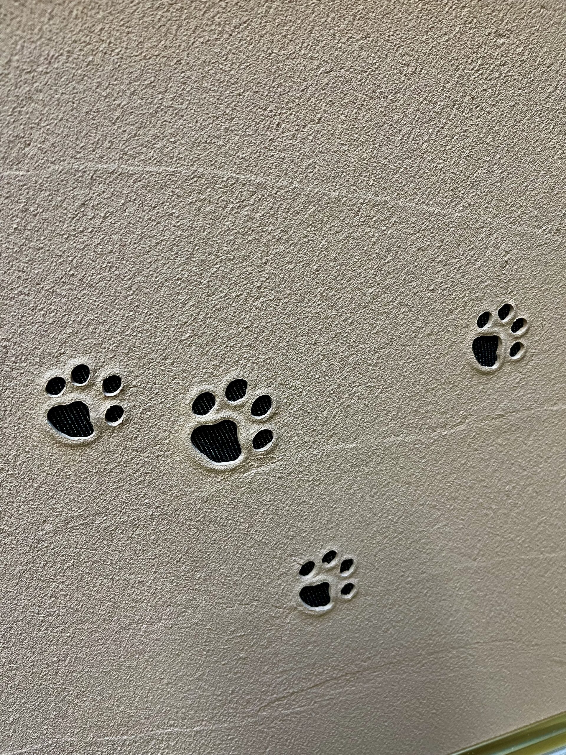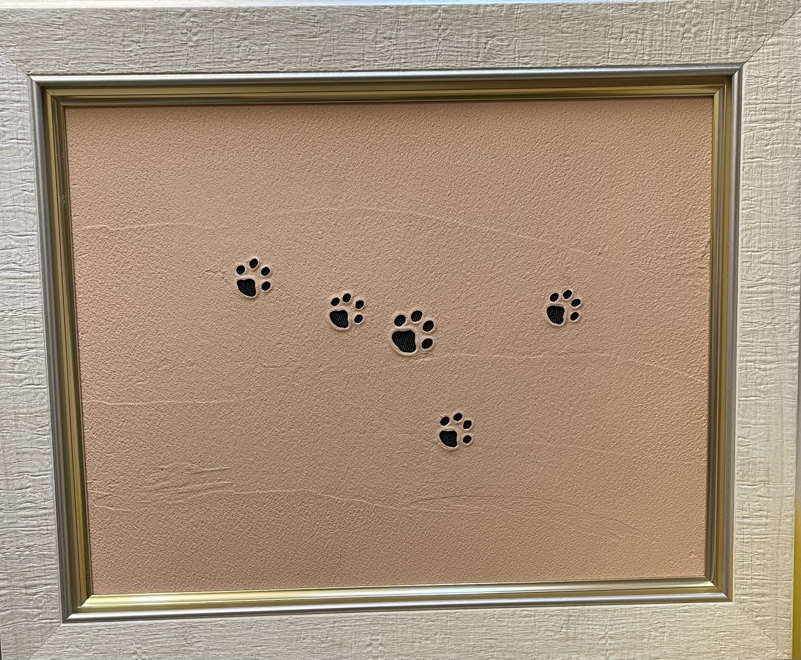 砂骨塗料をコテでベースを作り肉球の型取りをしてその後肉球部をくり抜き裏へデニムを貼ったアート作品。
