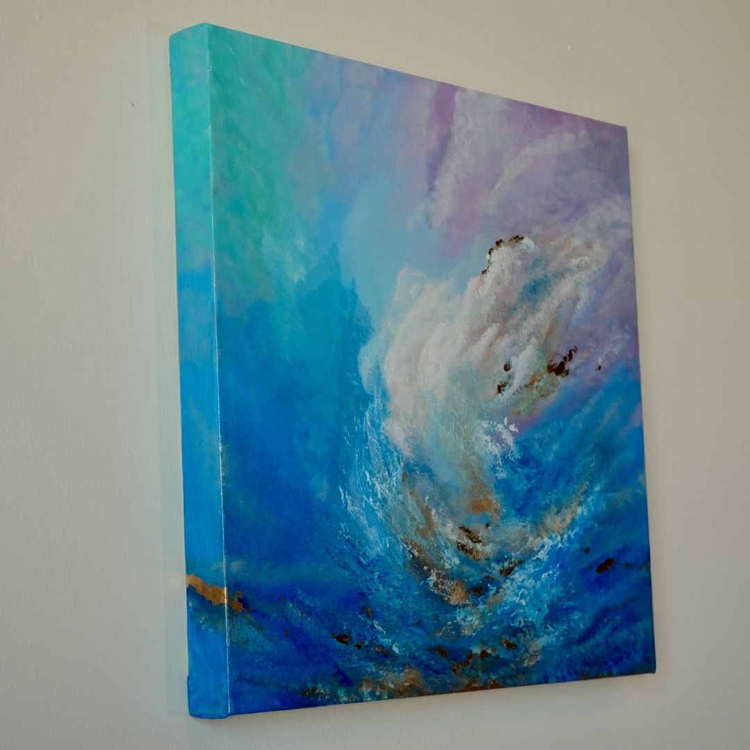 この抽象的な雲の作品では、光や空気が一瞬一瞬で変わっていく感覚を表現しています。アクリルを重ねてつくったやわらかな空に、ところどころ加えた金箔が光を受け、動きの中にある「ふとした瞬間」を思わせます。見る人が少し立ち止まって、深呼吸し、気持ちをゆるめられるような空間を意識しています。