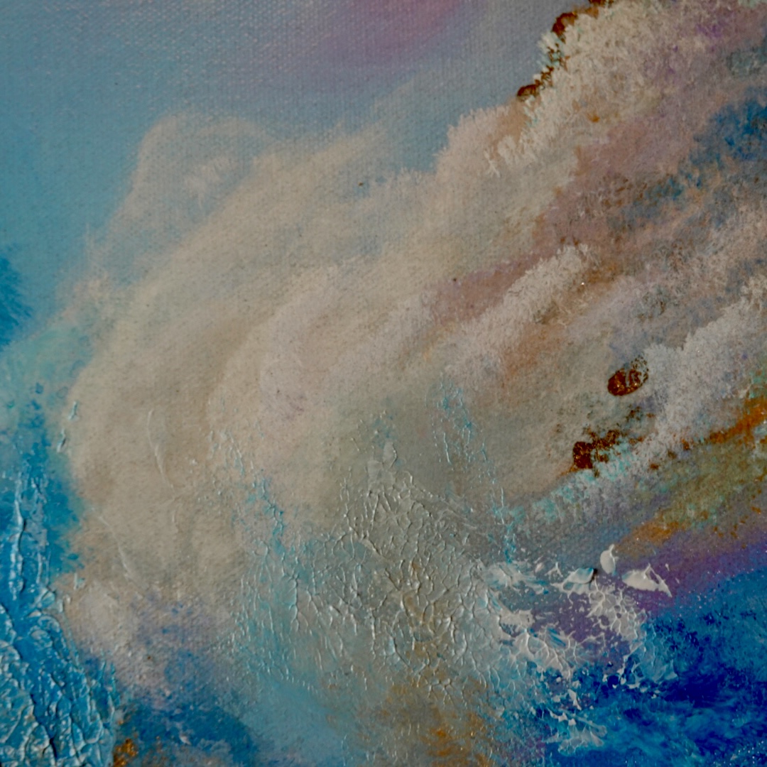 空に浮かぶ記憶のワンシーンのように、流れ続ける雲を描いた作品です。軽やかで光をまとった雲が、やさしいブルーの中に溶け込み、金箔が霧の間から差し込む光のようにきらりと輝きます。静けさや希望、そしてさりげない変化の美しさを感じてもらえる作品です。